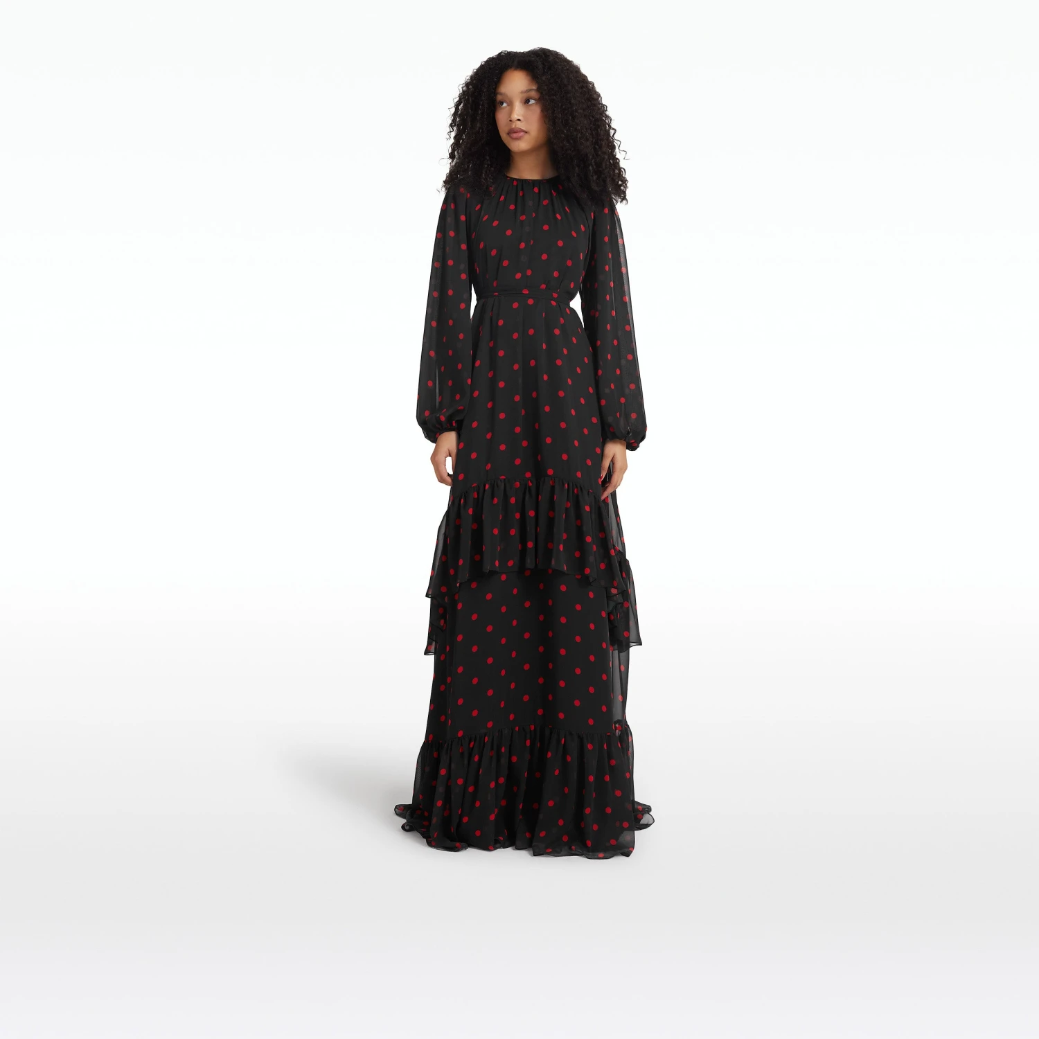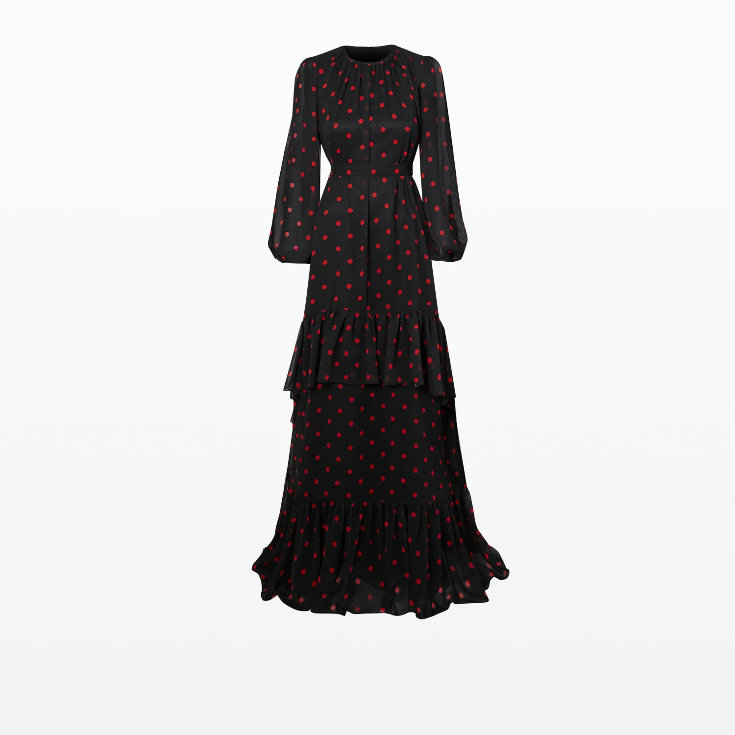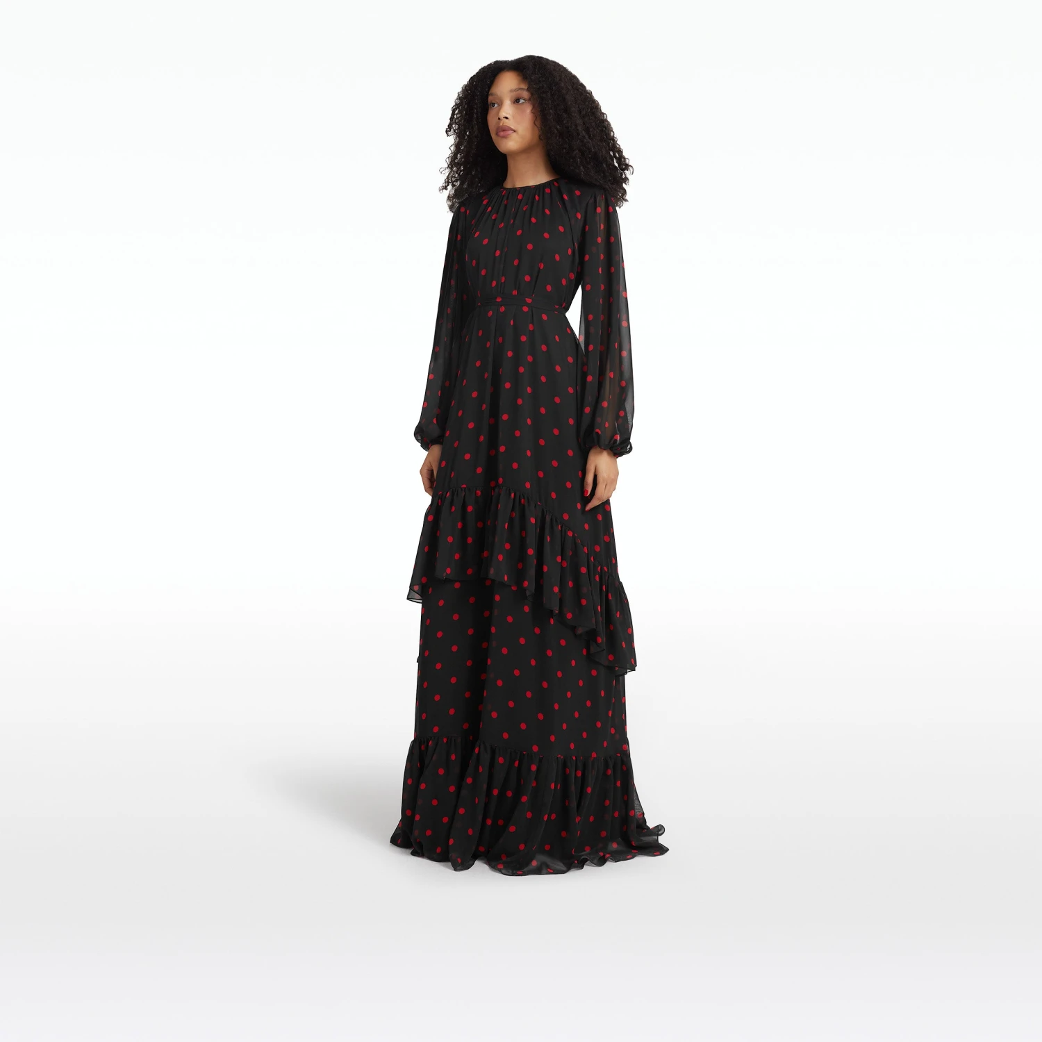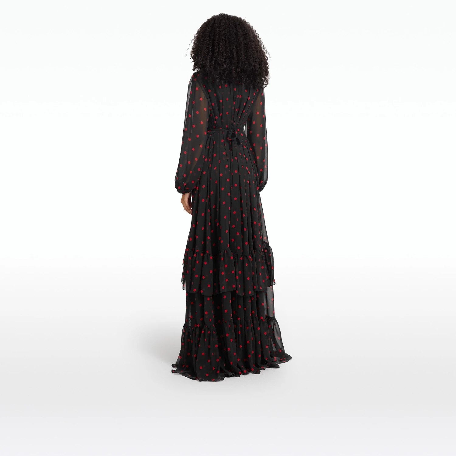 Bishop sleeve, A line with gown with ruffle in black/ lacquer red Polka Chiffon.