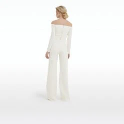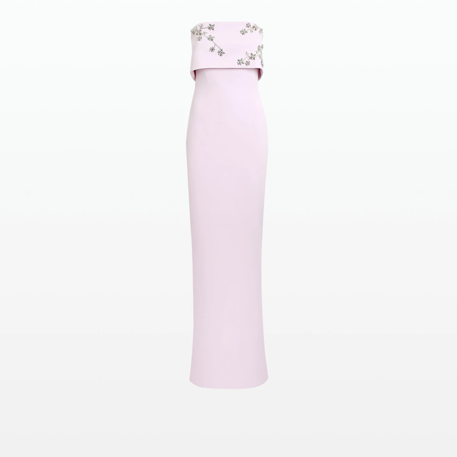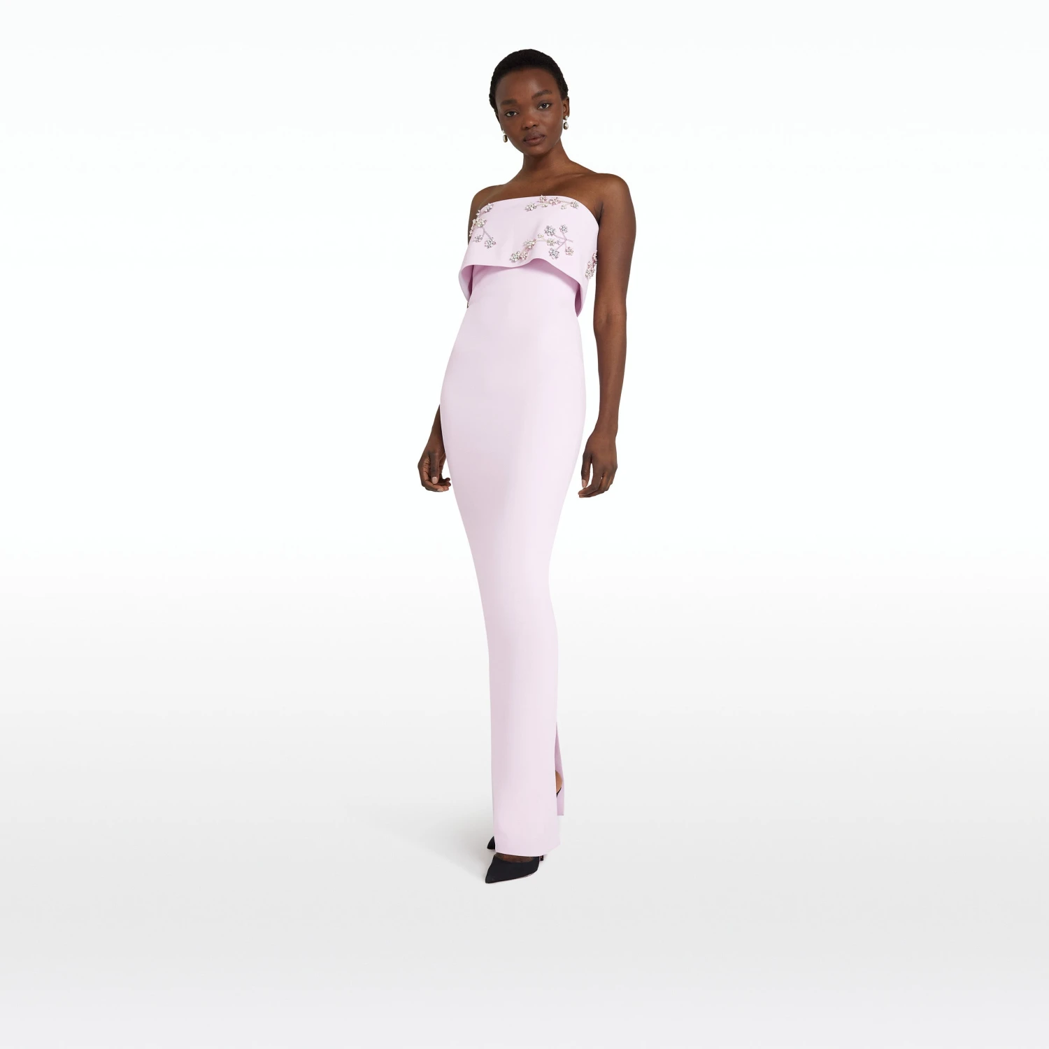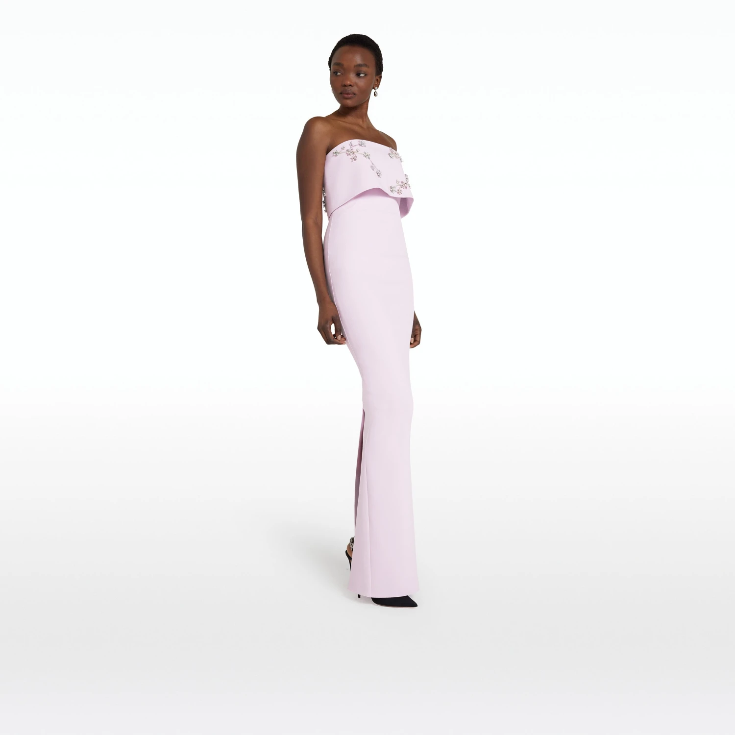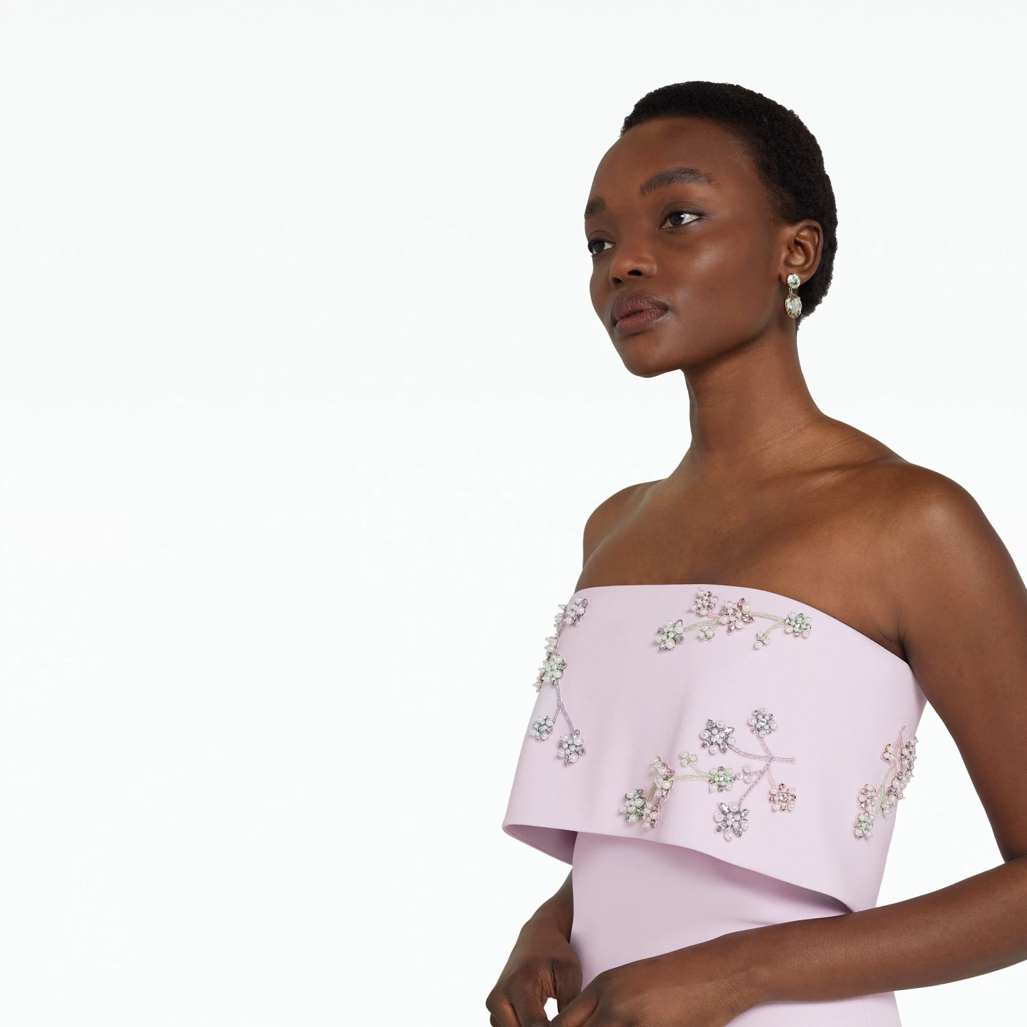 Floor length column gown with layover bustier detail in lilac snow with multi-colour Glass Flower embroidery.
