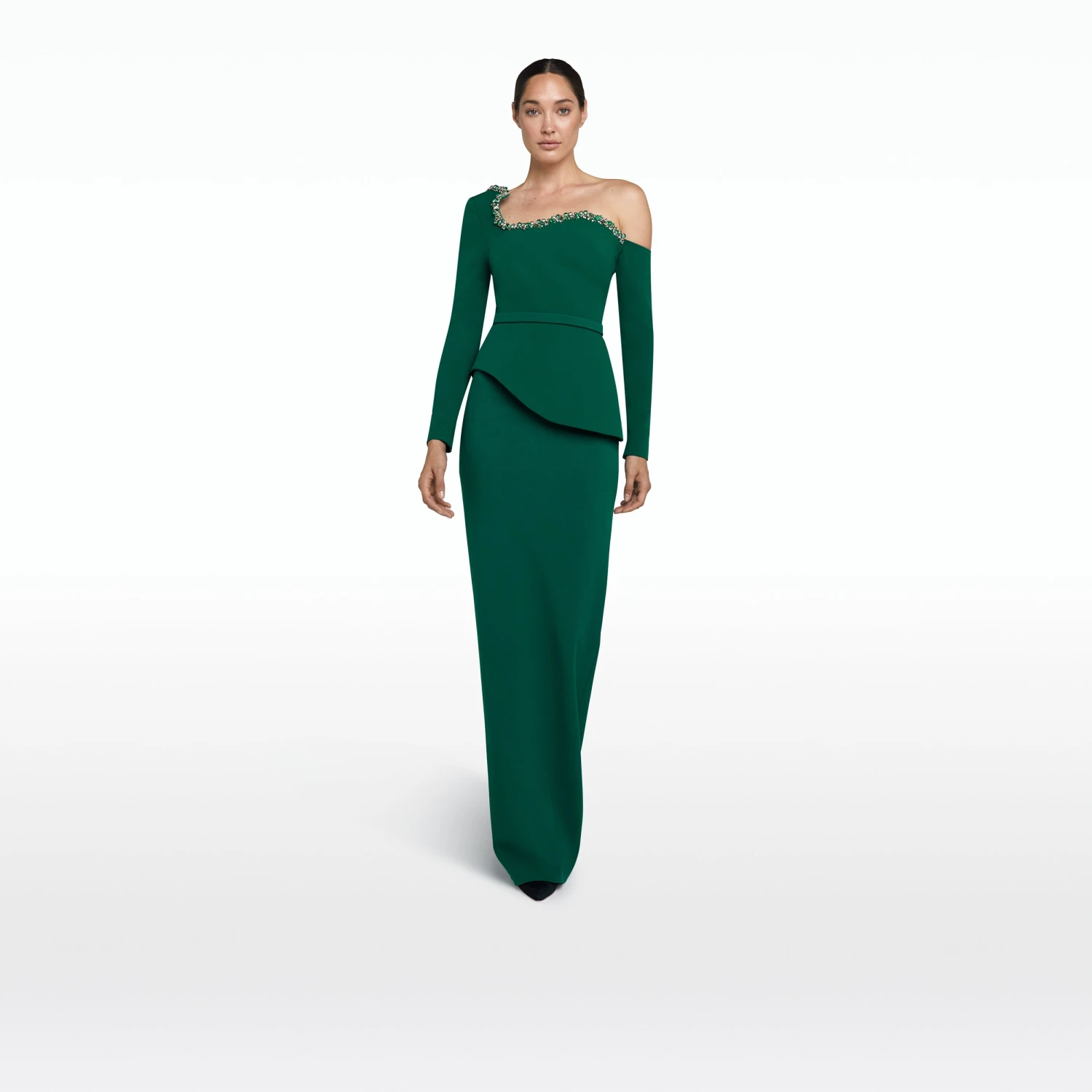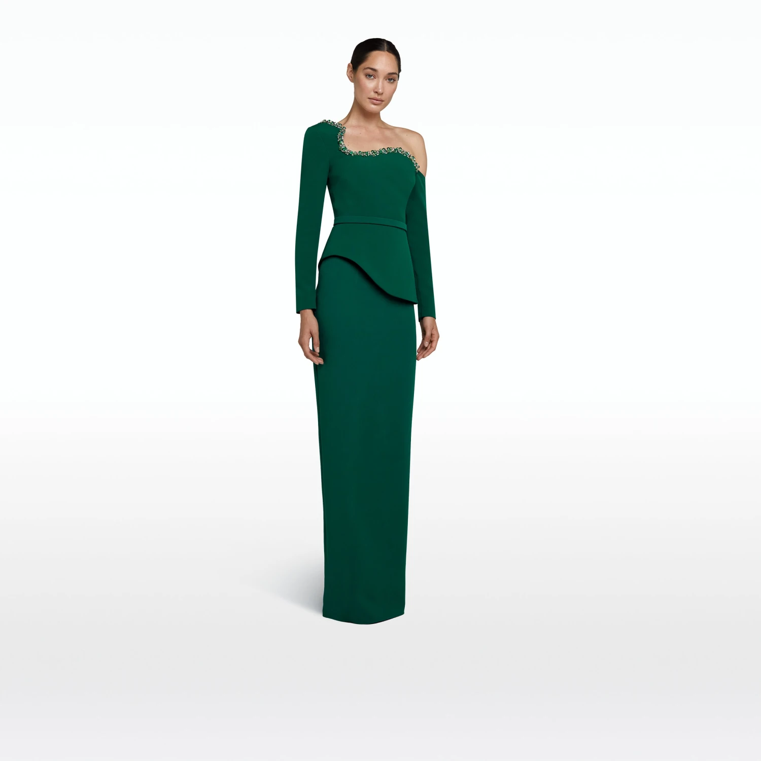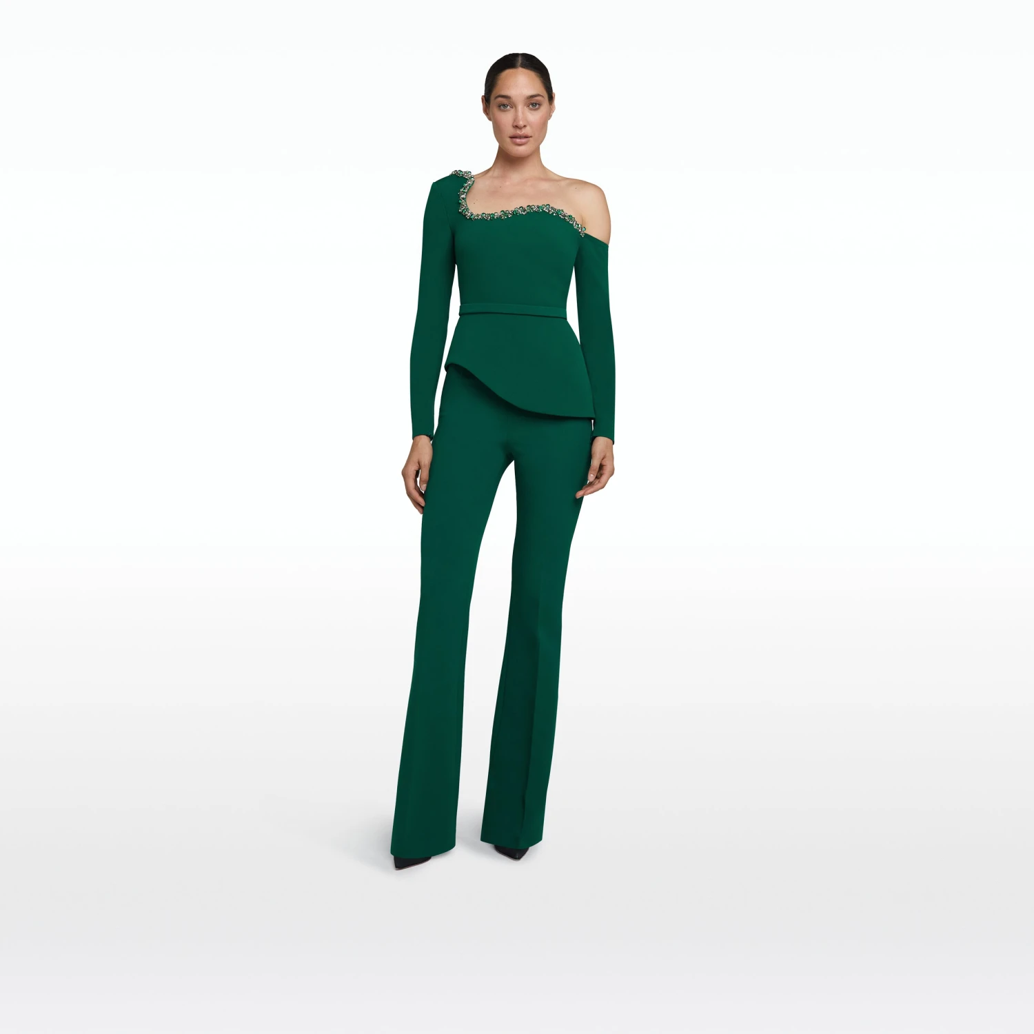 Long sleeved top with asymmetric neckline and peplum in botanic with multi-botanics Crystal Trim embroidery.