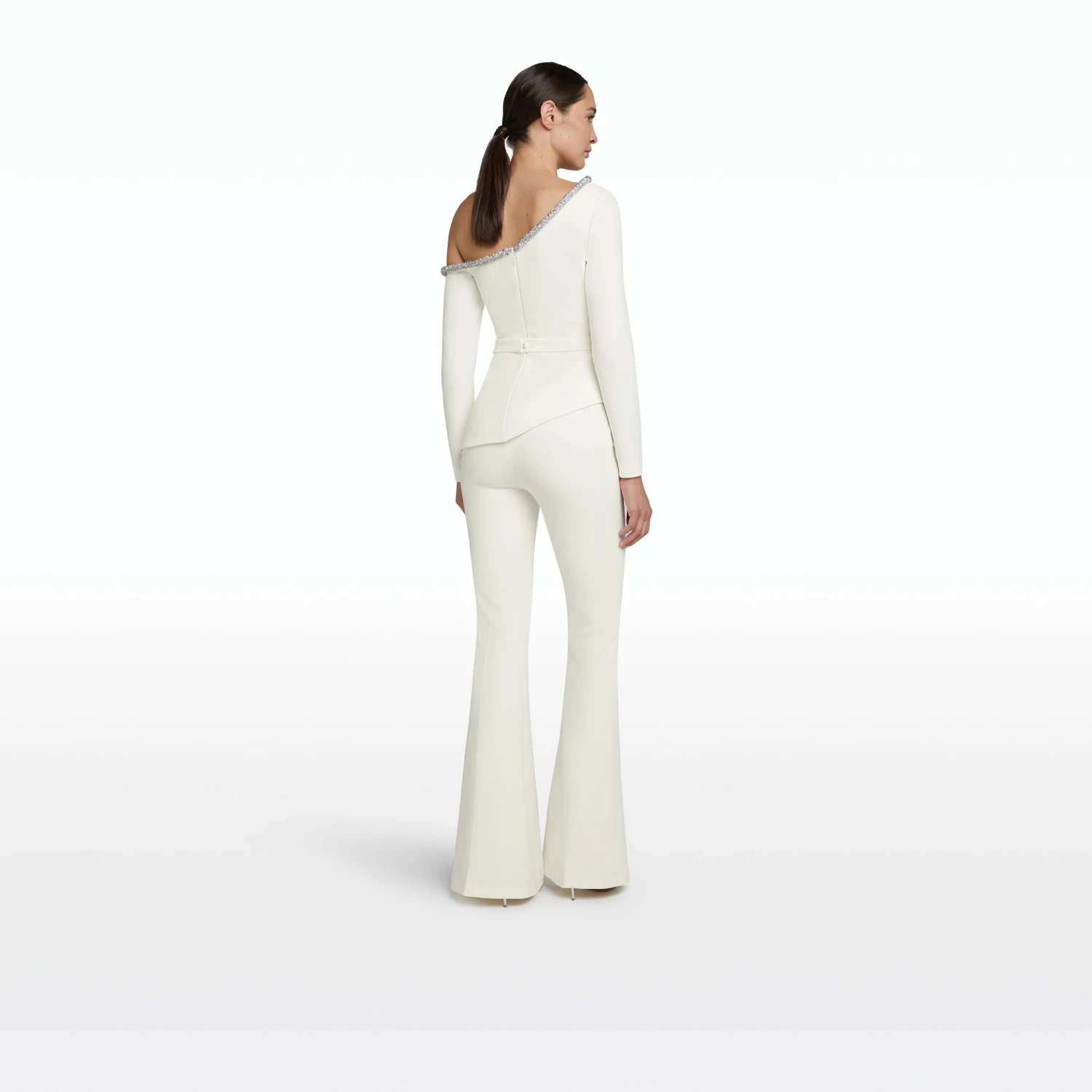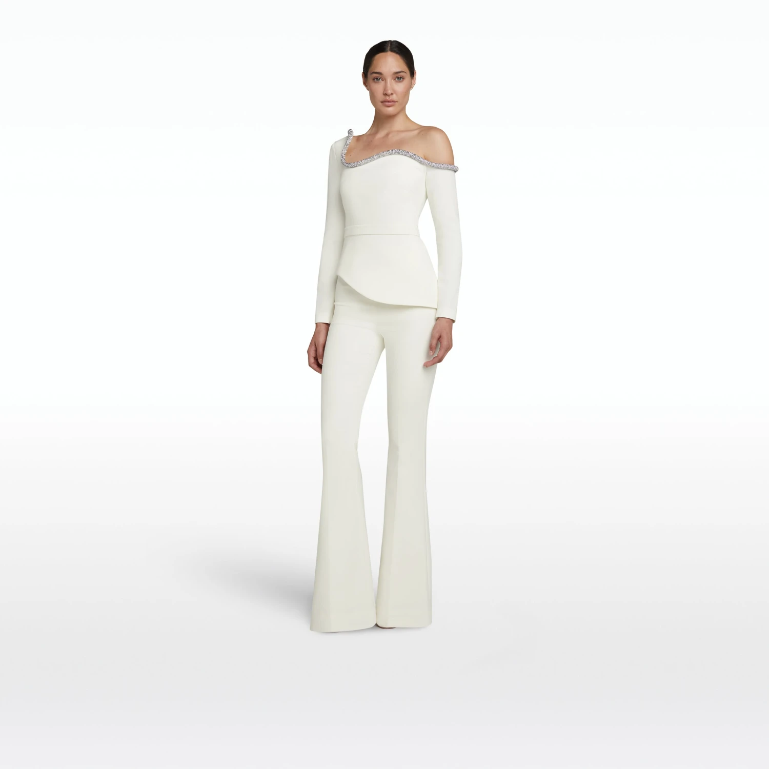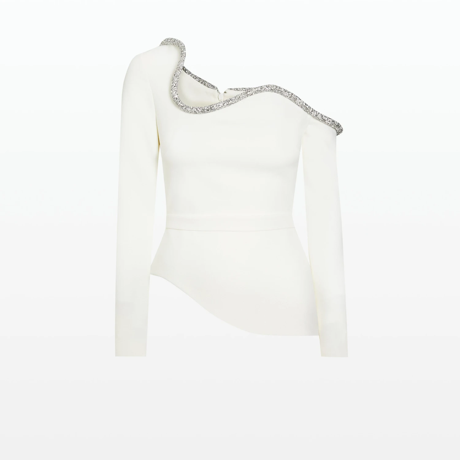Long sleeved top with asymmetric neckline and peplum in ivory with Crystal Cord embroidery.