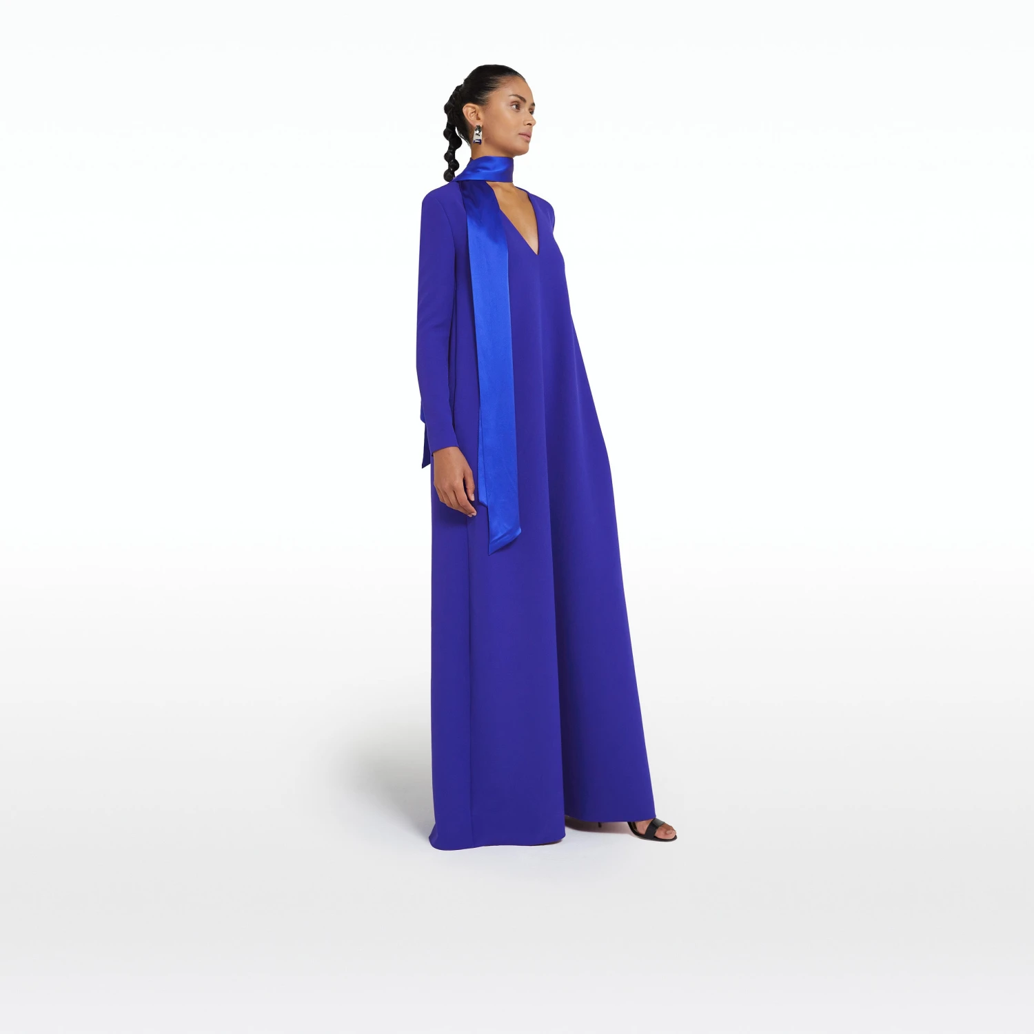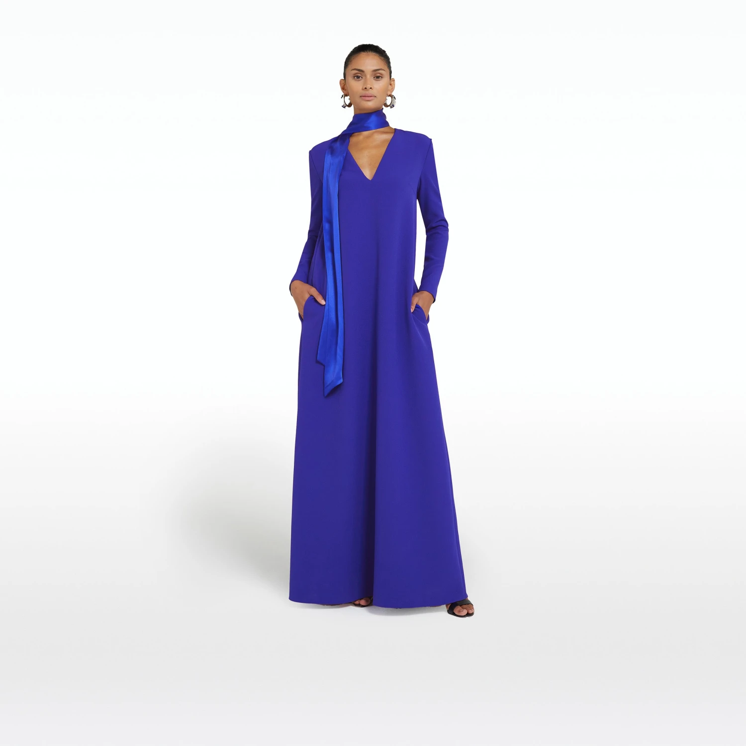 Long sleeve, V-neck, A-shaped long dress with removable shawl collar detail in azure blue.