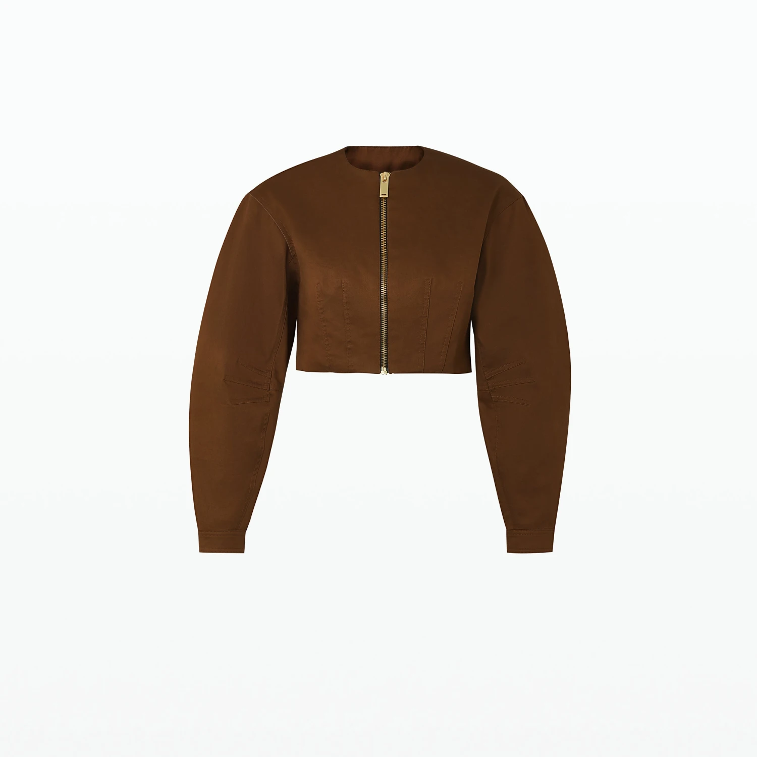 Cropped, bomber style jacket with seam detailing in deep brown Trenching.