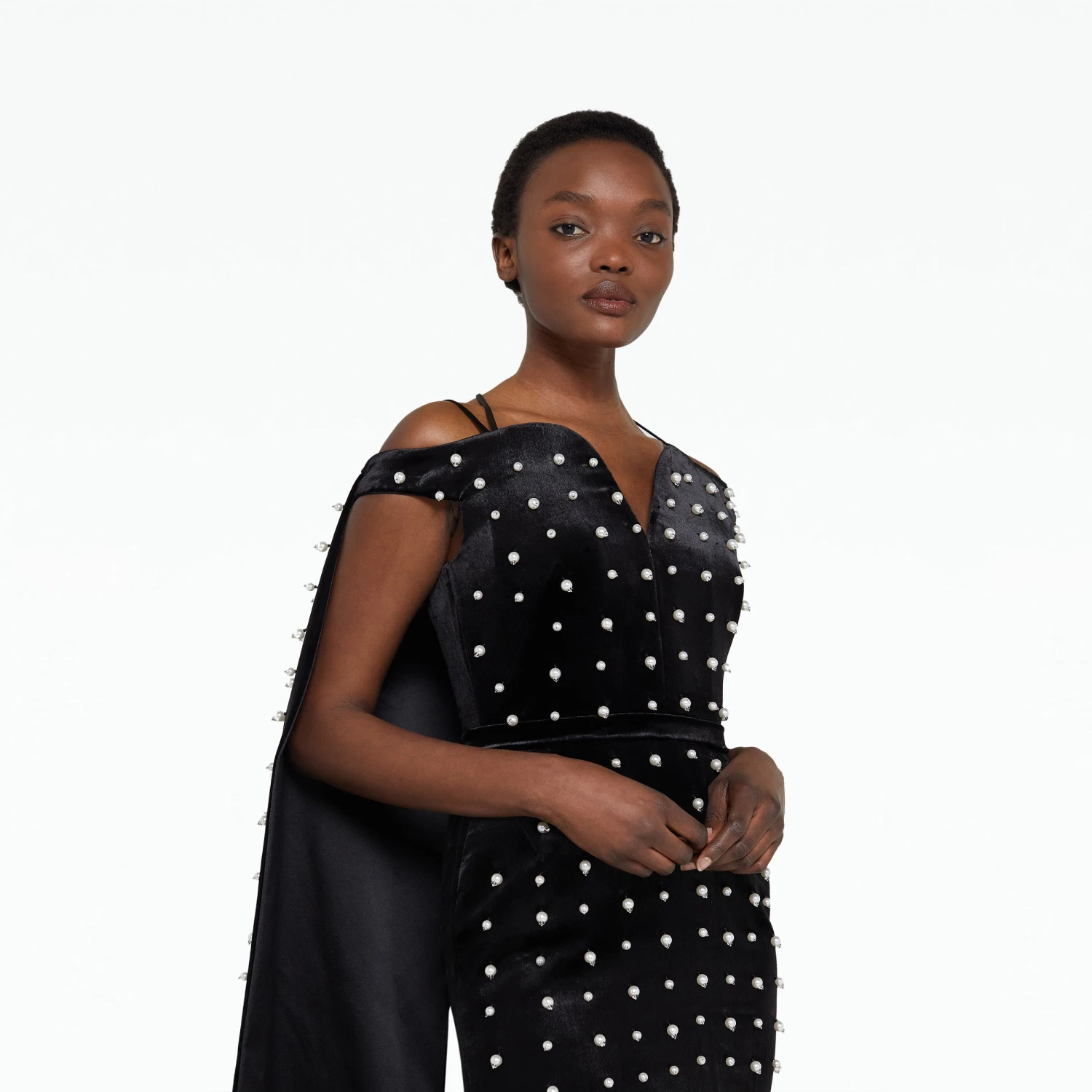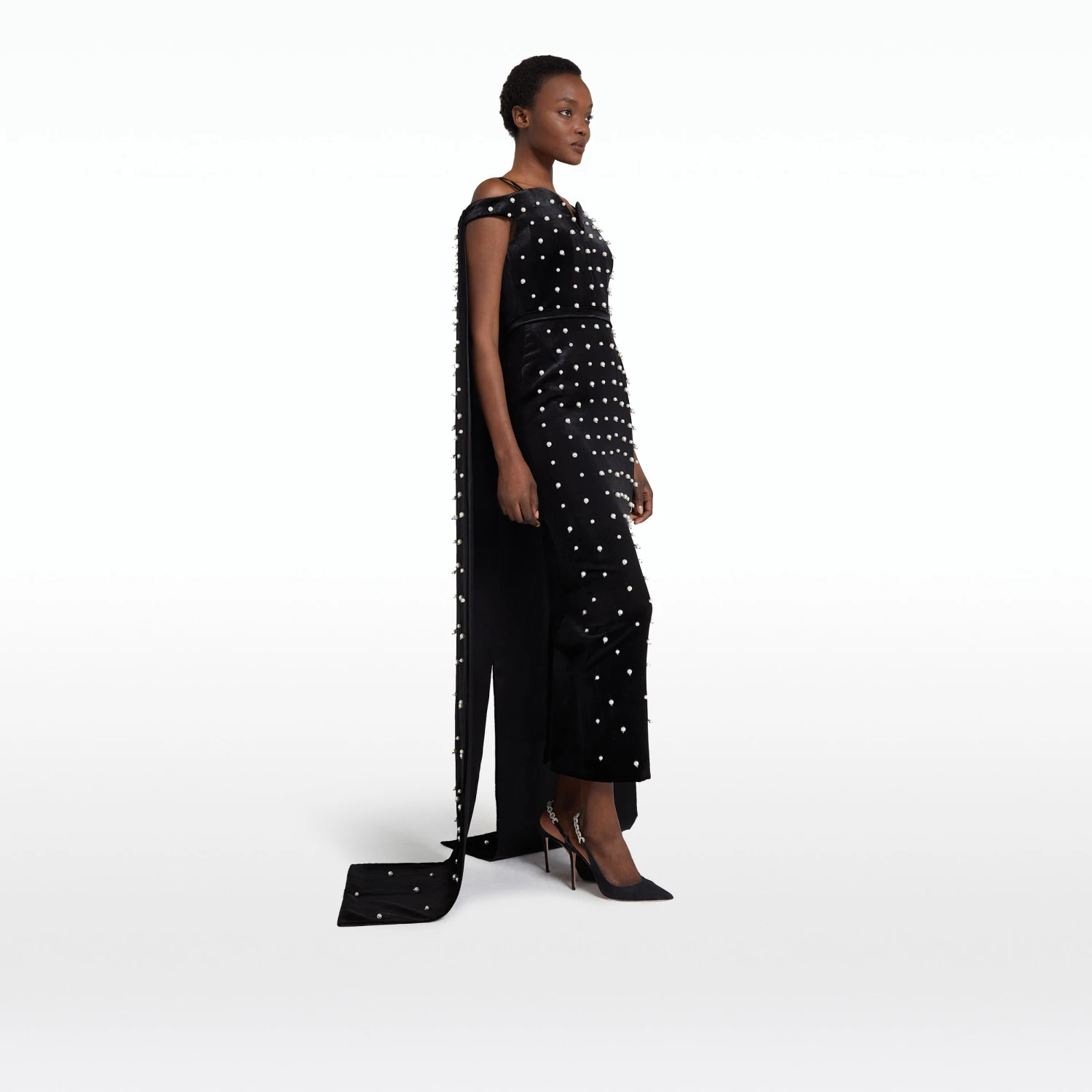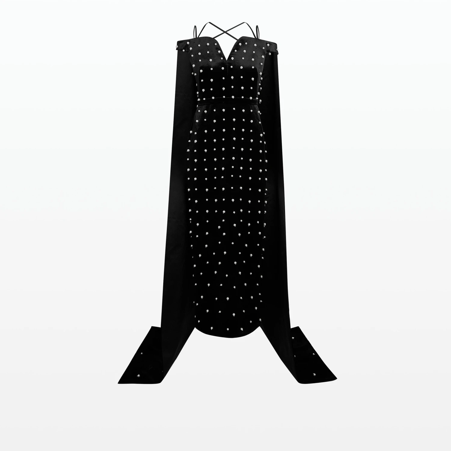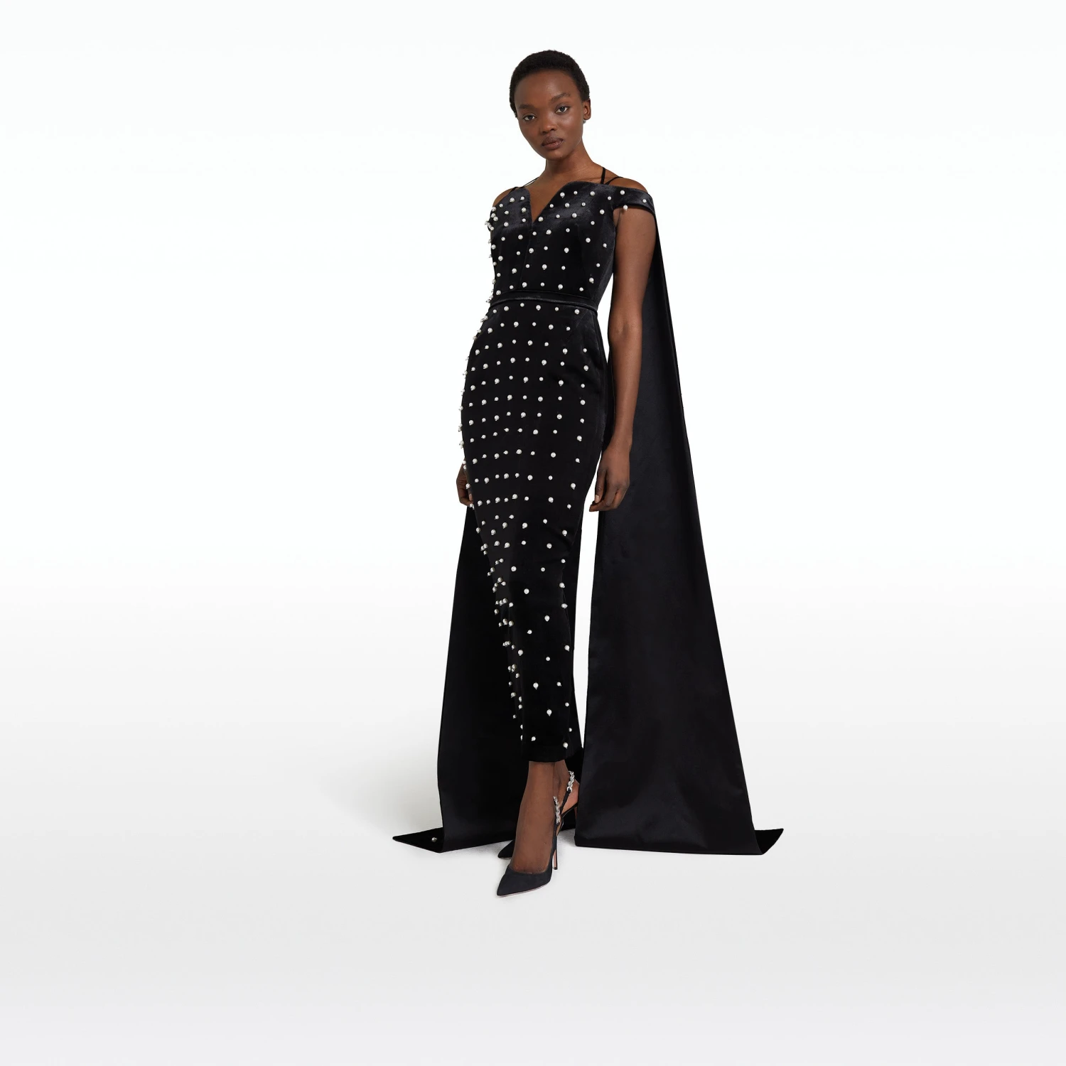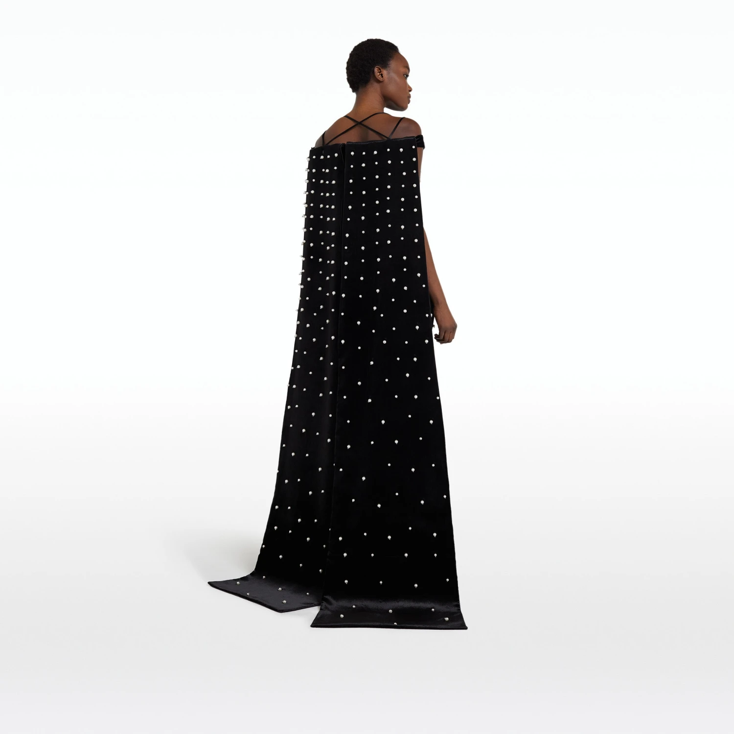Ankle length, fitted dress with sculptured neckline and floor length back cape in black Silk Velvet and Duchess Silk with Pearl Drop embroidery.