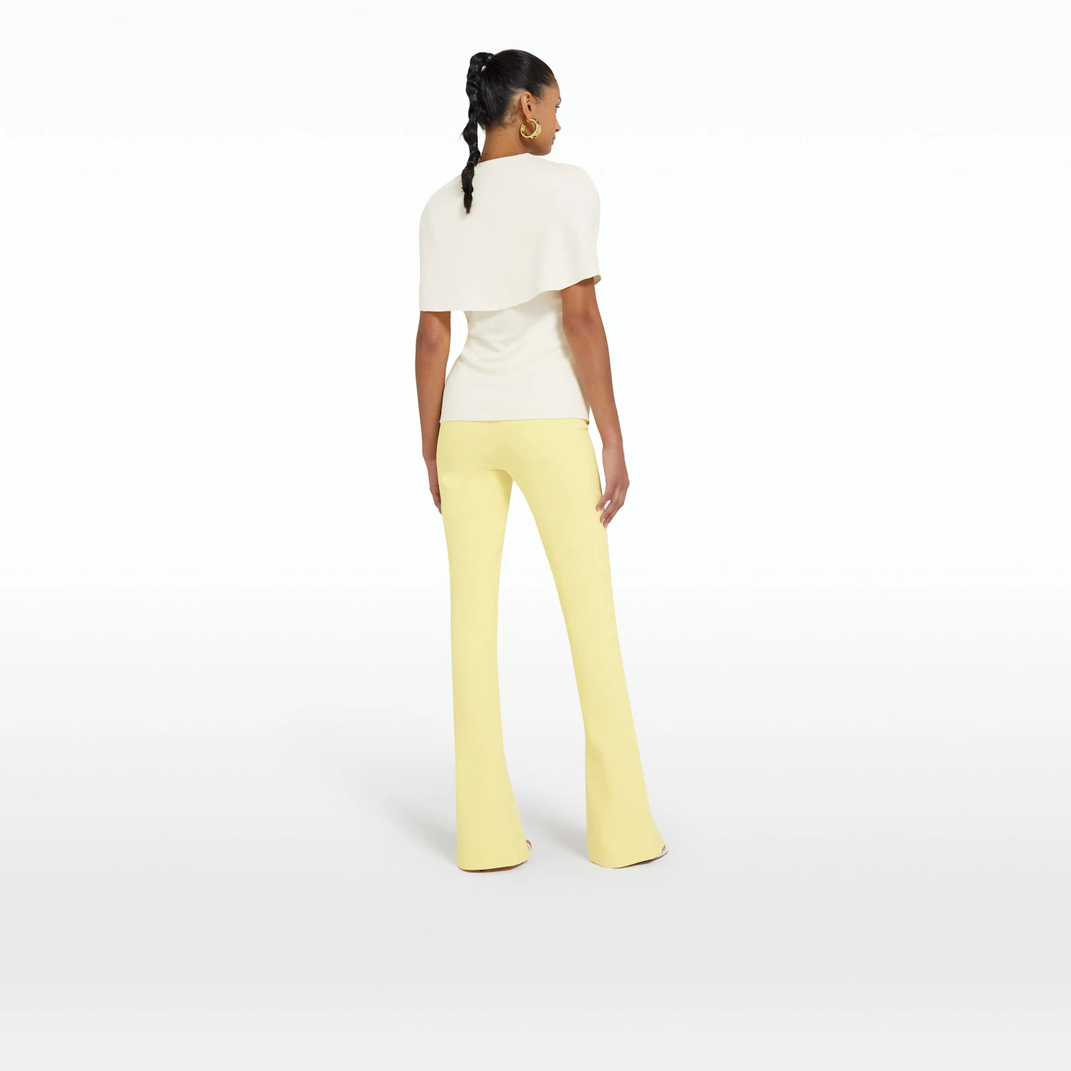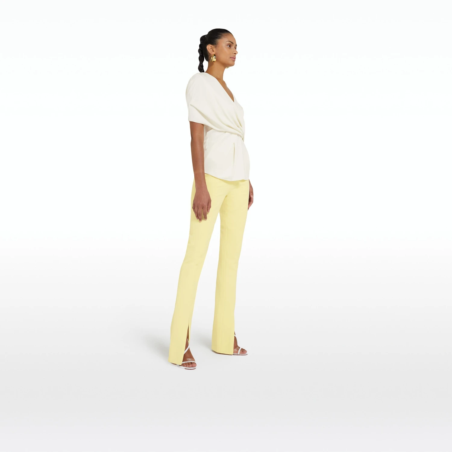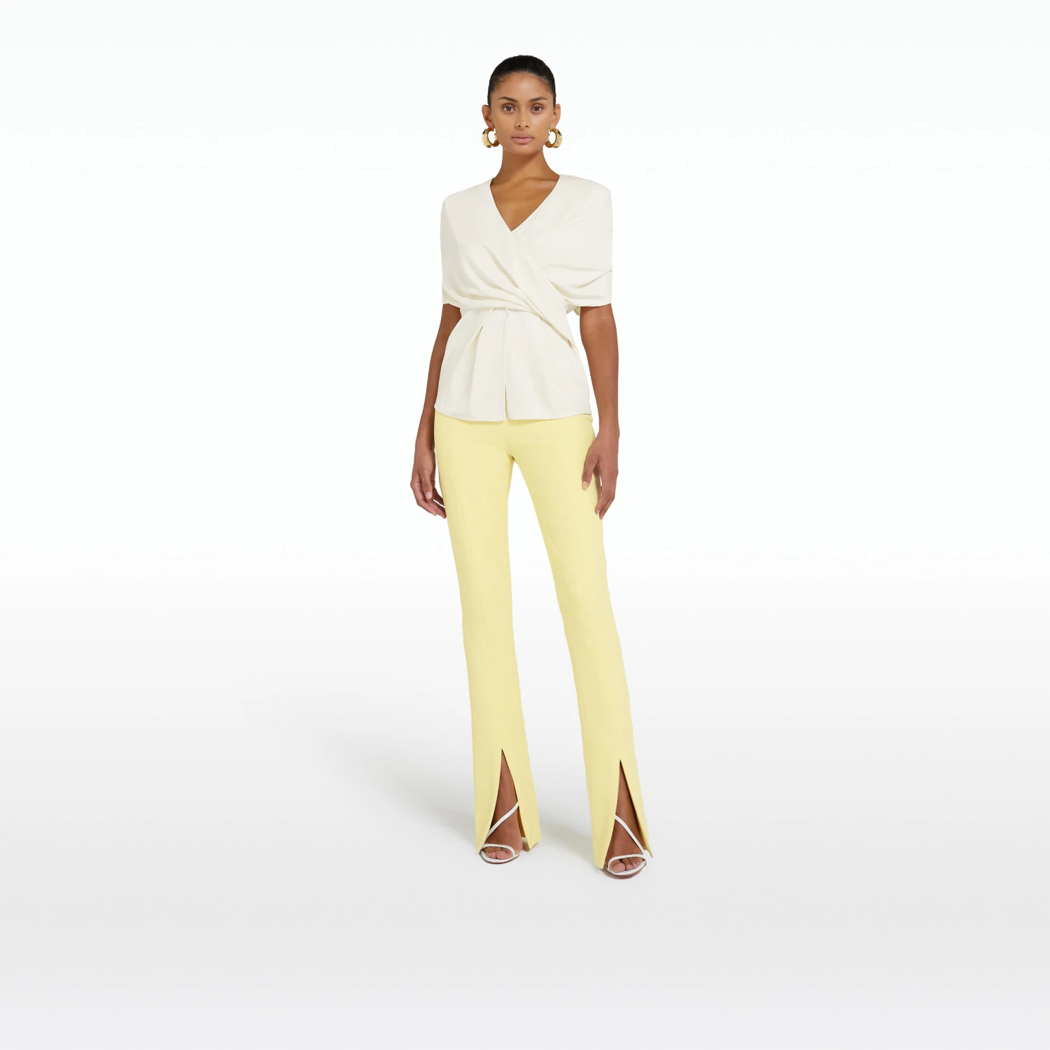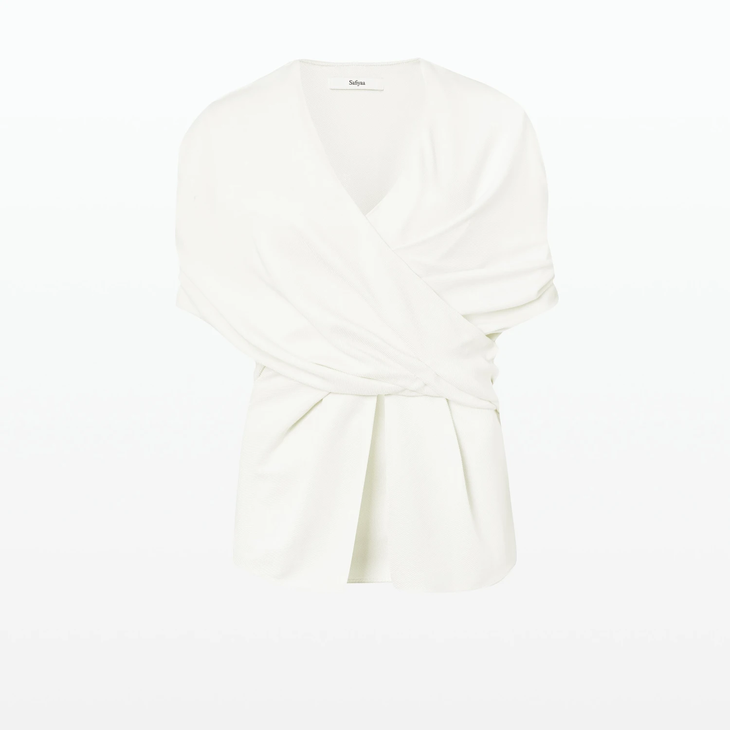 V neck, pleated wrap top with pleat drape peplum in ivory.