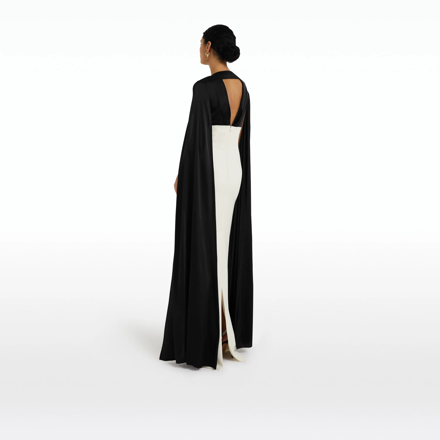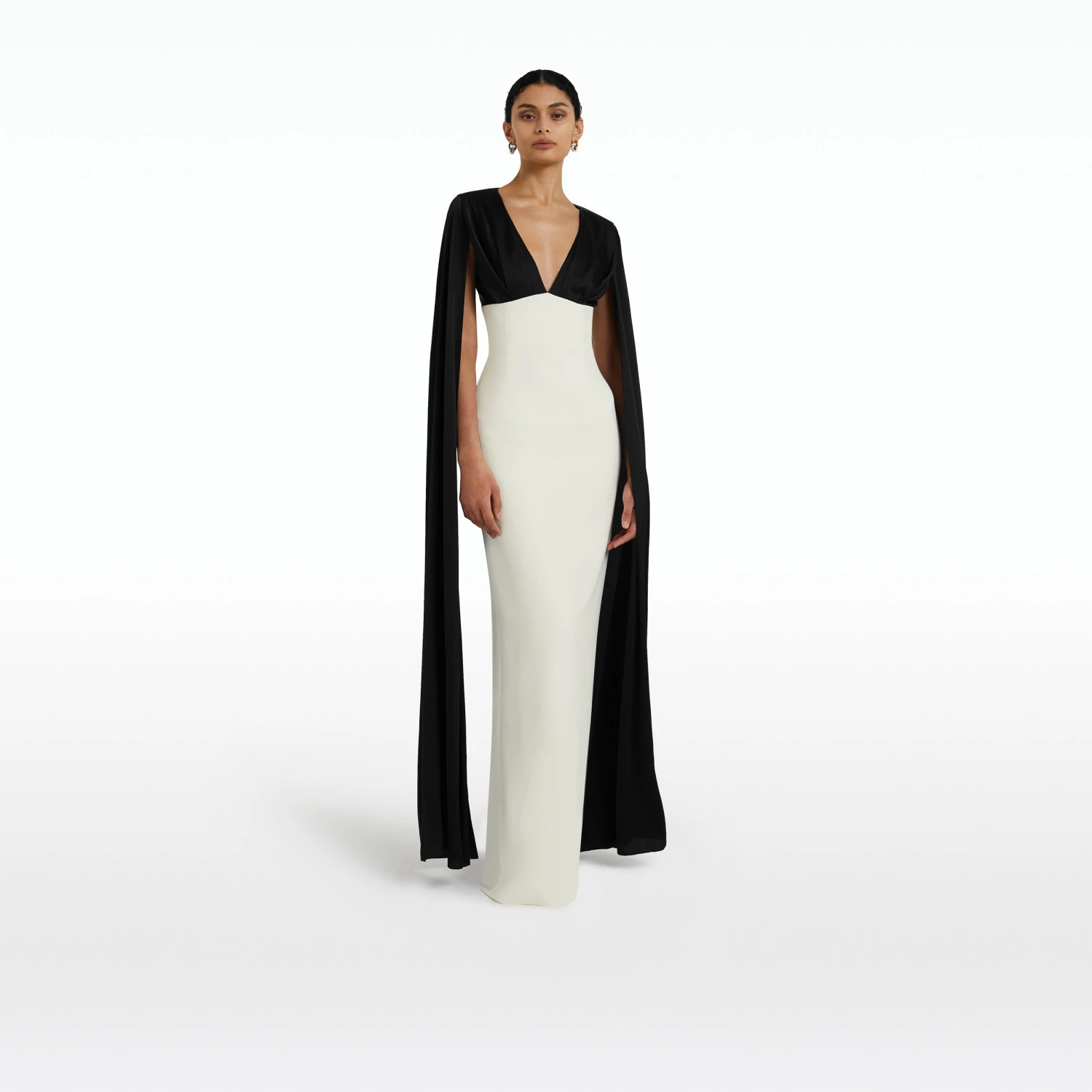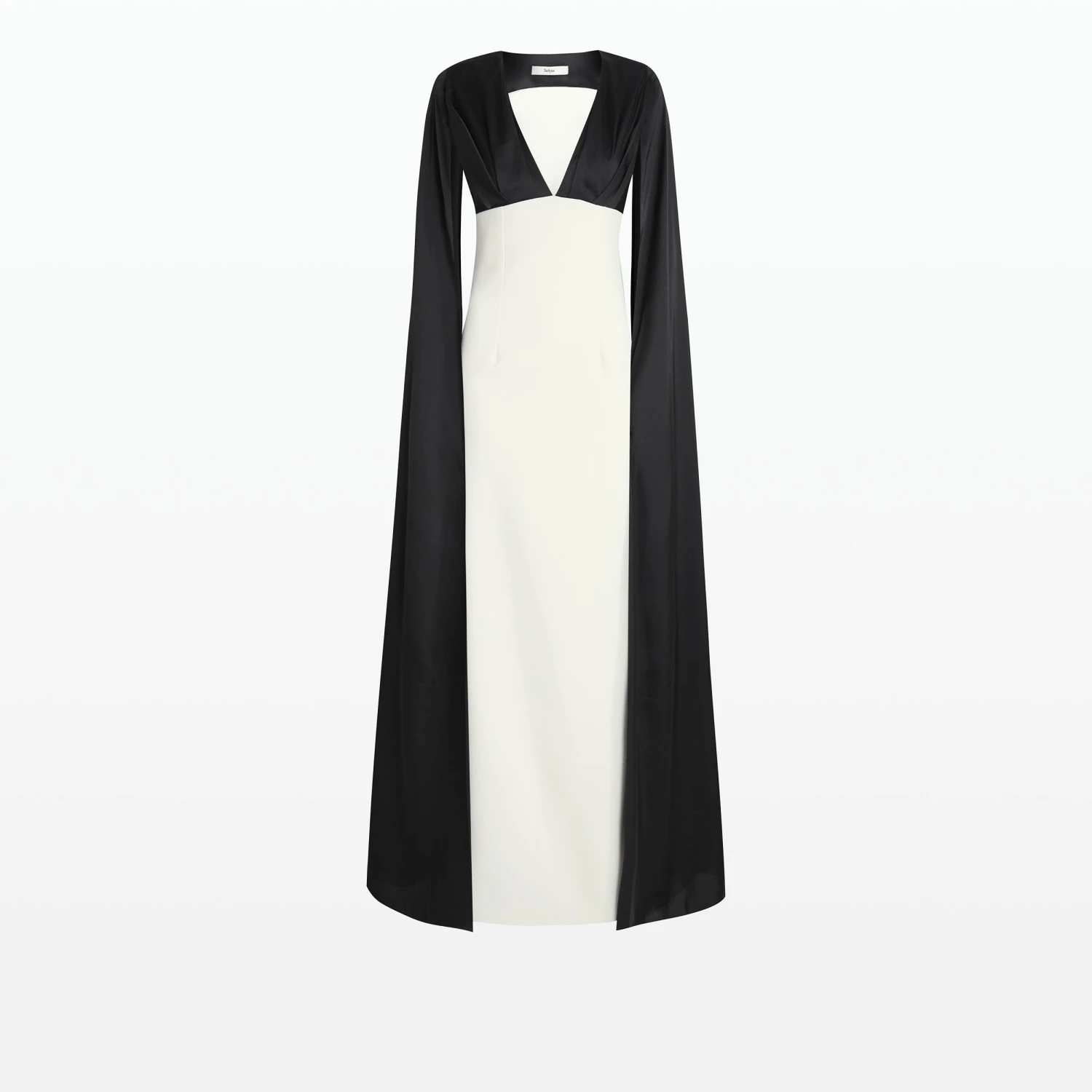 Draped V neck long dress with long caped sleeves and V-shape back in ivory and black.
