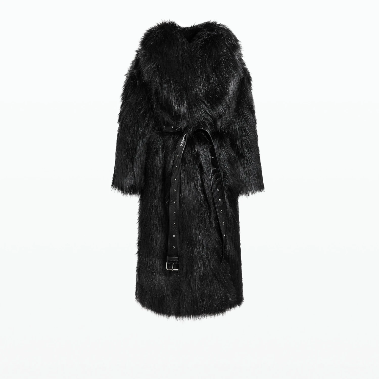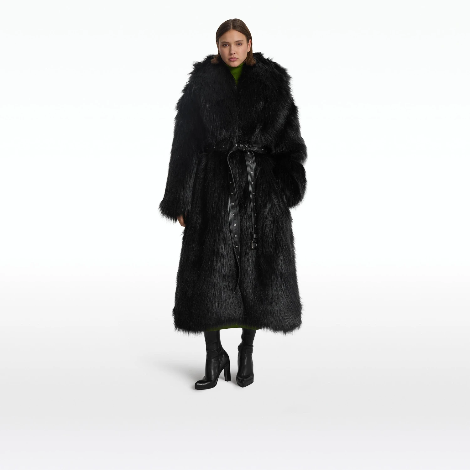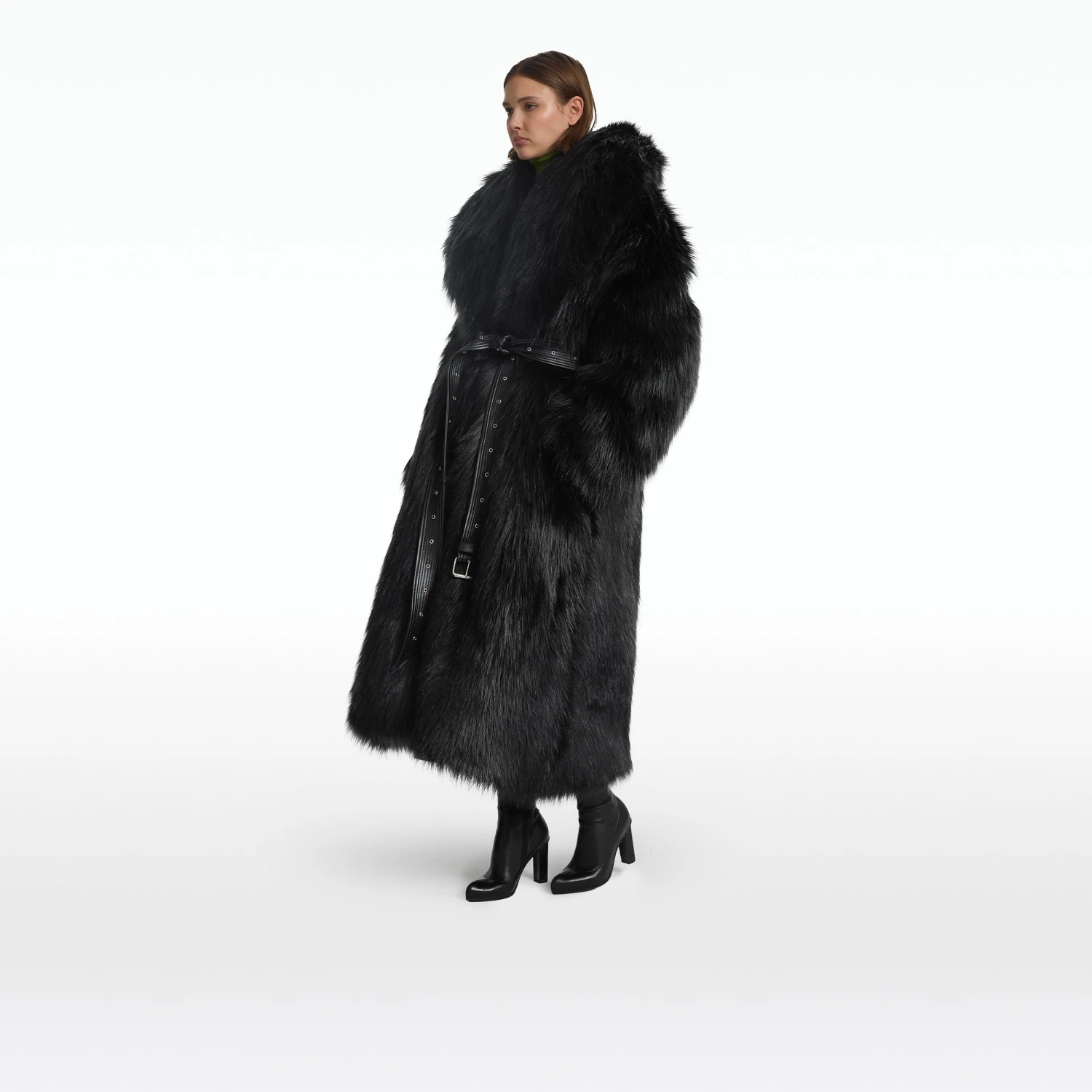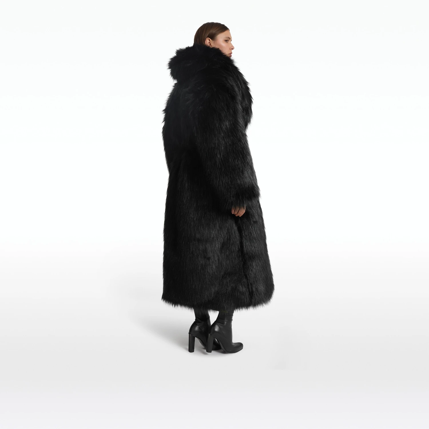 Statement, shawl collared, faux fur coat in black Faux Fox.