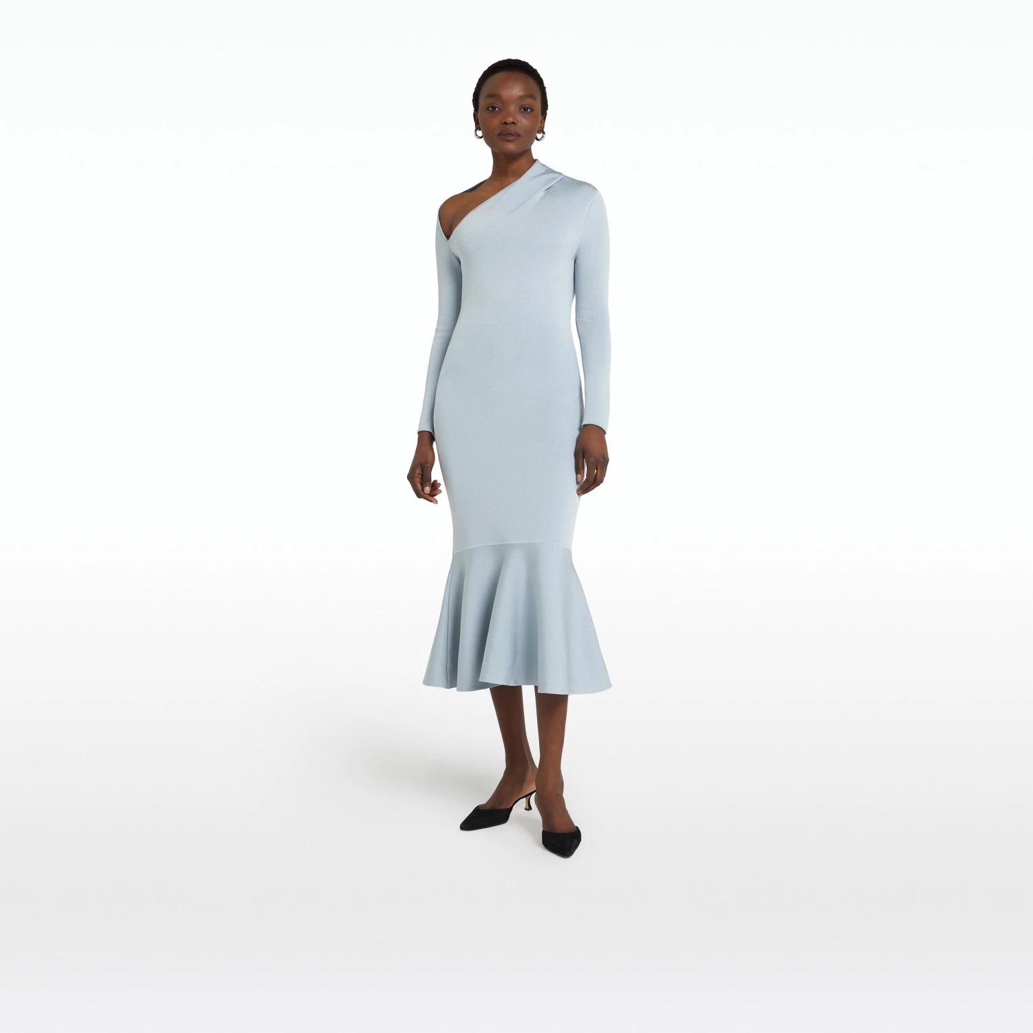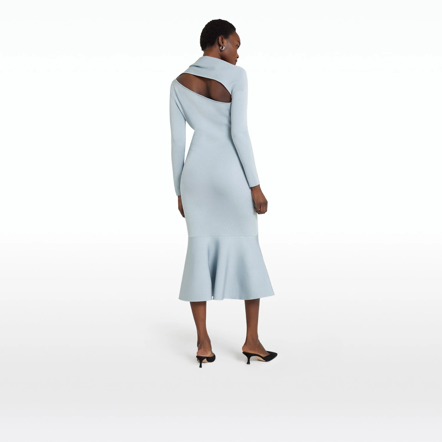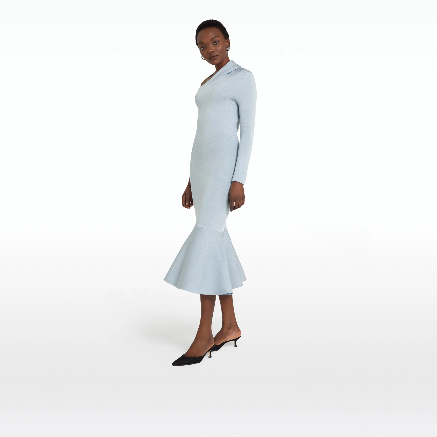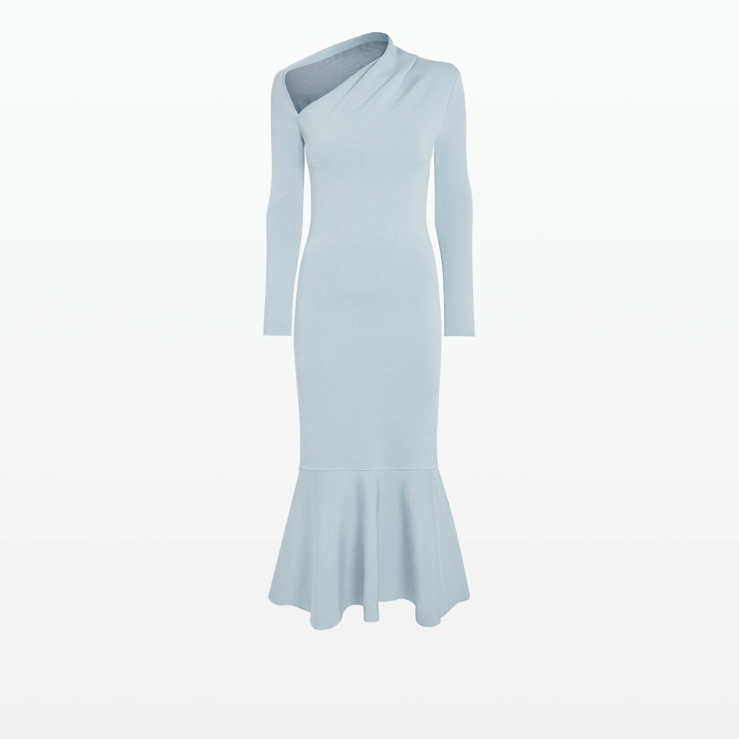 Midi knit dress with kick back flare skirt, long sleeves and asymmetric cutout neckline in brunnera.
