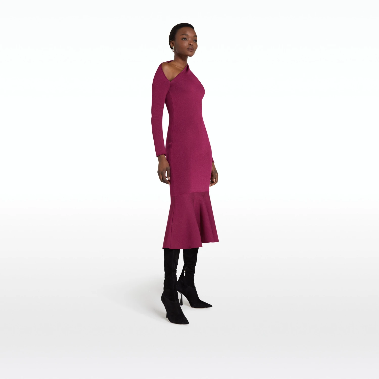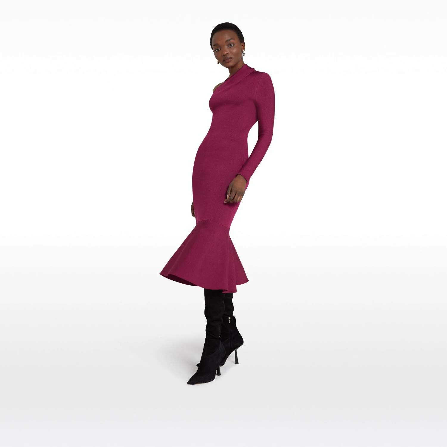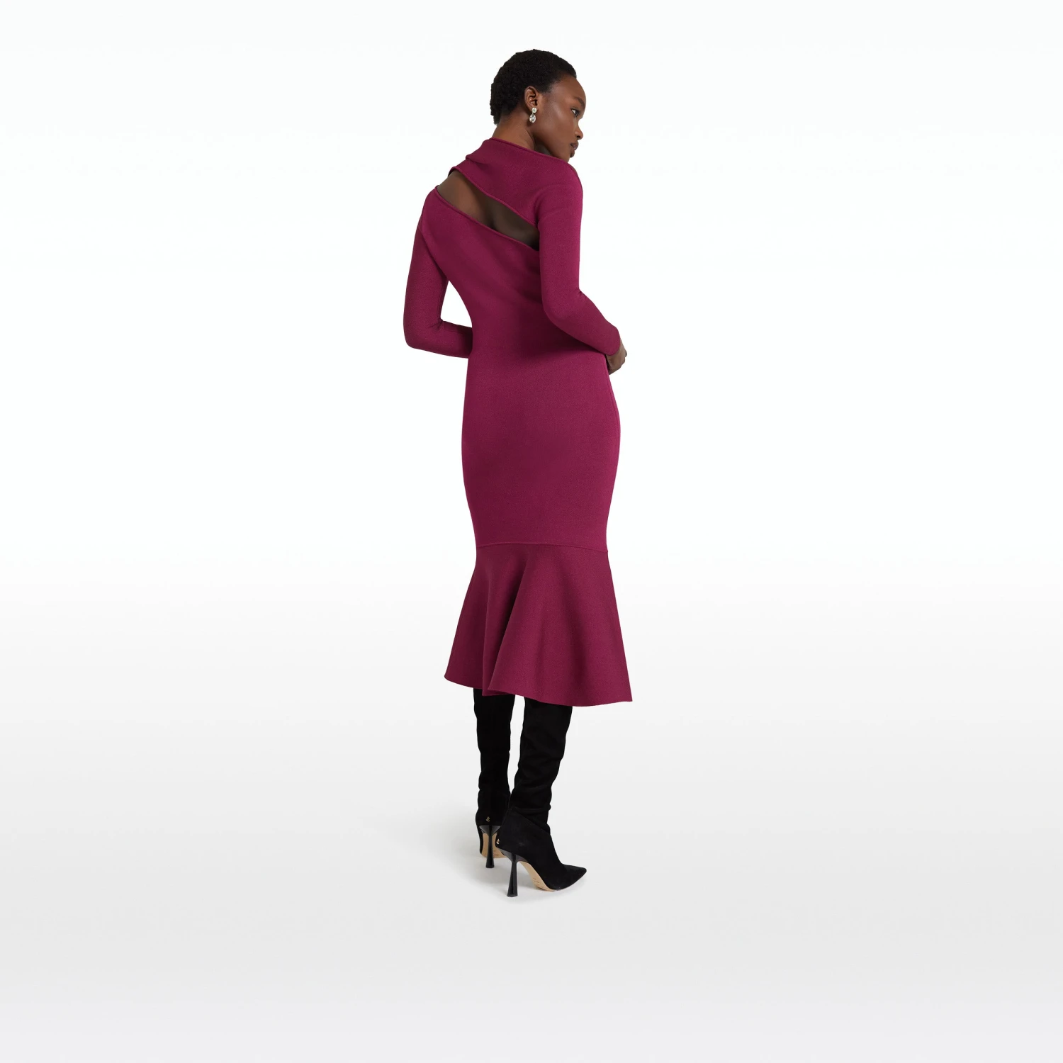 Midi dress with kick back flare skirt, long sleeves and asymmetric cutout neckline in burgundy.