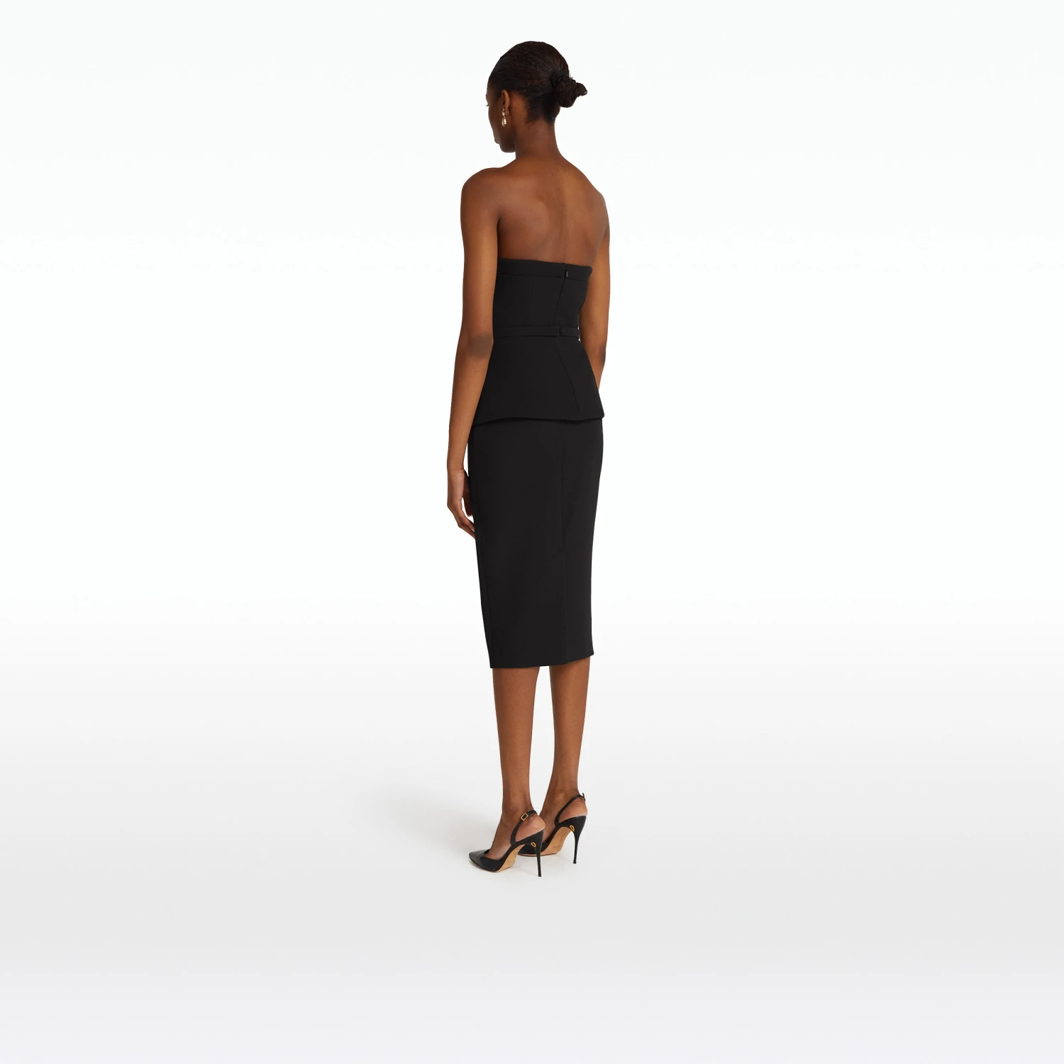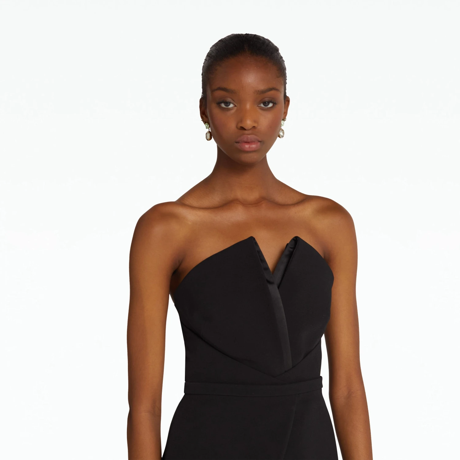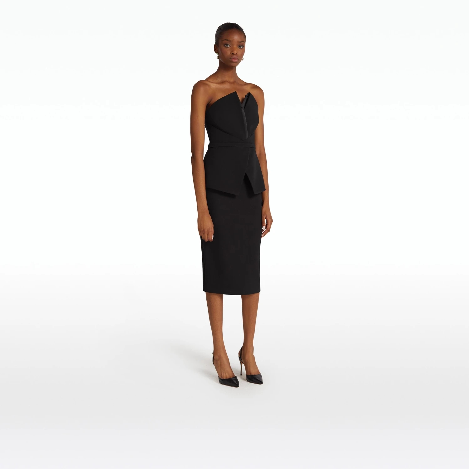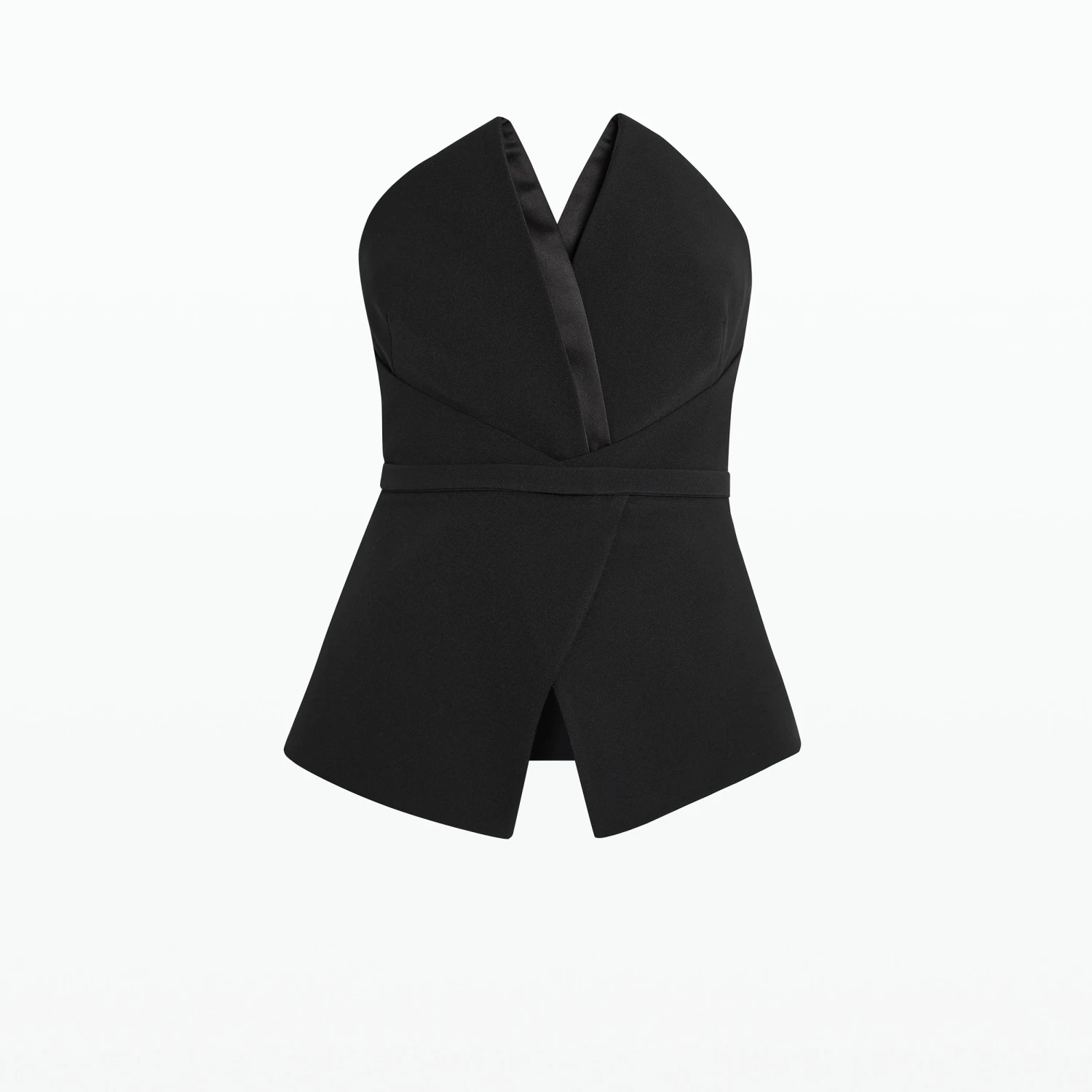 Bustier top with split peplum and fold over bust detail in black Heavy Crepe and Shine Satin Stretch.