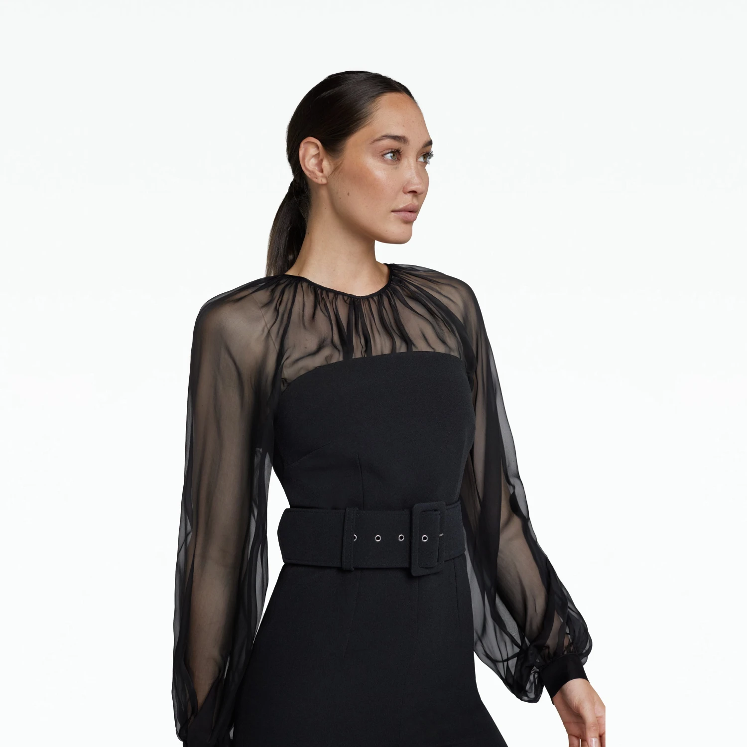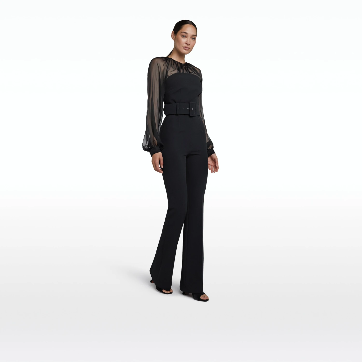 Semi-Flared leg jumpsuit with contrast neckline and pleated detail in black.