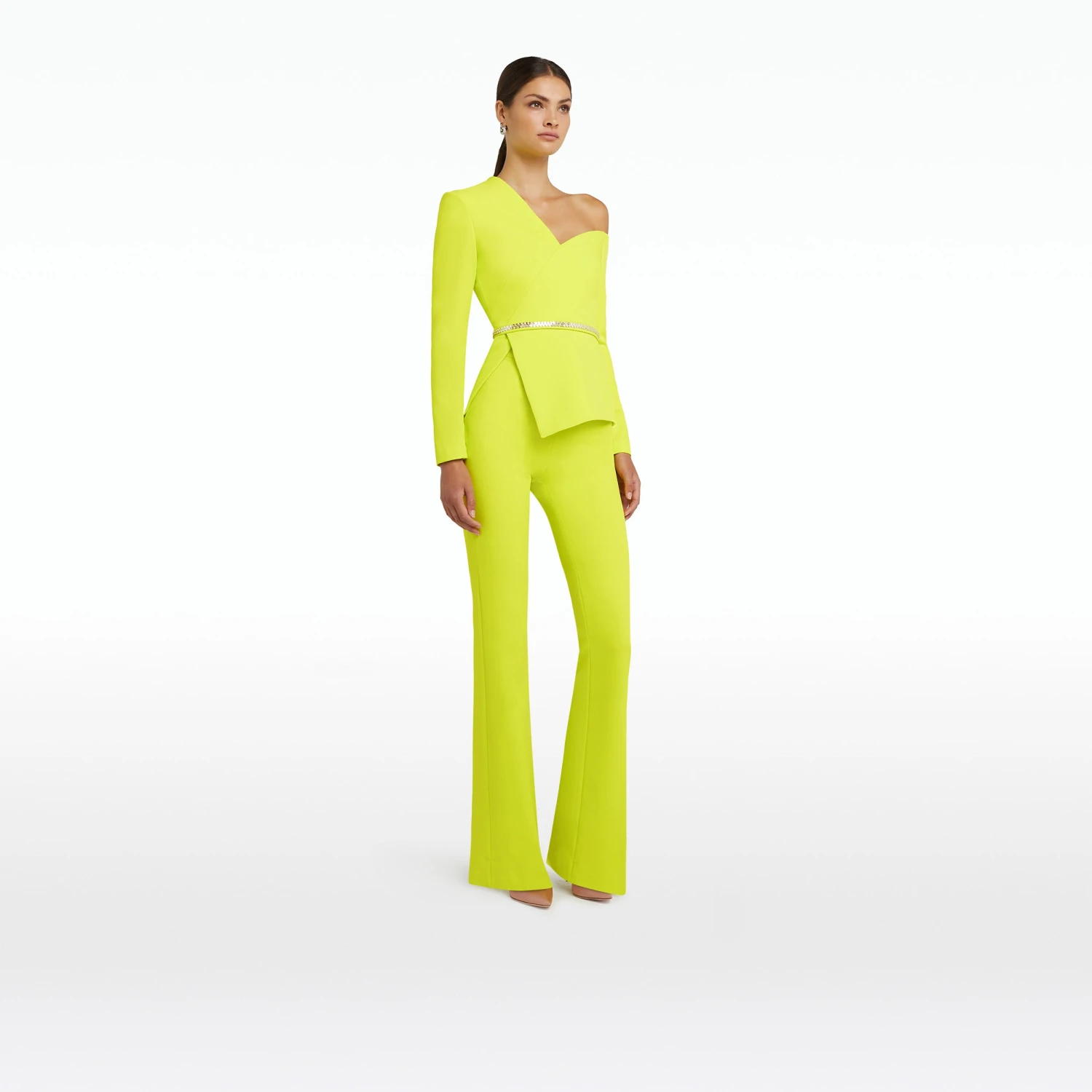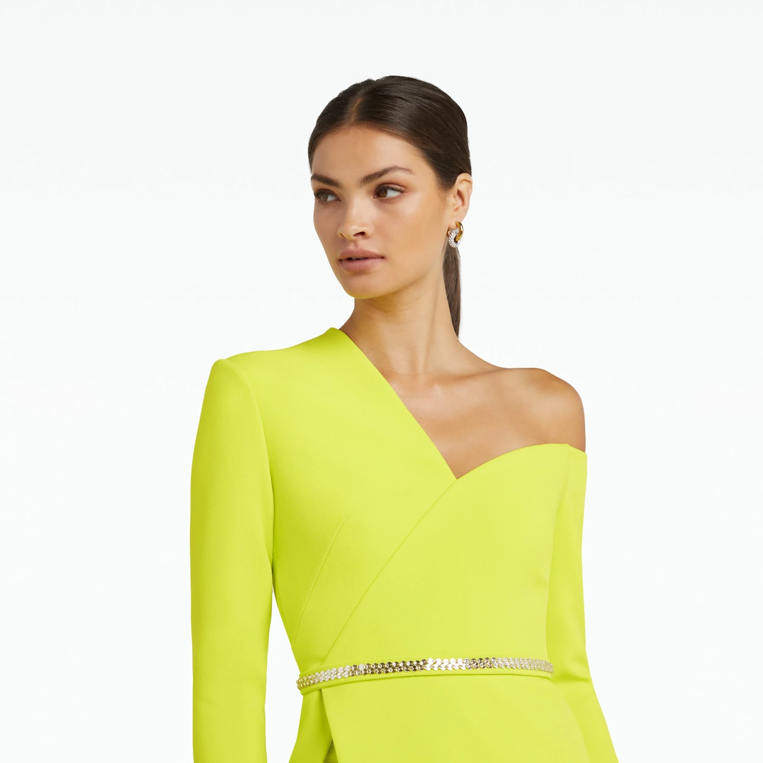 Asymmetric, long-sleeve top with split peplum and flattering neckline in meknes Heavy Crepe with crystal Mirror Disc embroidery.