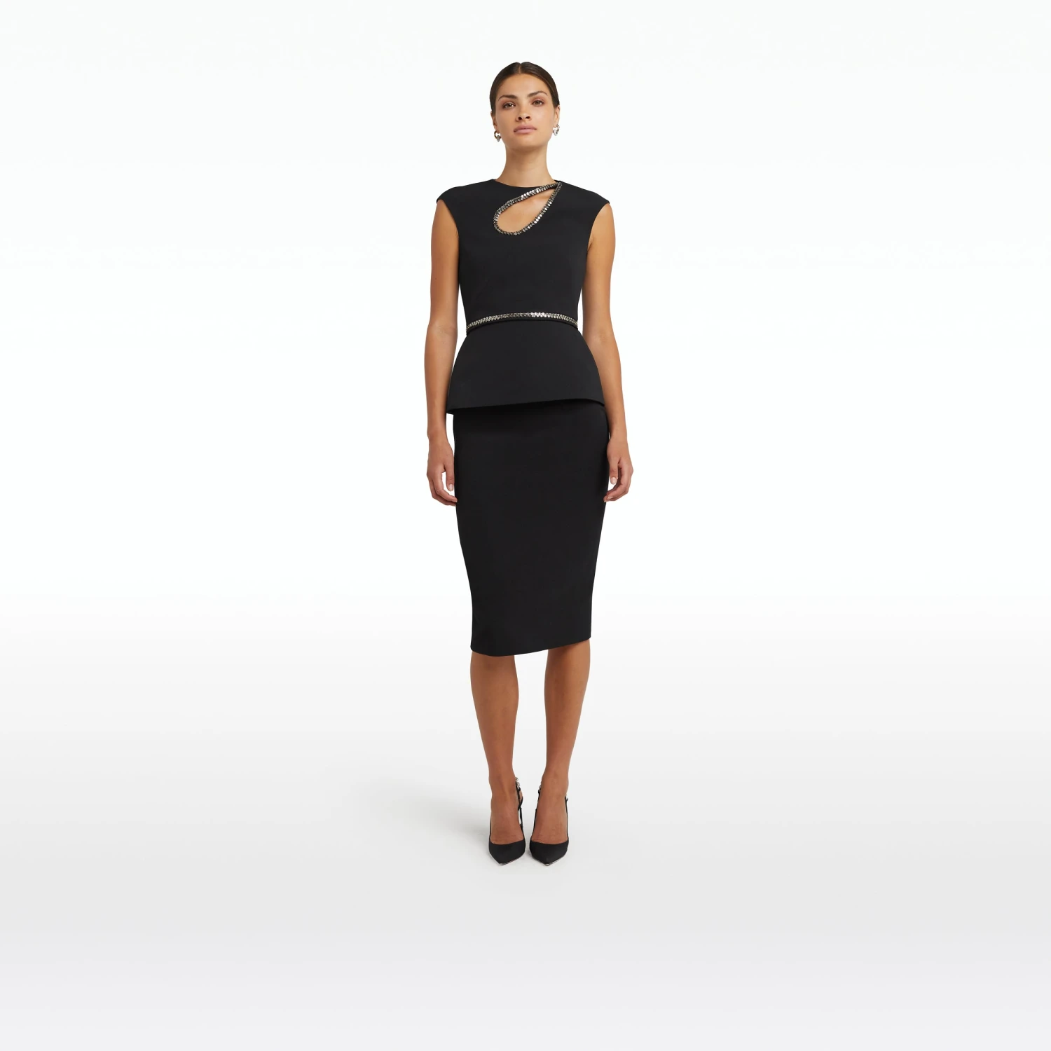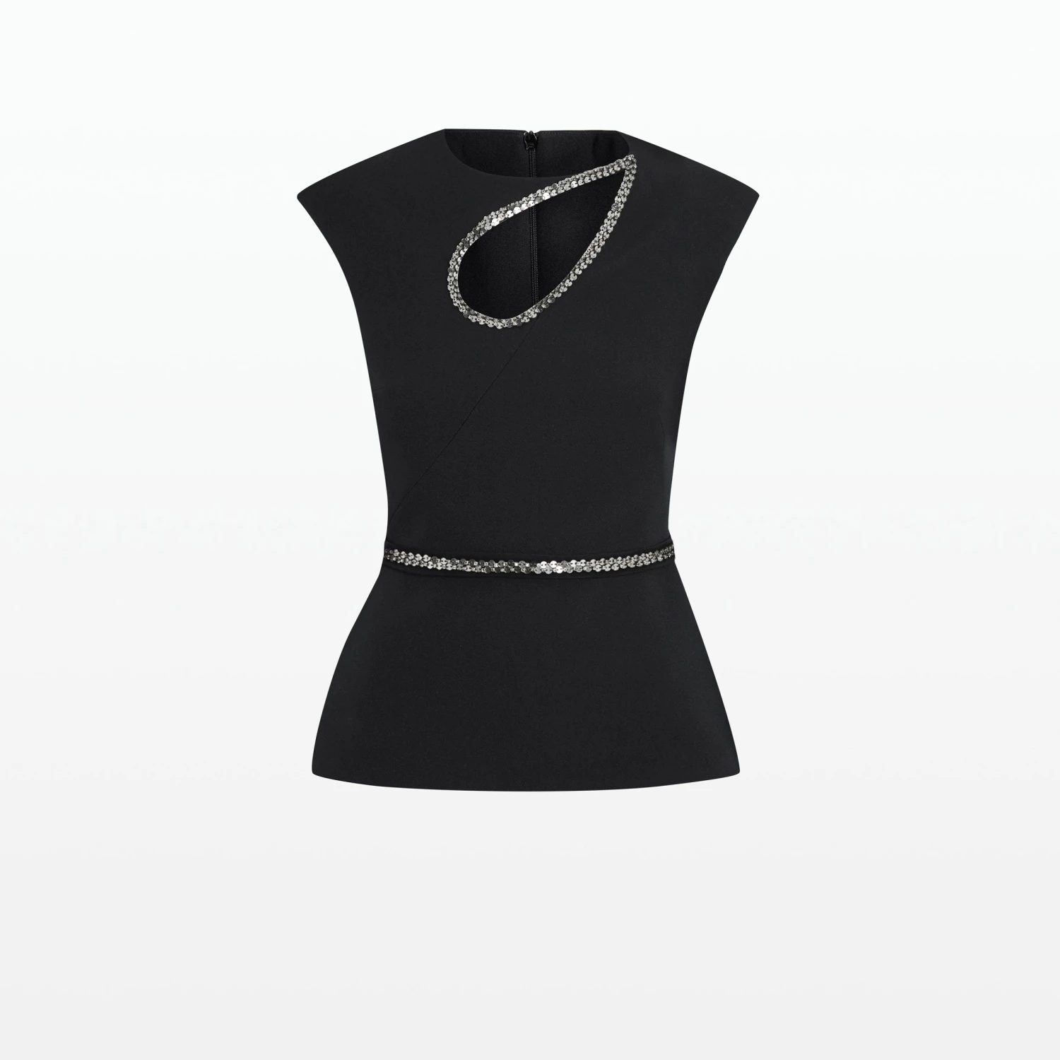 Cap sleeved top with simple peplum and cut out neckline with seam detailing in black Heavy Crepe and gunmetal Mirror Disc embroidery.