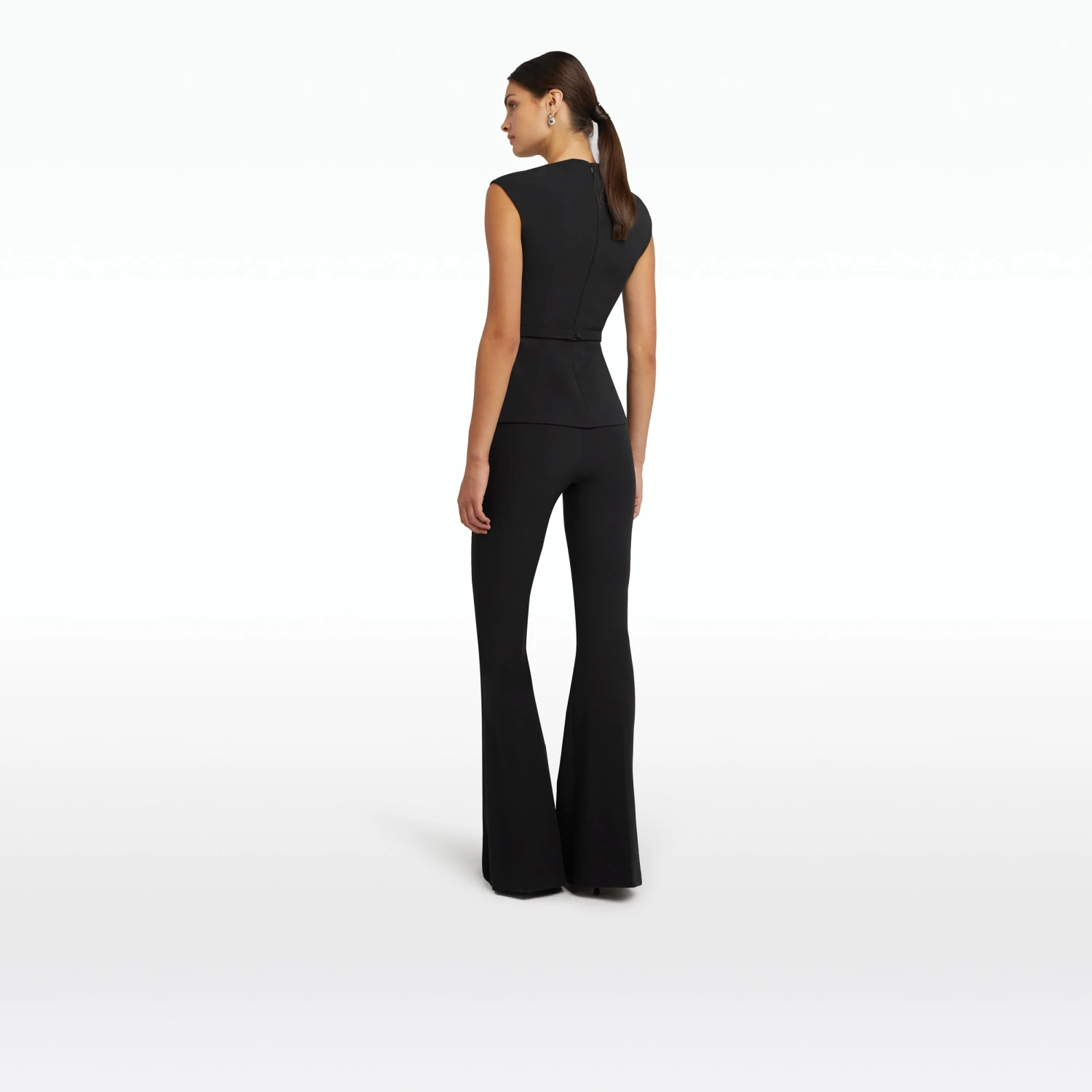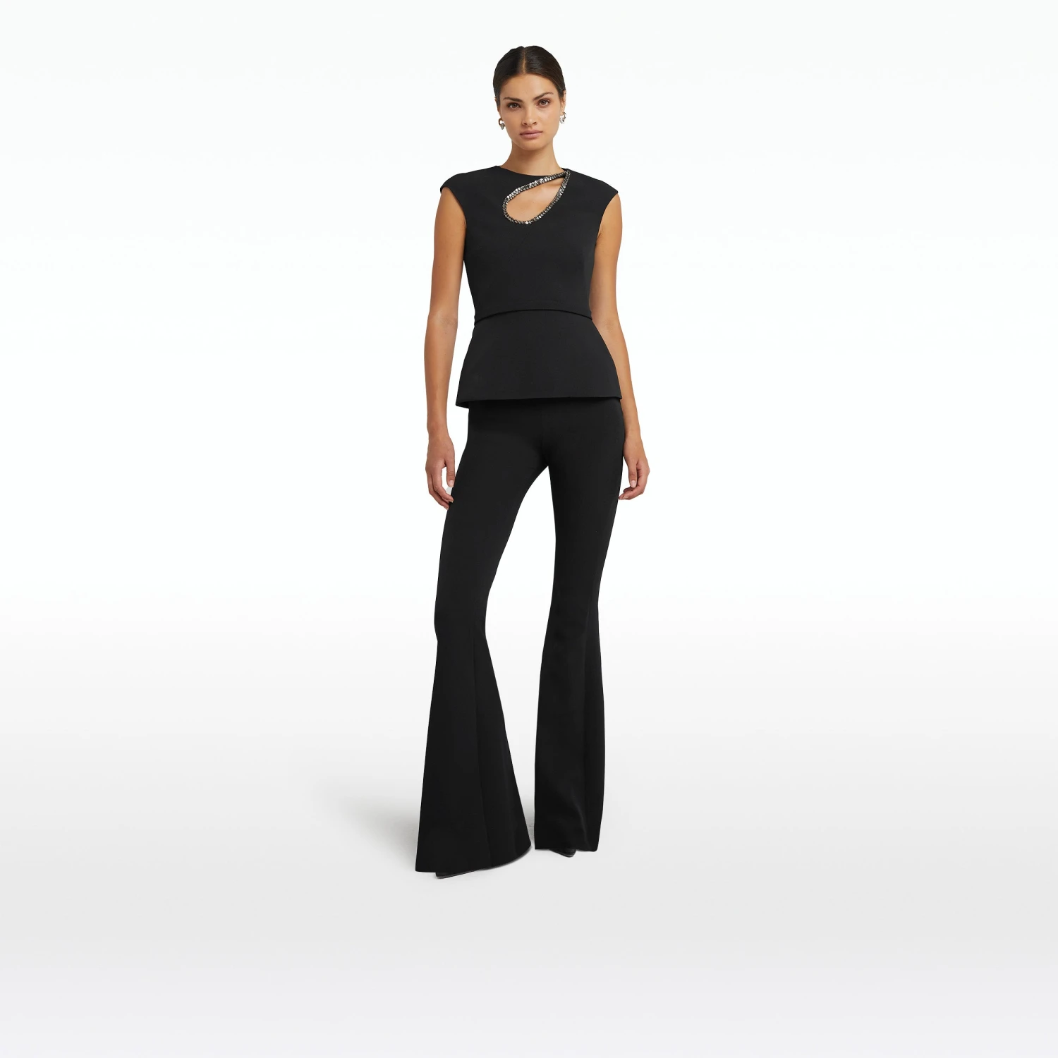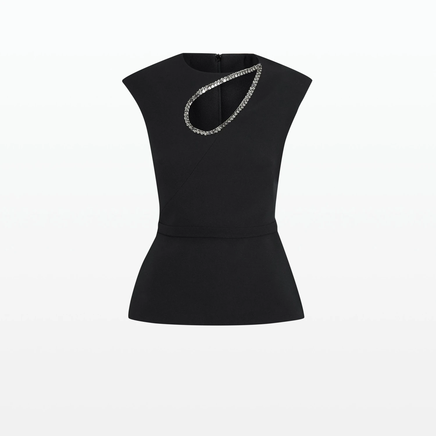Cap sleeved top with simple peplum and cut out neckline with seam detailing in black Heavy Crepe and gunmetal Mirror Disc embroidery.
