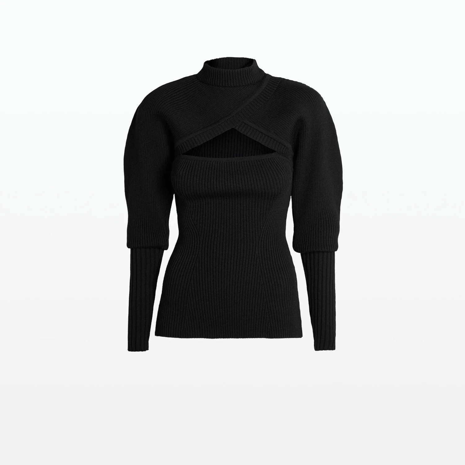 Two piece set with bustier and parachute sleeve bolero jumper in black Stretch Merino Wool.