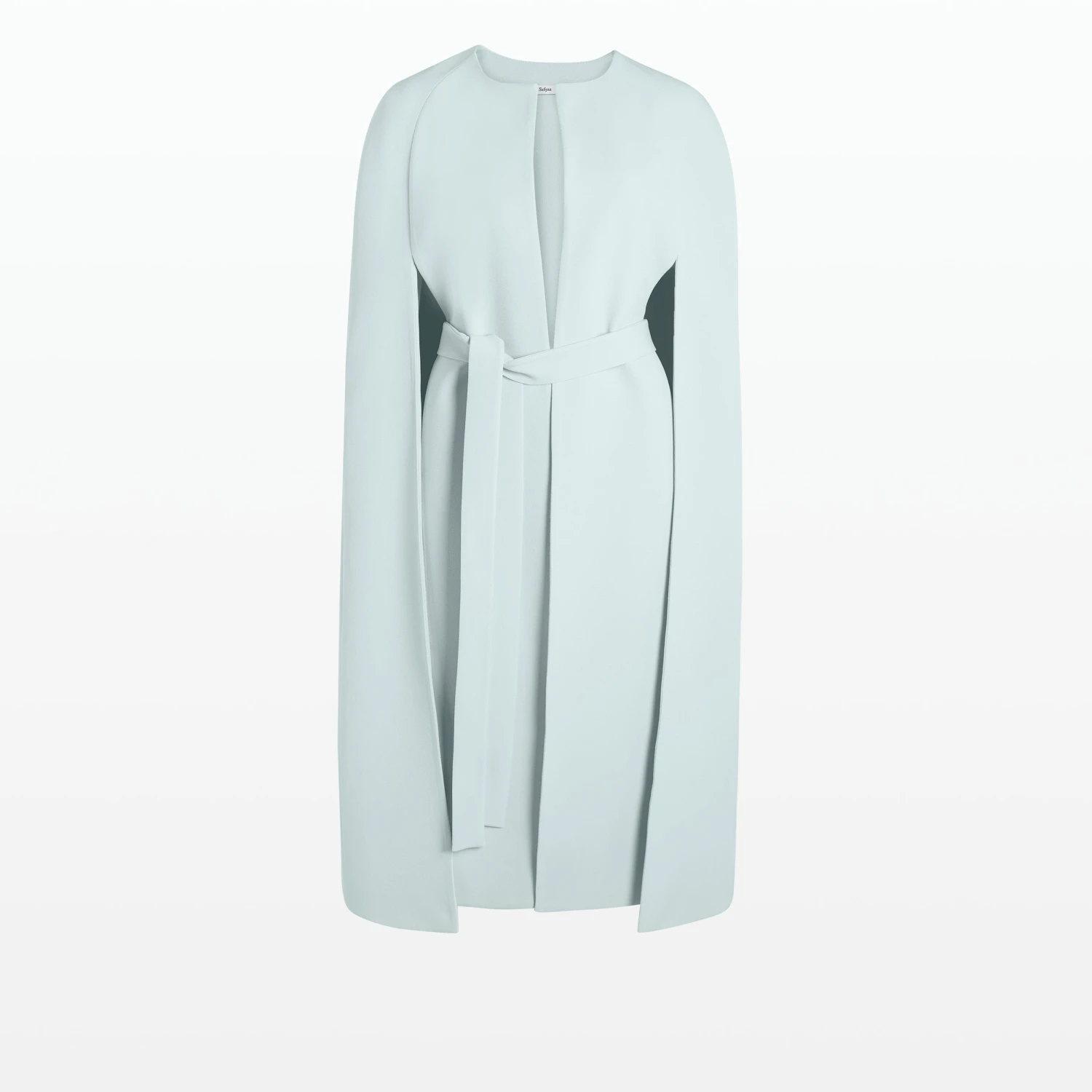 Round neck caped coat with belt in ice blue. Belt included.