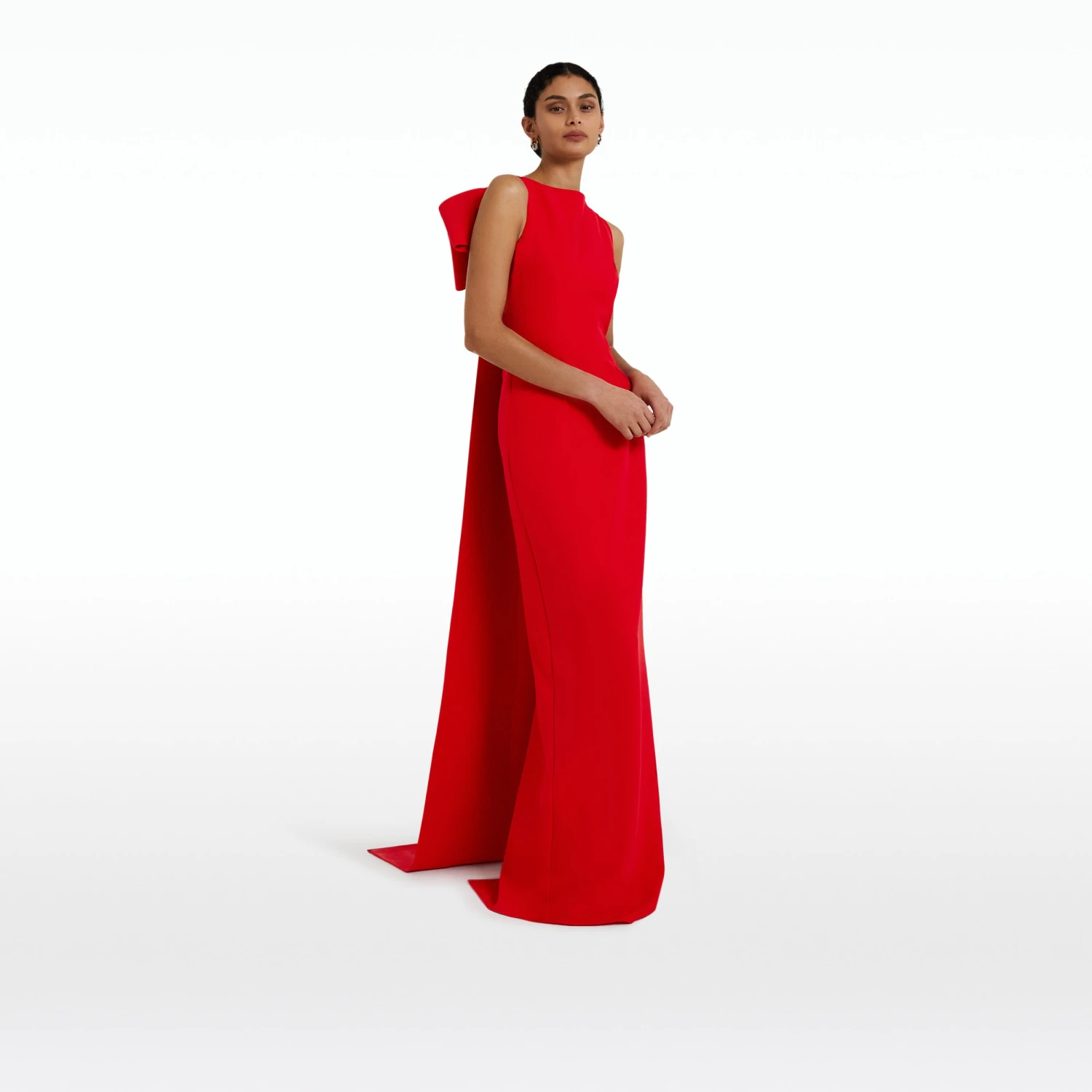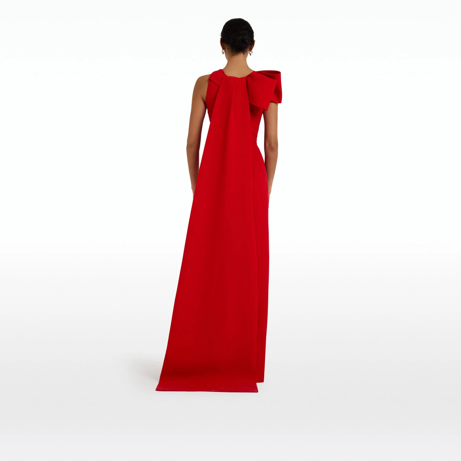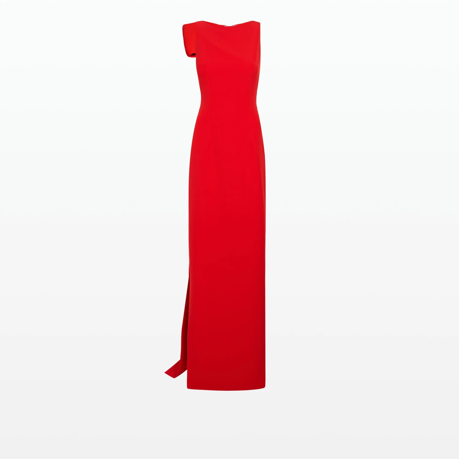 Full-length dress in cherry red heavy crepe with a boat neckline, folded drape at the reverse and long tail strap.