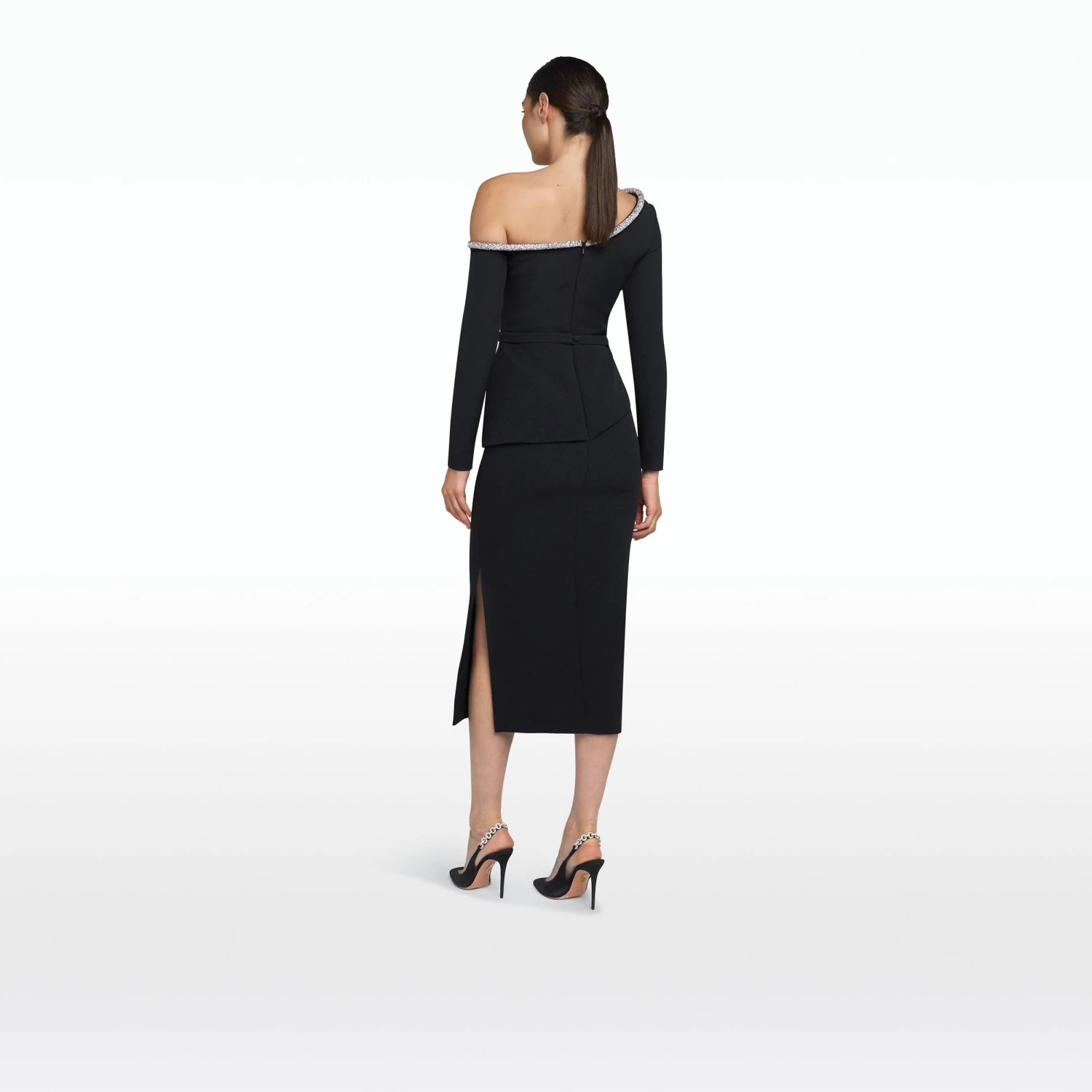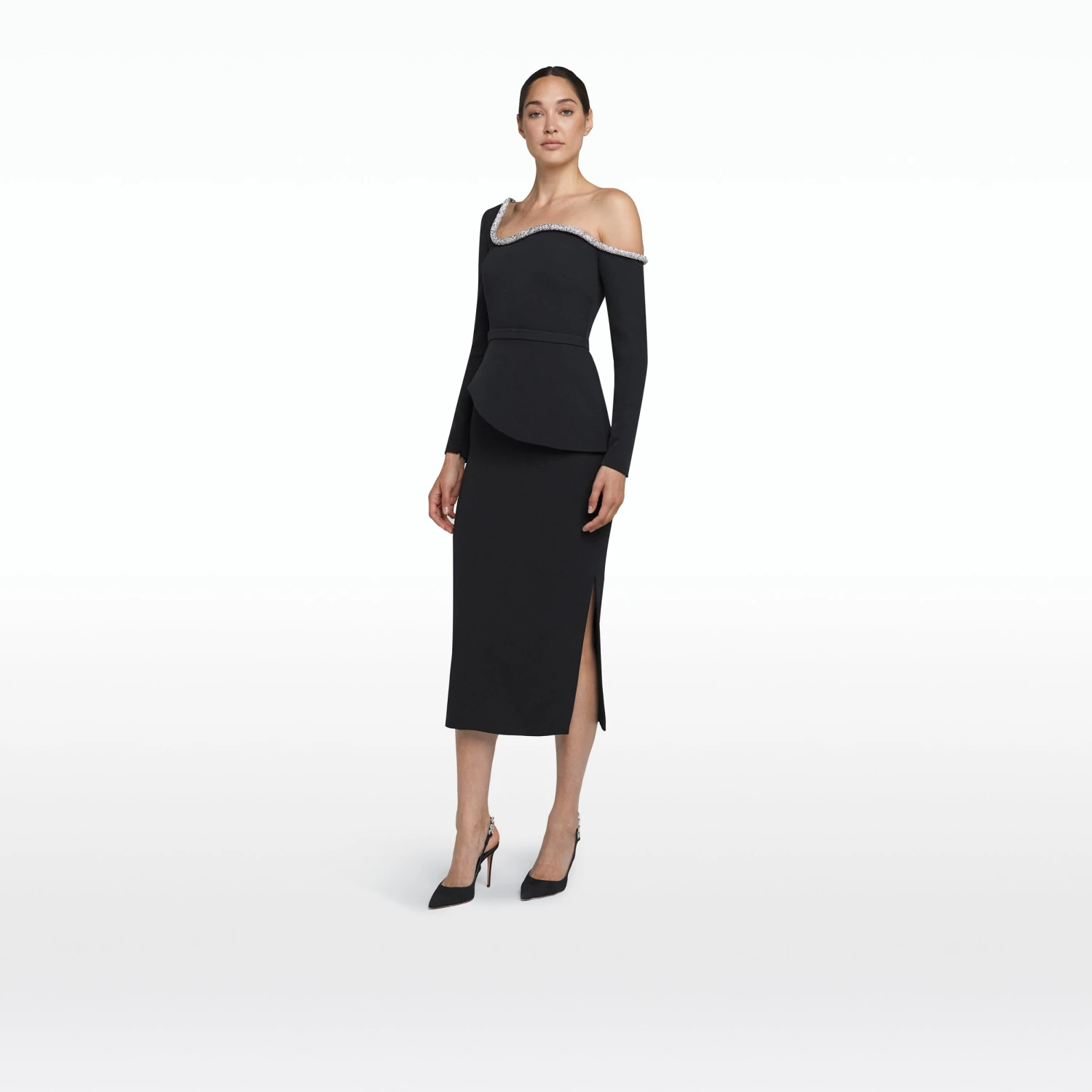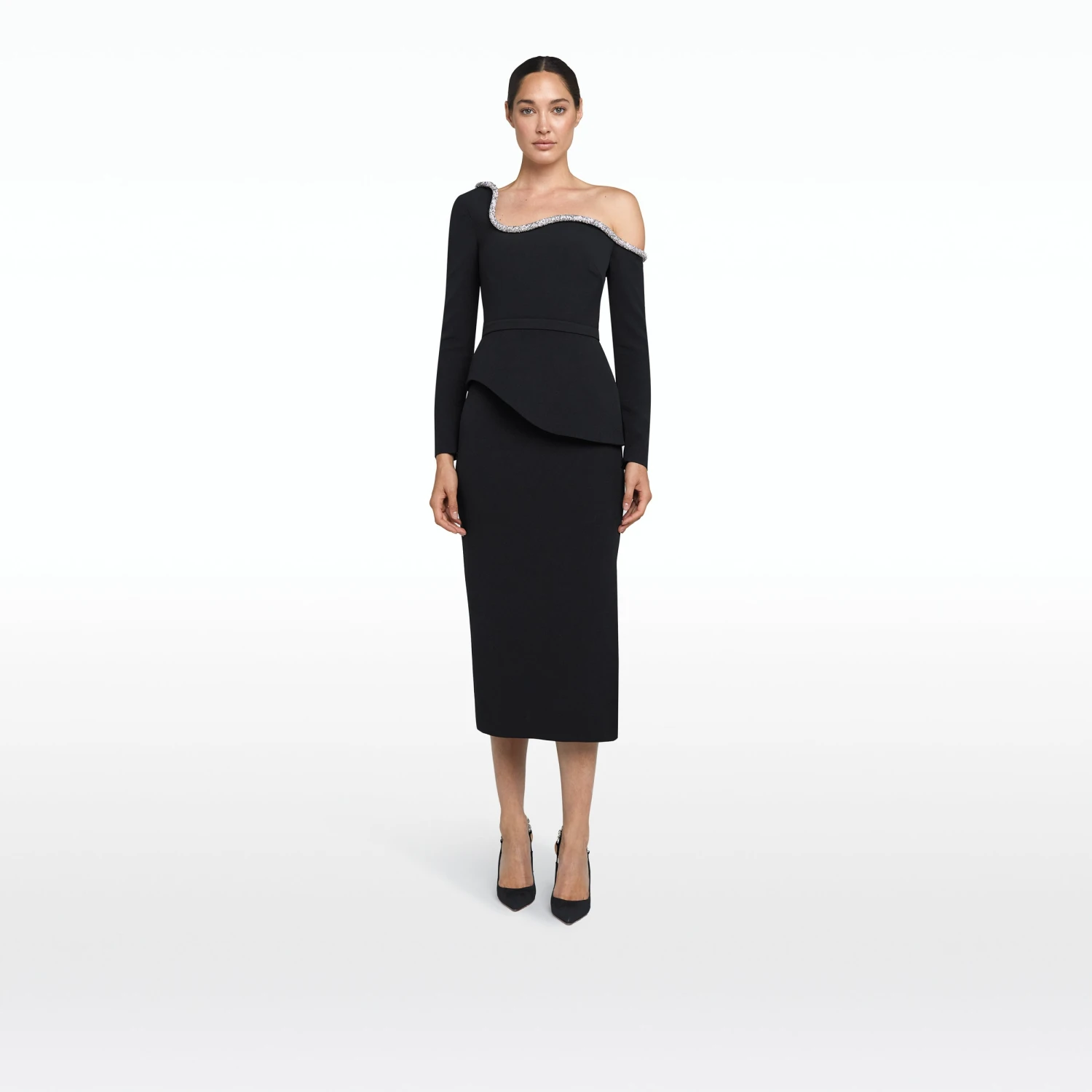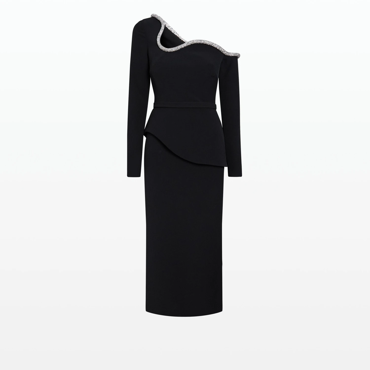 Cocktail dress with asymmetric statement neckline and peplum detail in black.