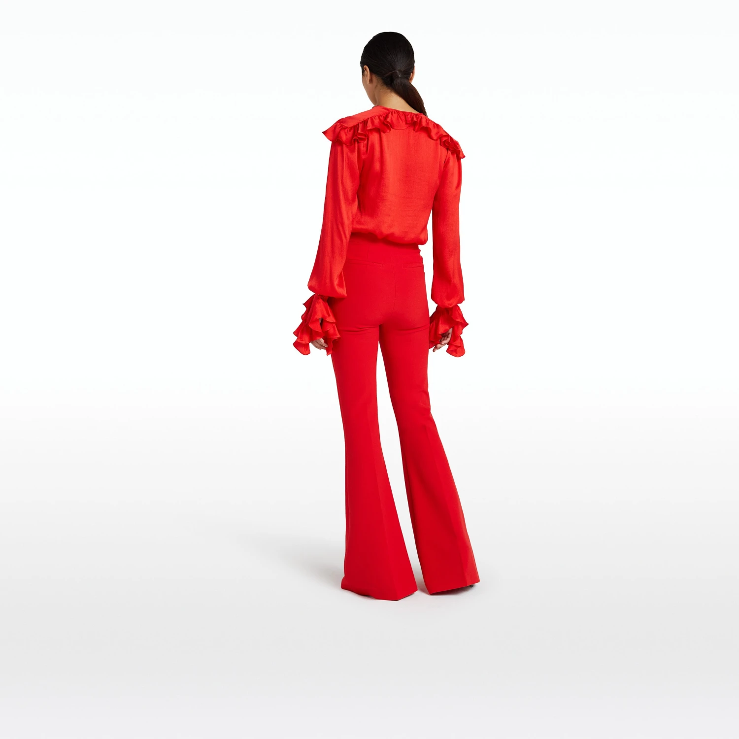 V neck blouse with draped ruffle shoulder and ruffle sleeve in cherry red.