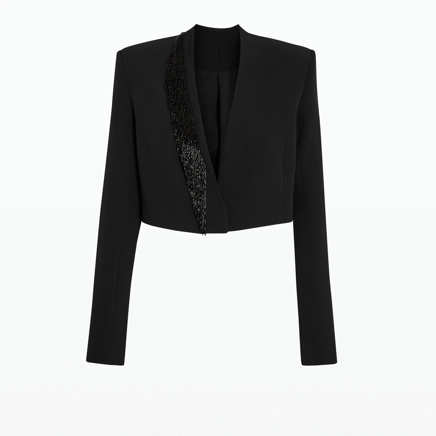 Collarless cropped jacket with structured shoulder in black Heavy Crepe and Deco Fringe embroidery.