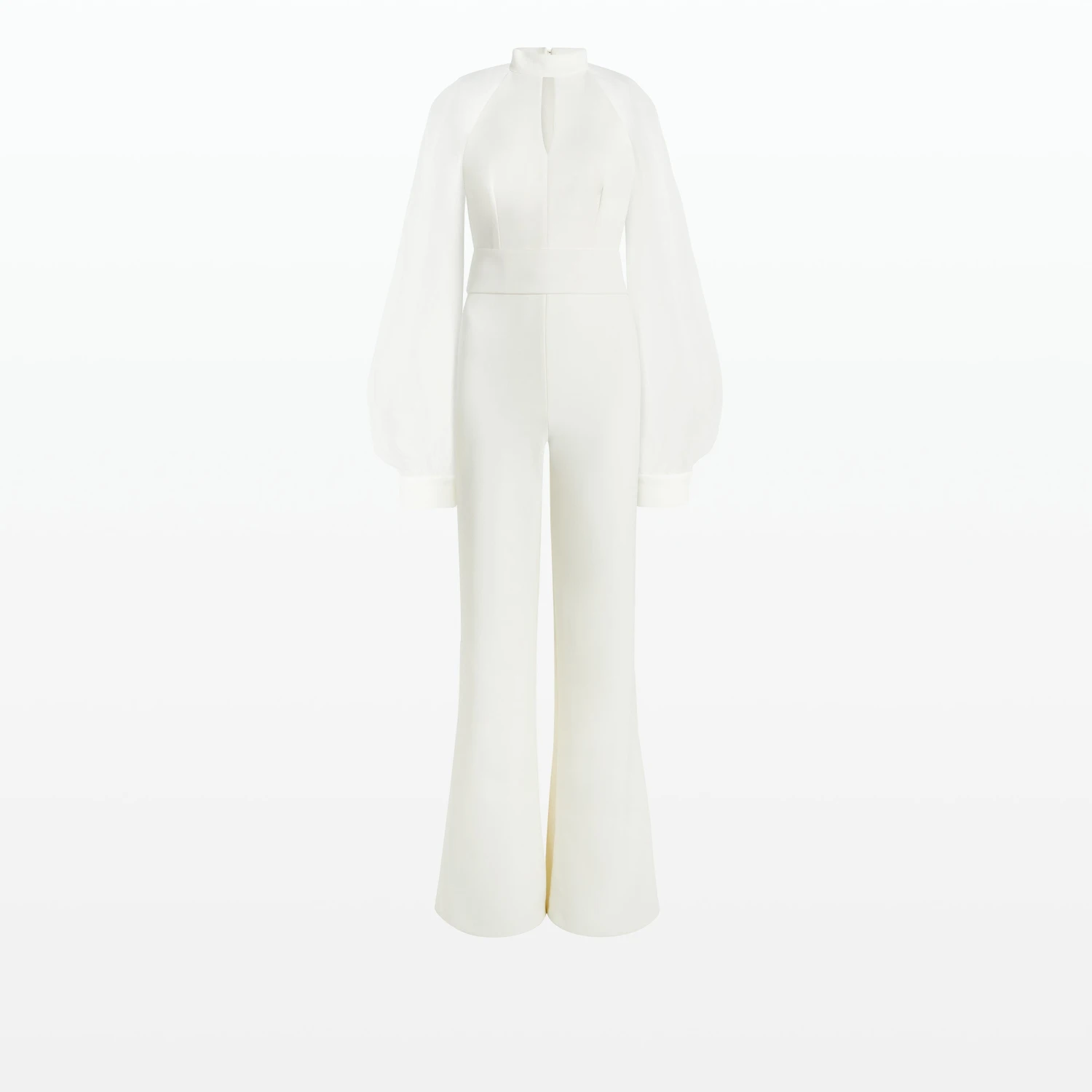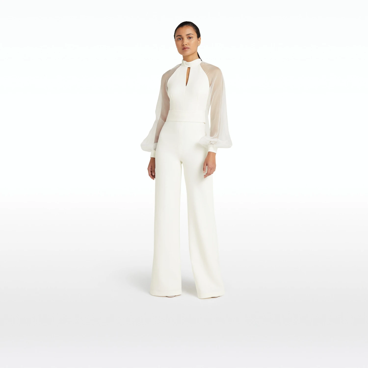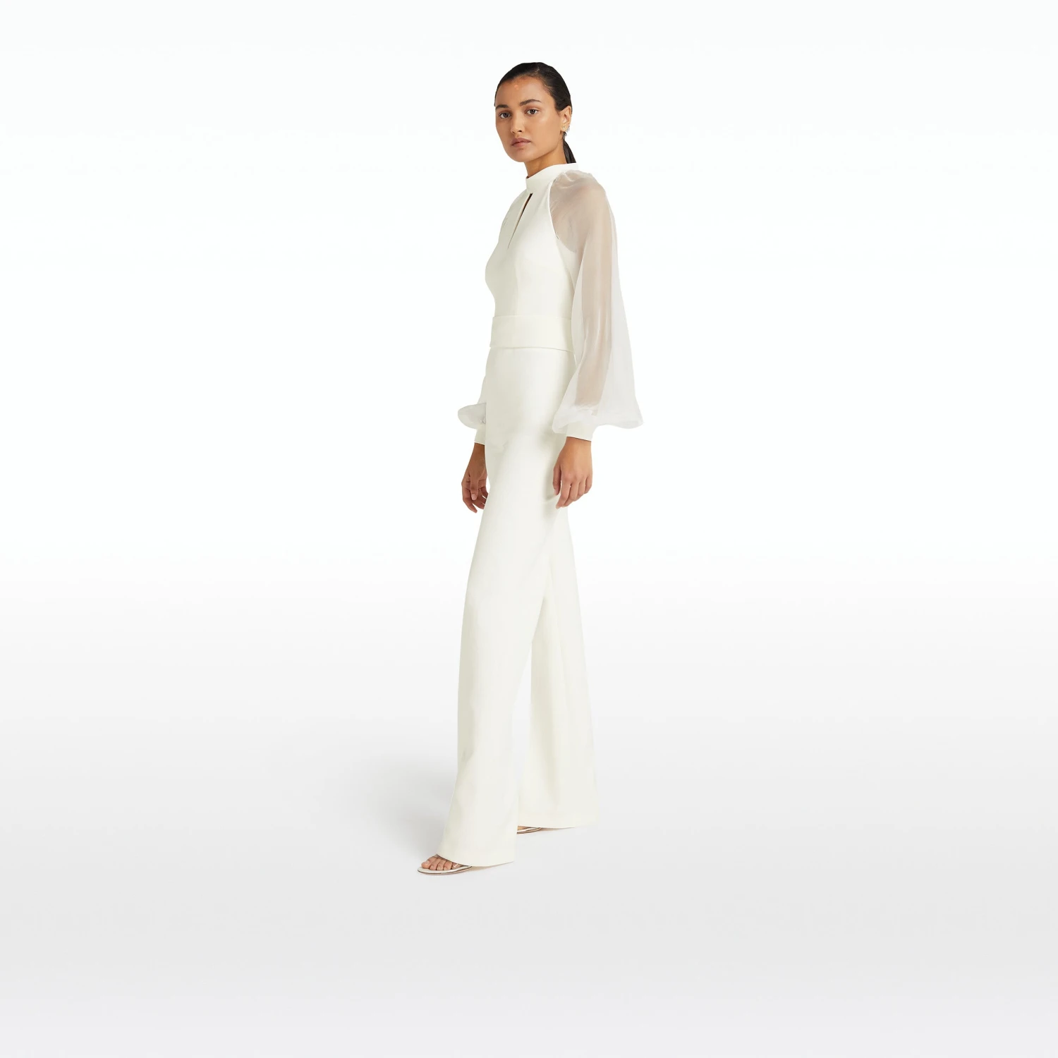 Crew neck, loop-hole, long sleeve jumpsuit with wide leg in ivory.