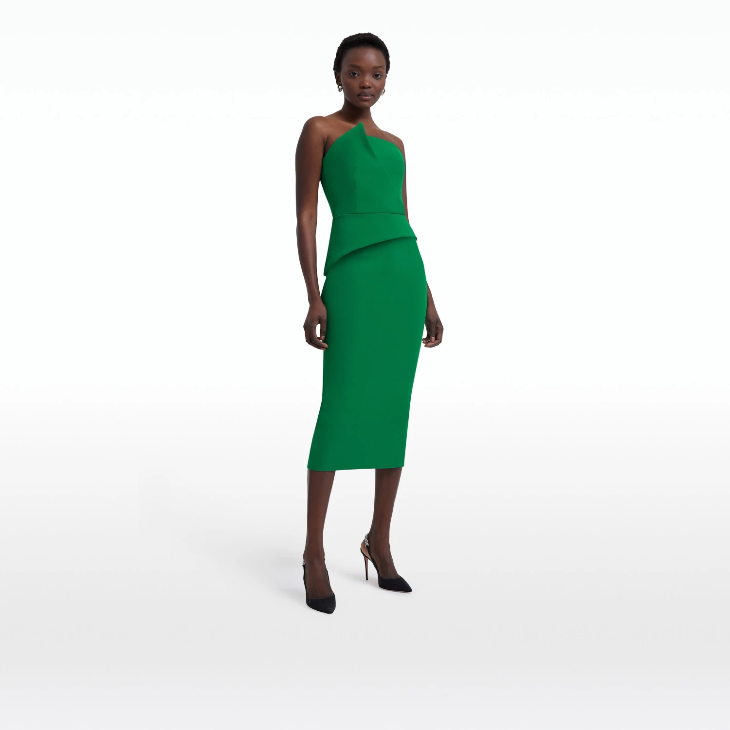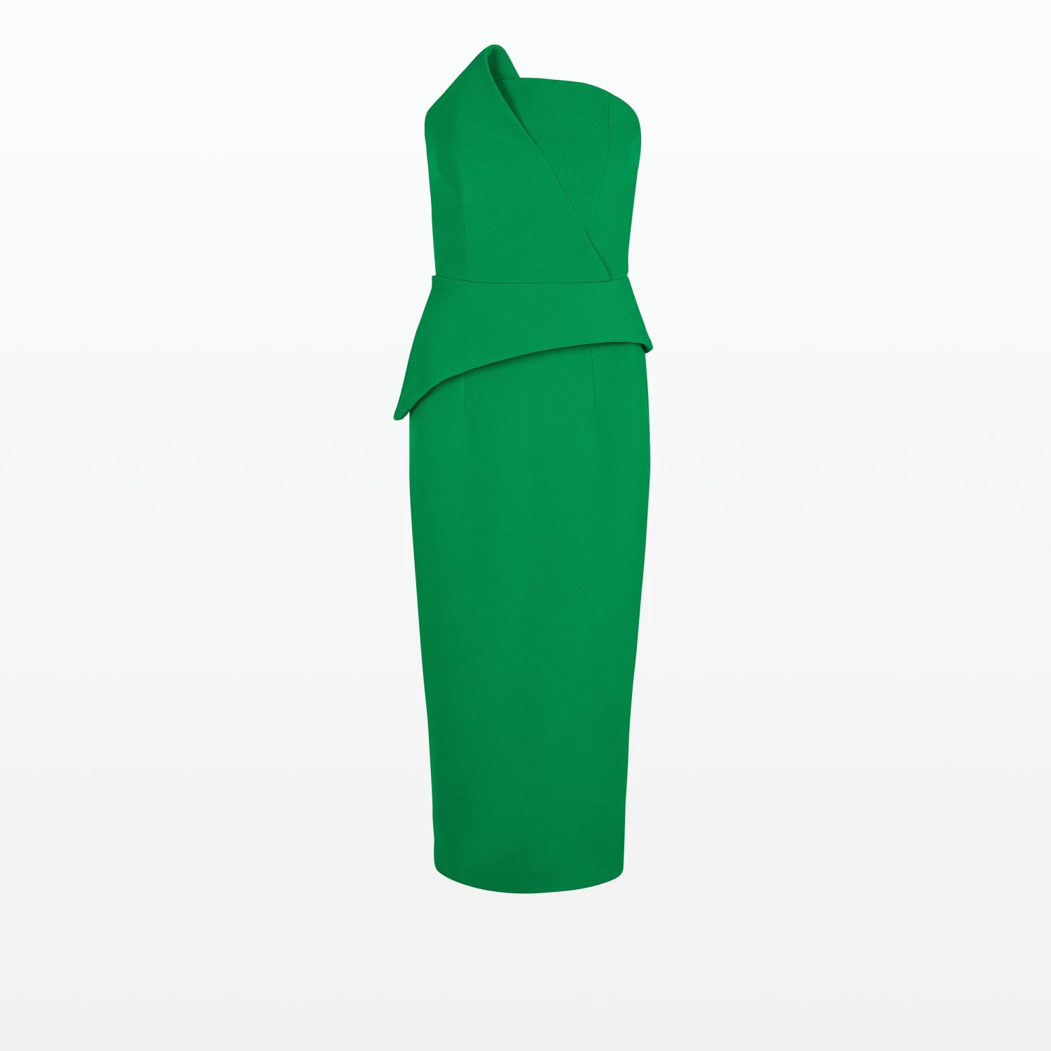 Strapless cocktail dress with bustier and peplum waved drape line in jewel green.