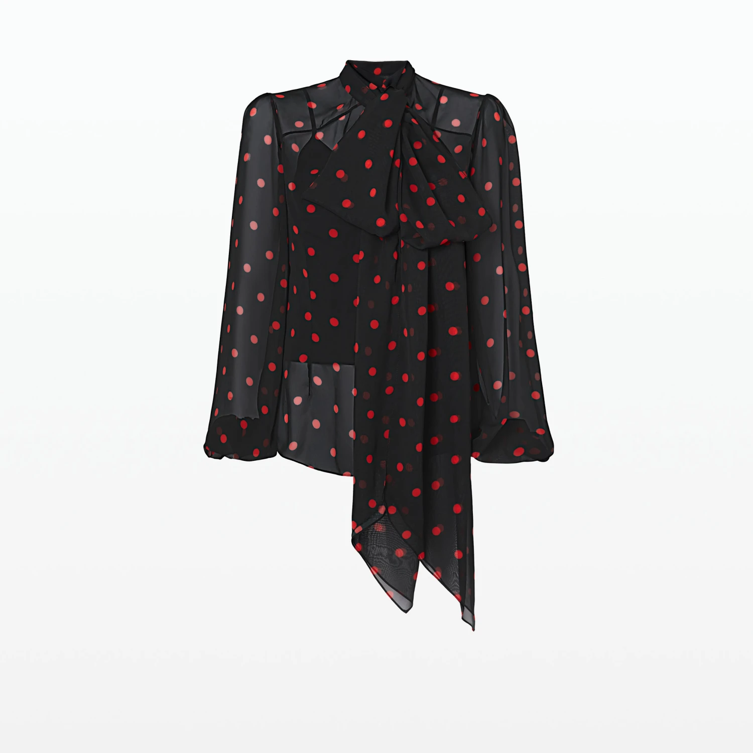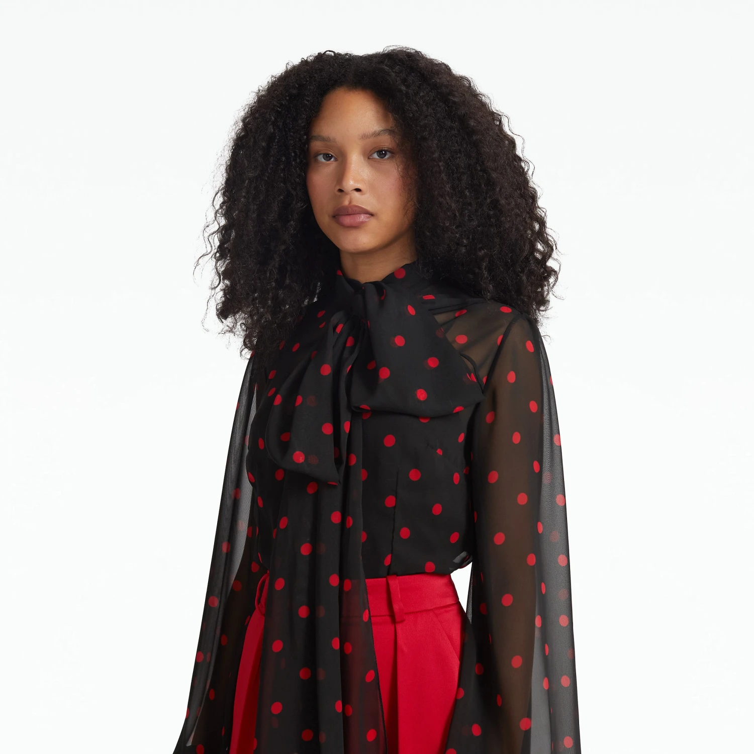 Pussybow blouse with bishop sleeve in black/ lacquer red Polka Chiffon.