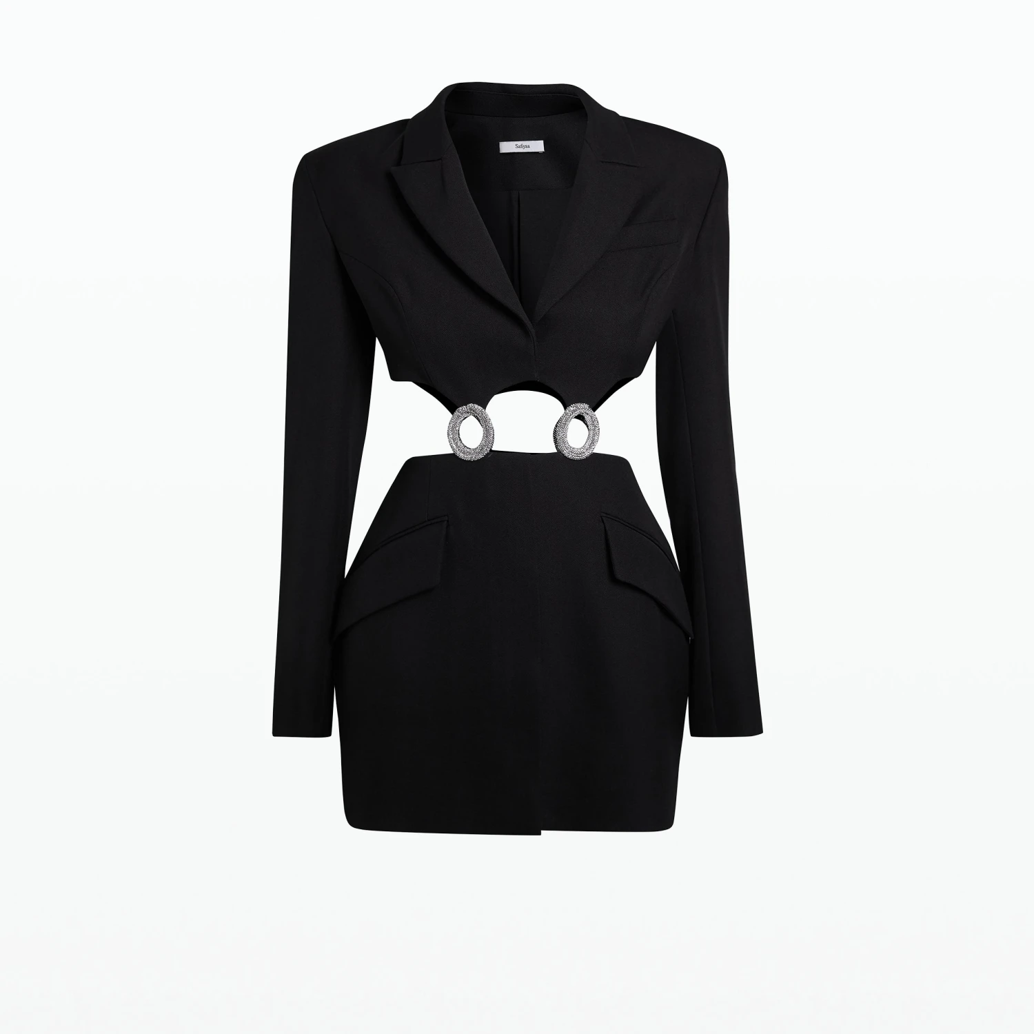 Tailored long line blazer with peaked lapels and classic details in black Damon Wool with Crystal Chain embroidery.