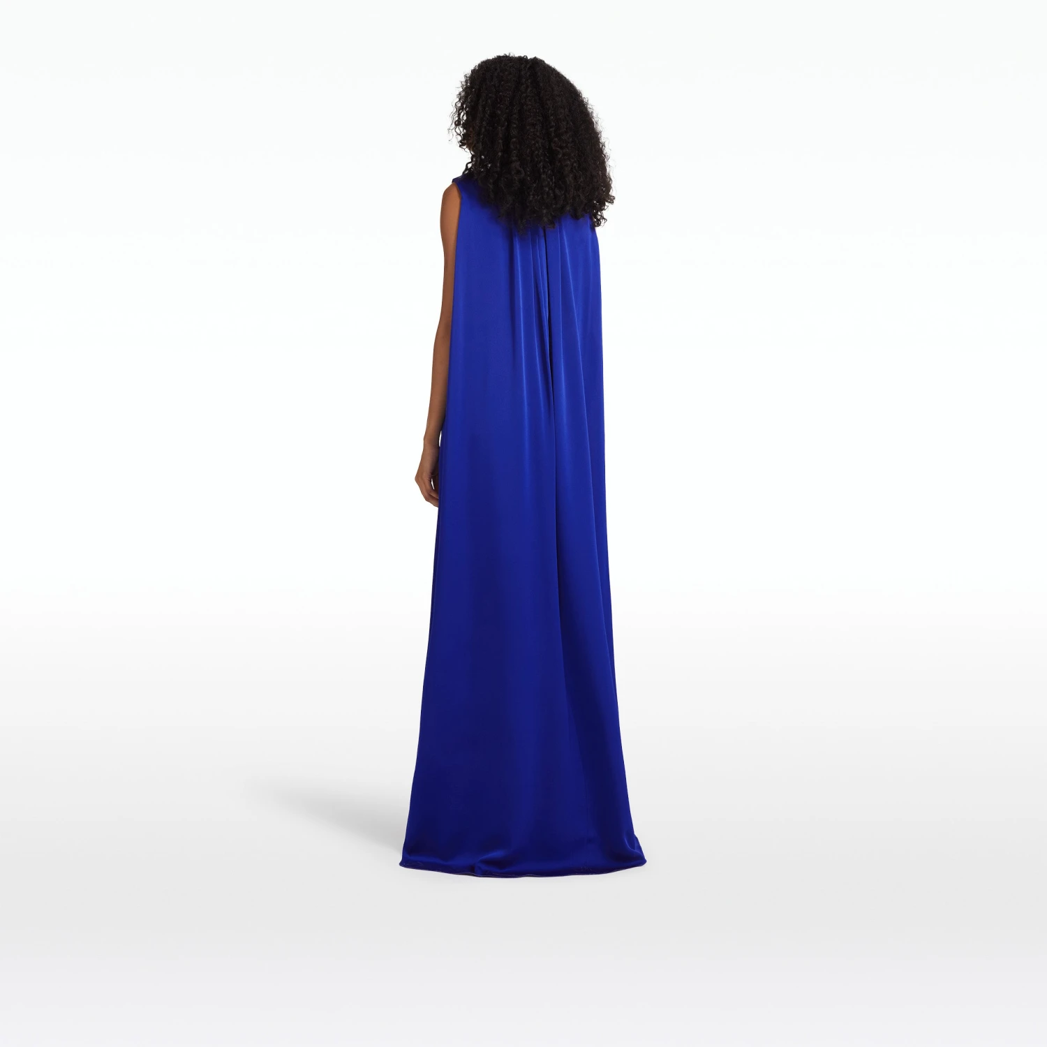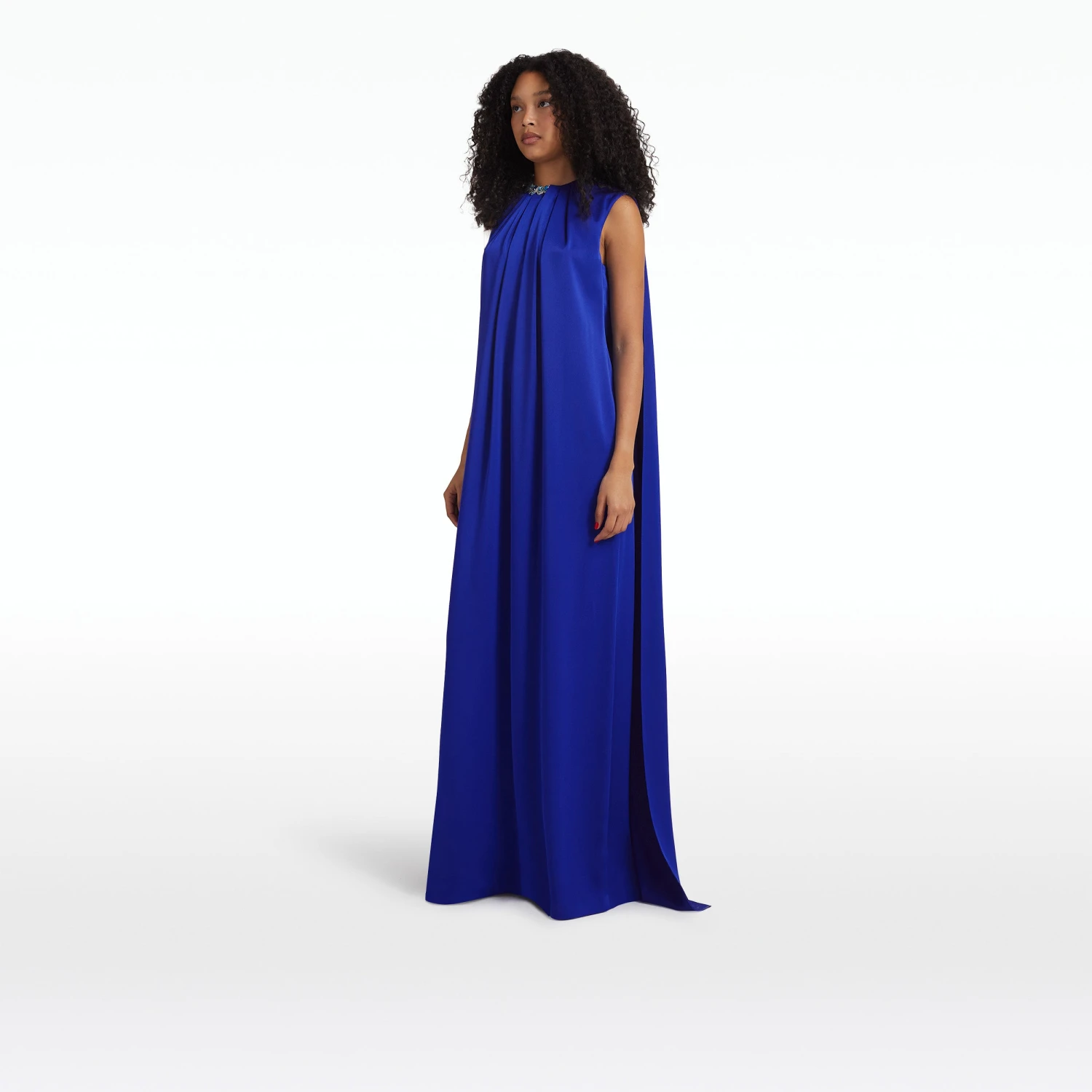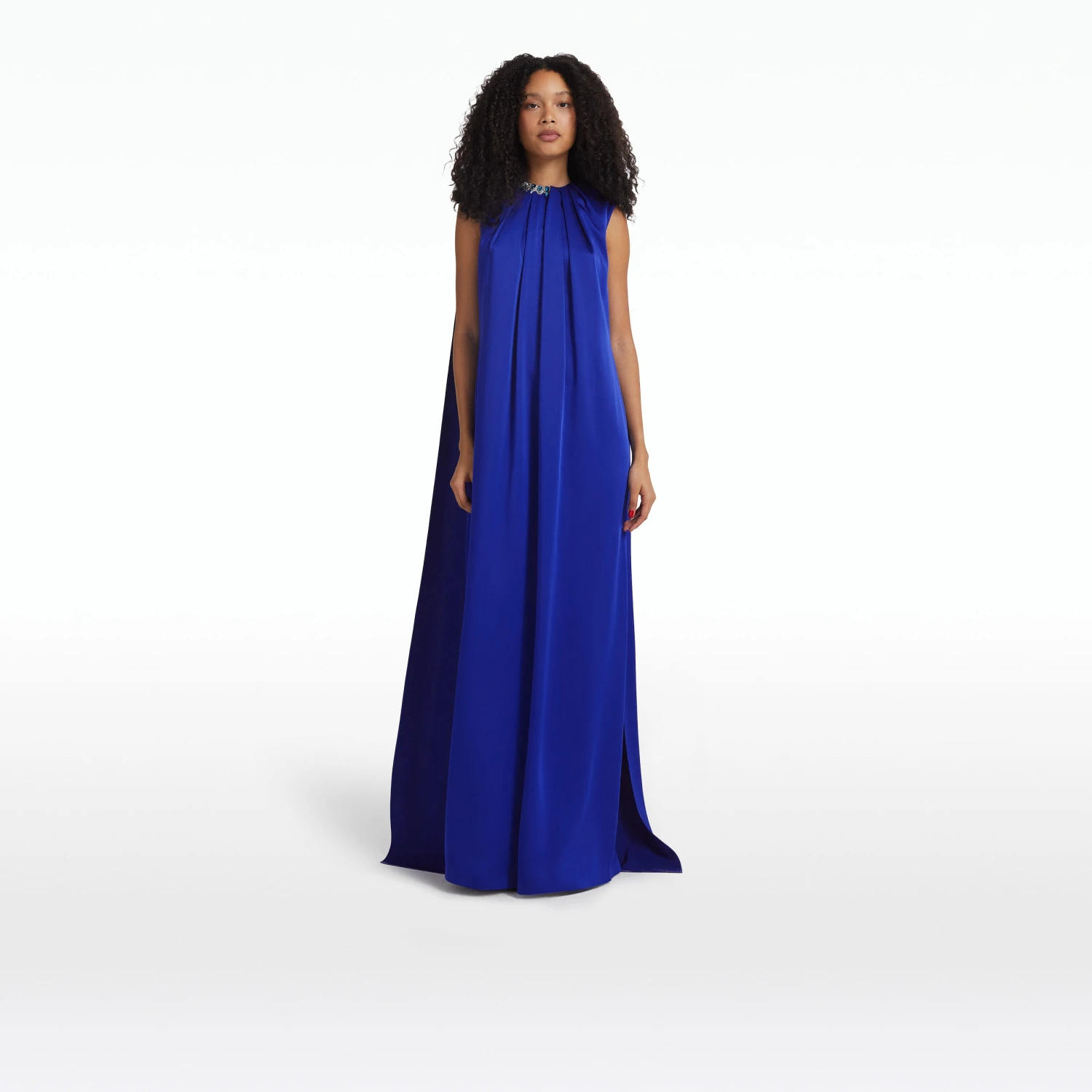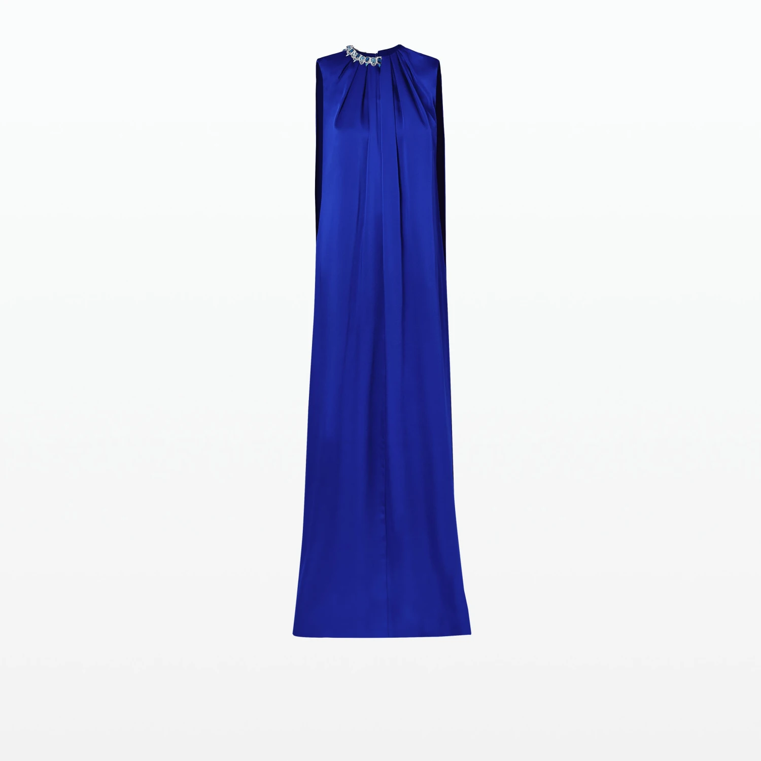 Relaxed gown with pleated neckline and cape in marrakech Light Satin Back Crepe and Adorned Trim Chain embroidery.Â