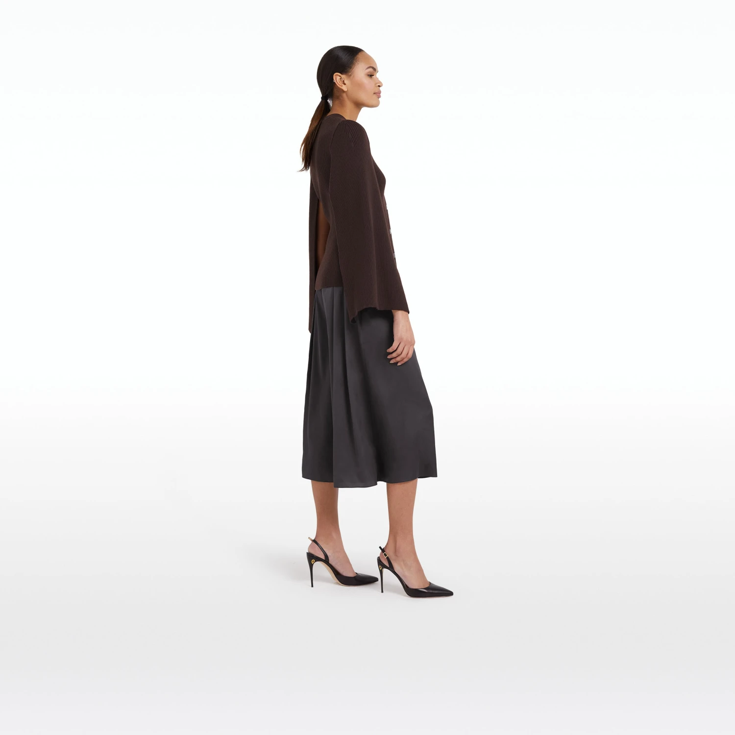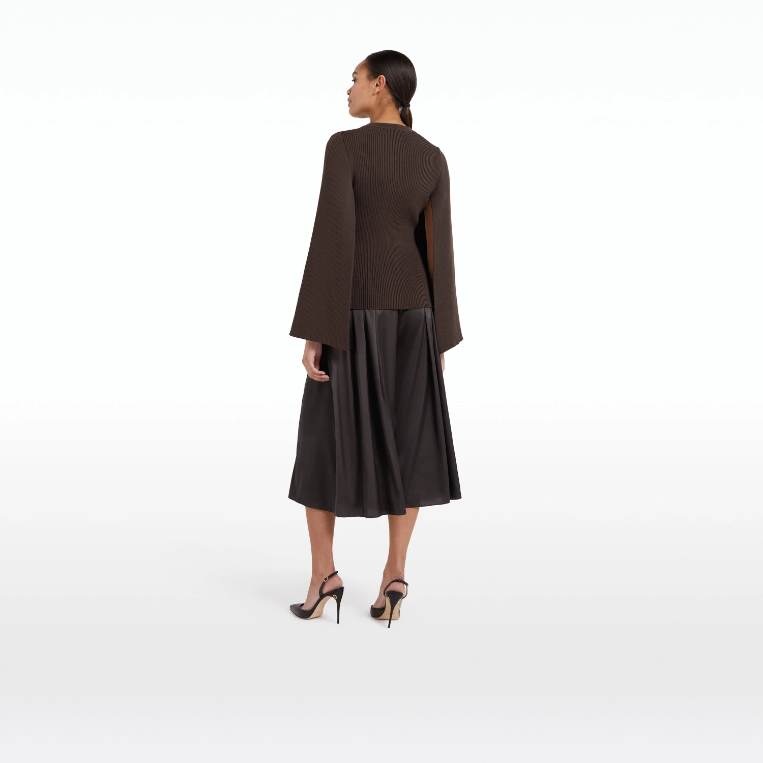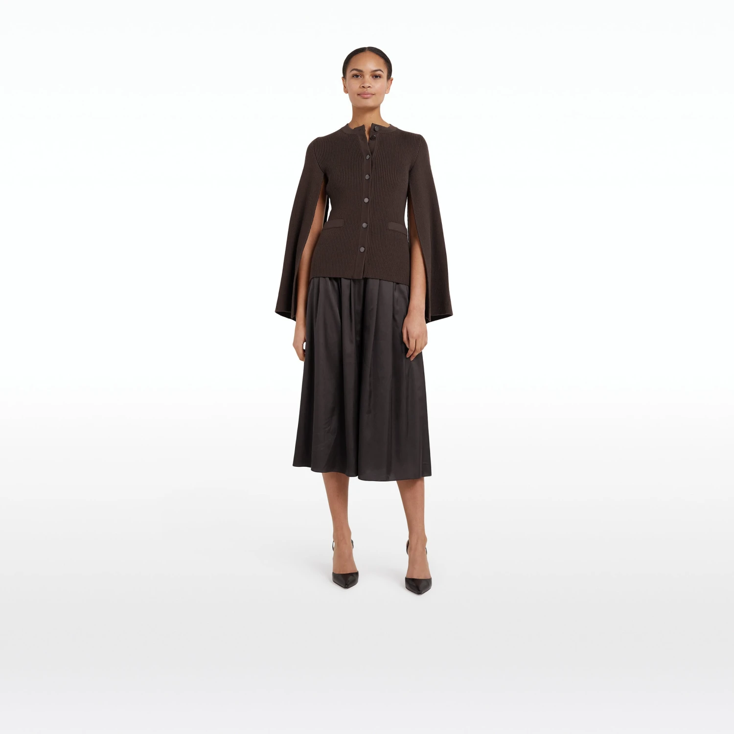 Crew neck cardigan with caped, slit sleeves in chocolate wool.