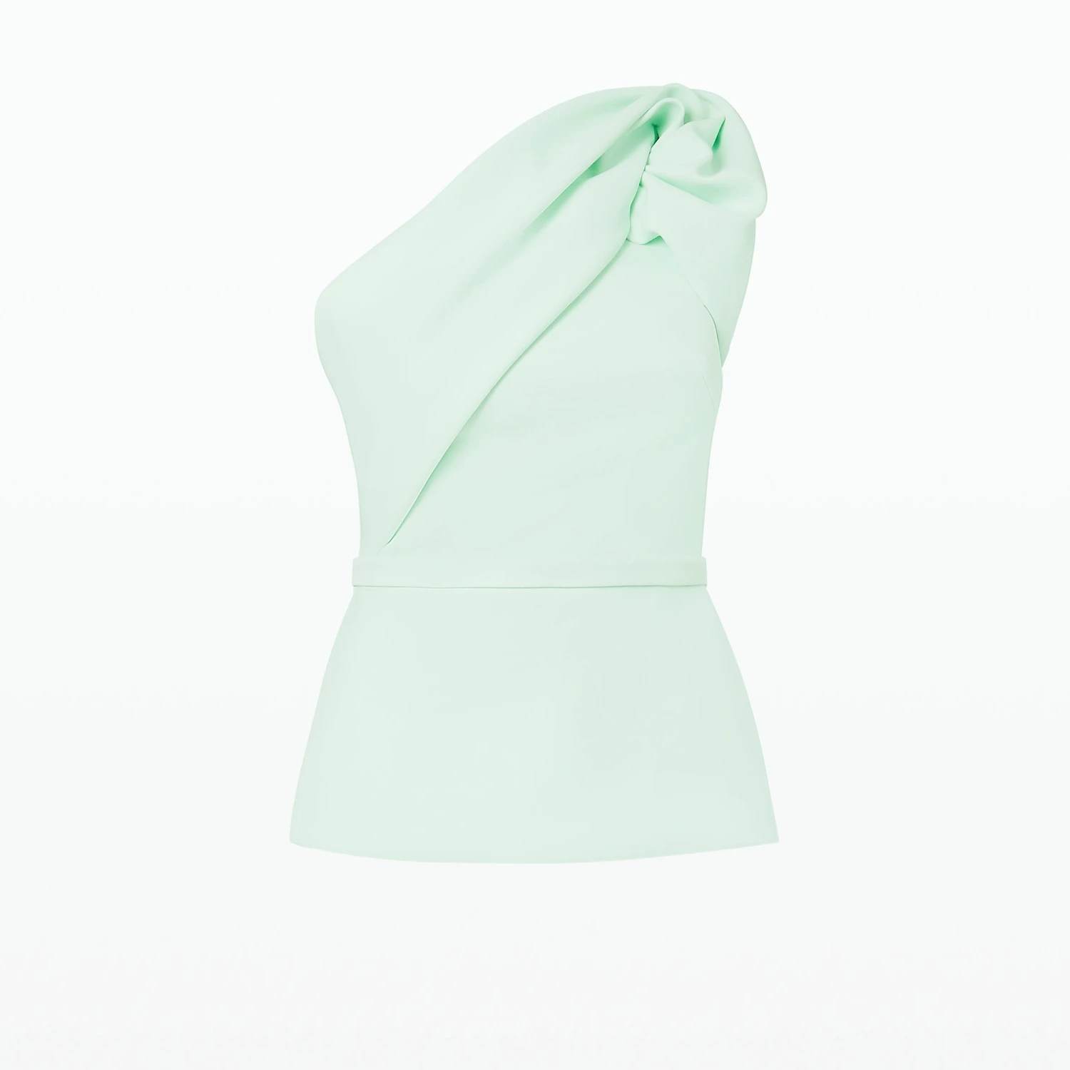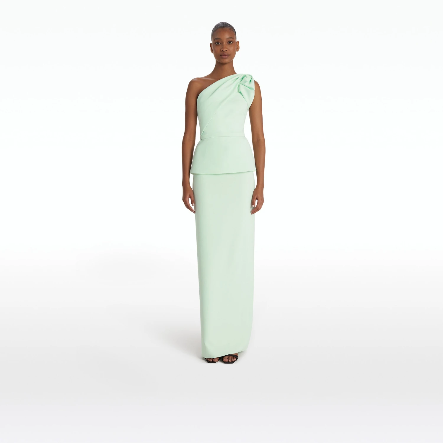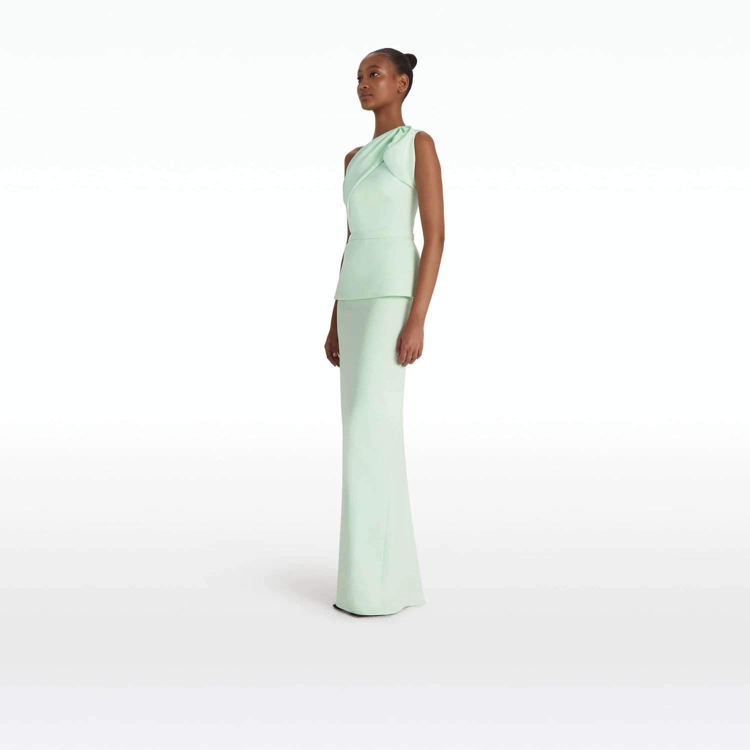 Bustier top with wave drape and simple peplum in sea glass Heavy Crepe.