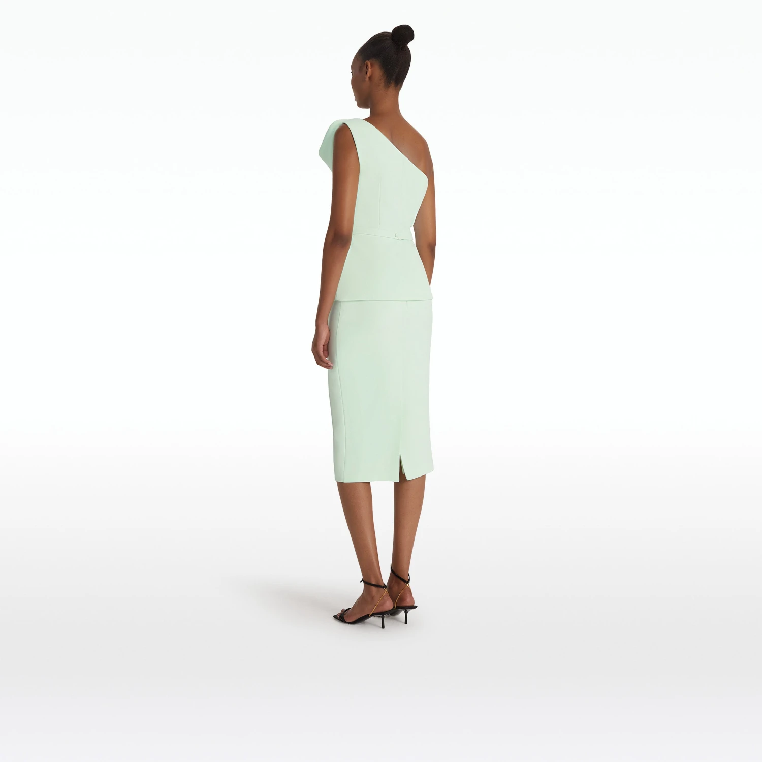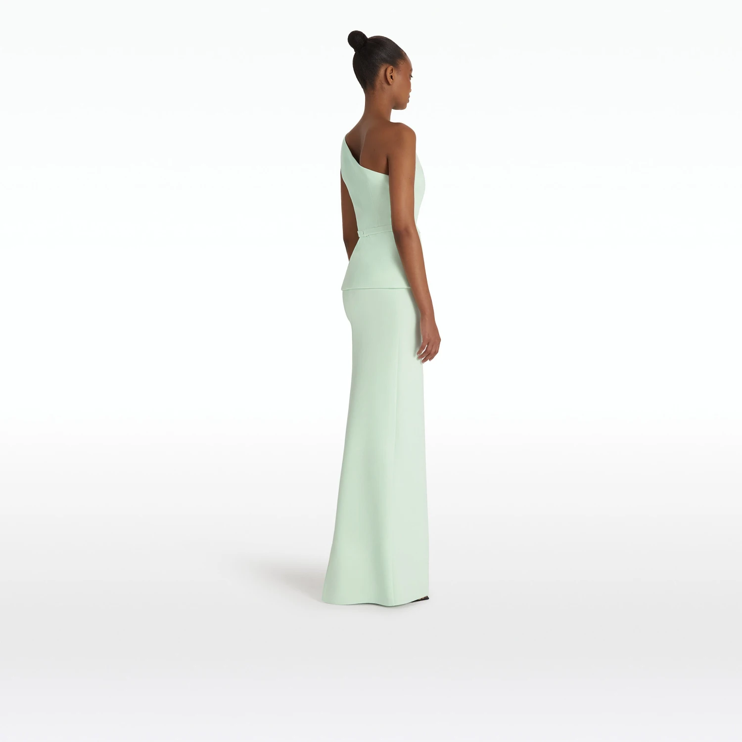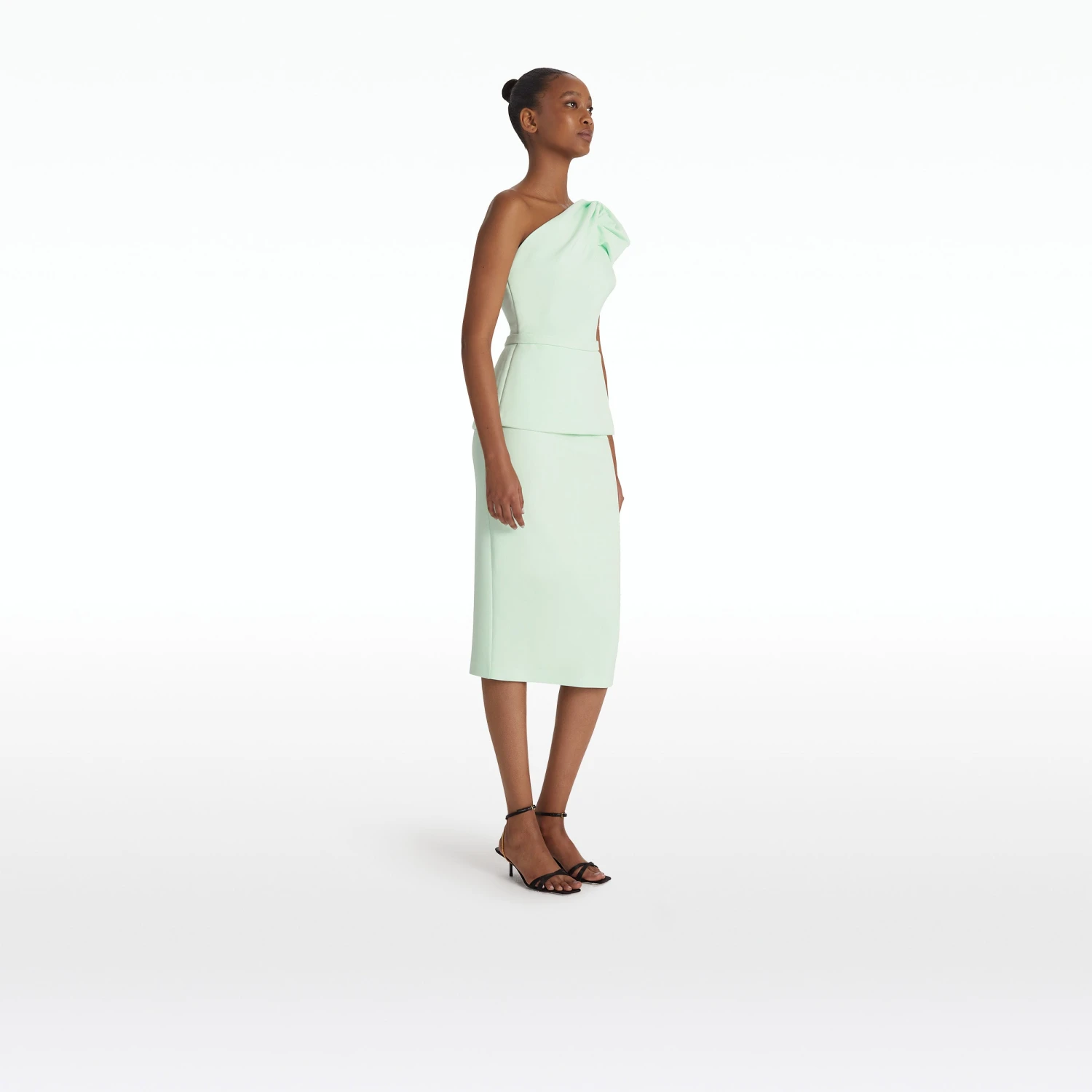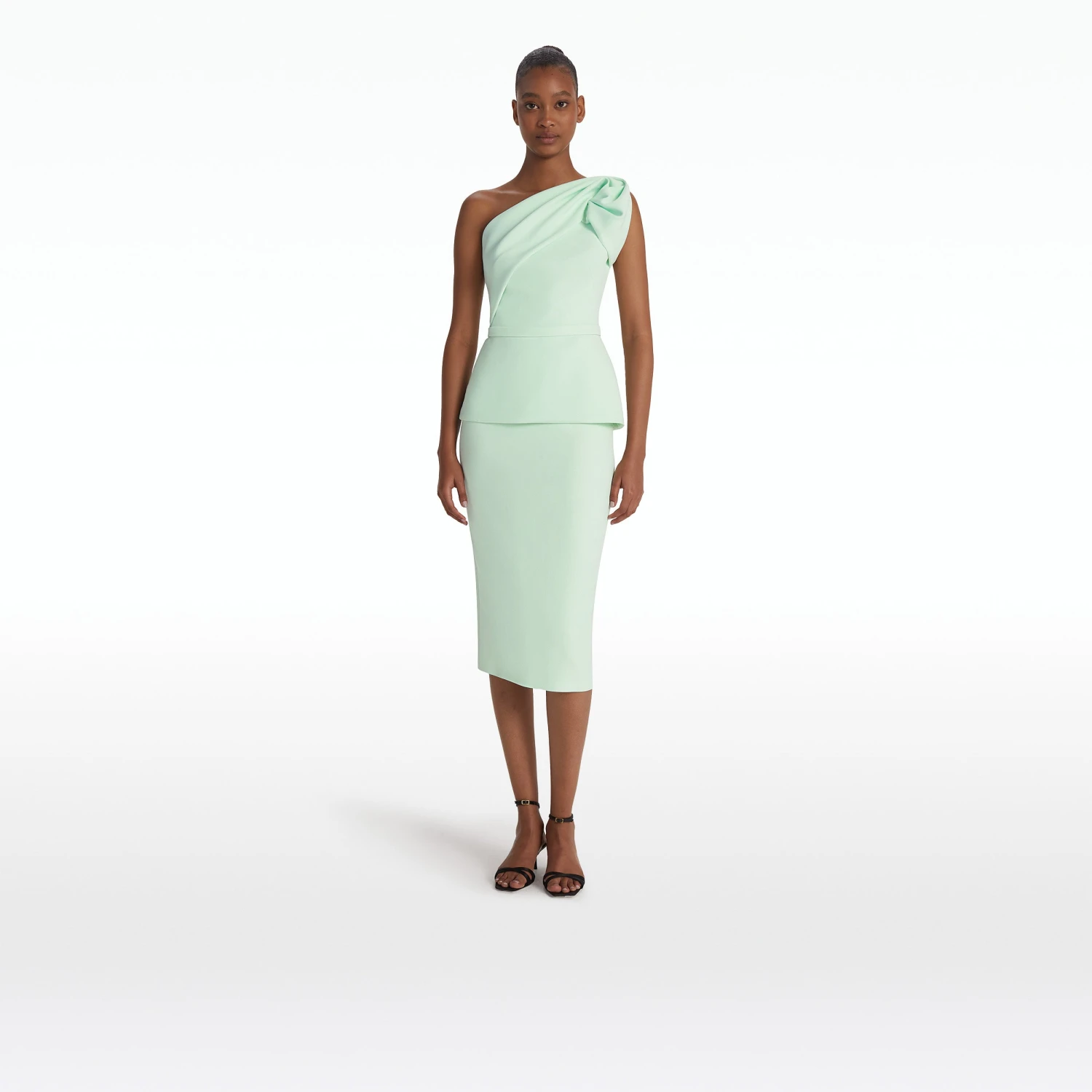 Bustier top with wave drape and simple peplum in sea glass Heavy Crepe.