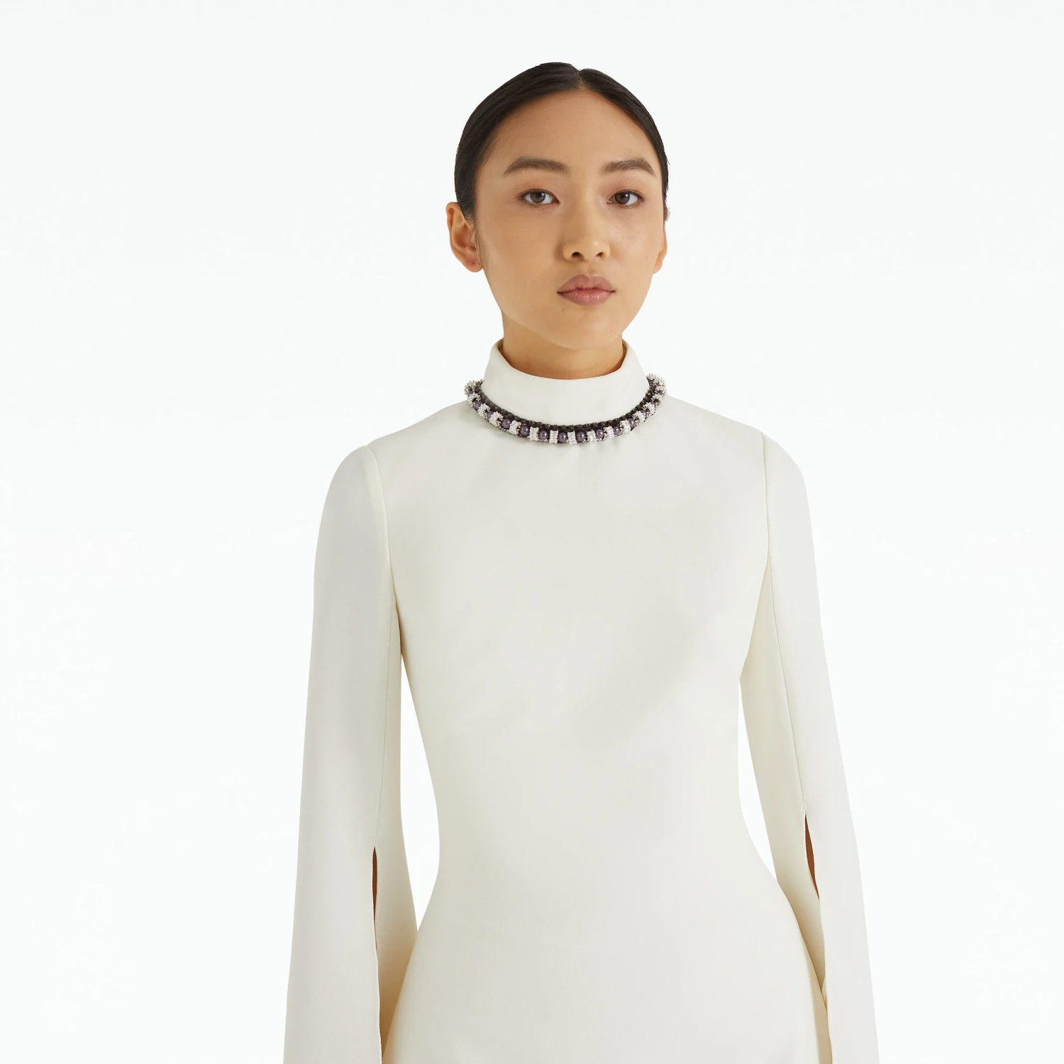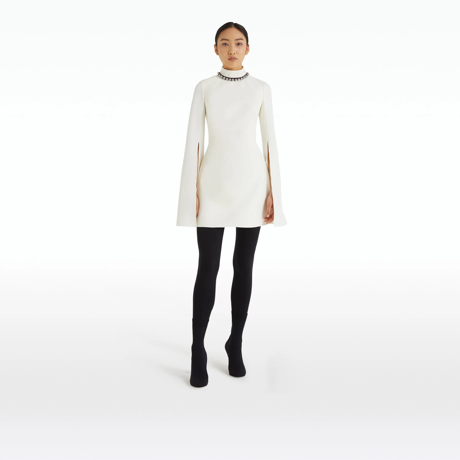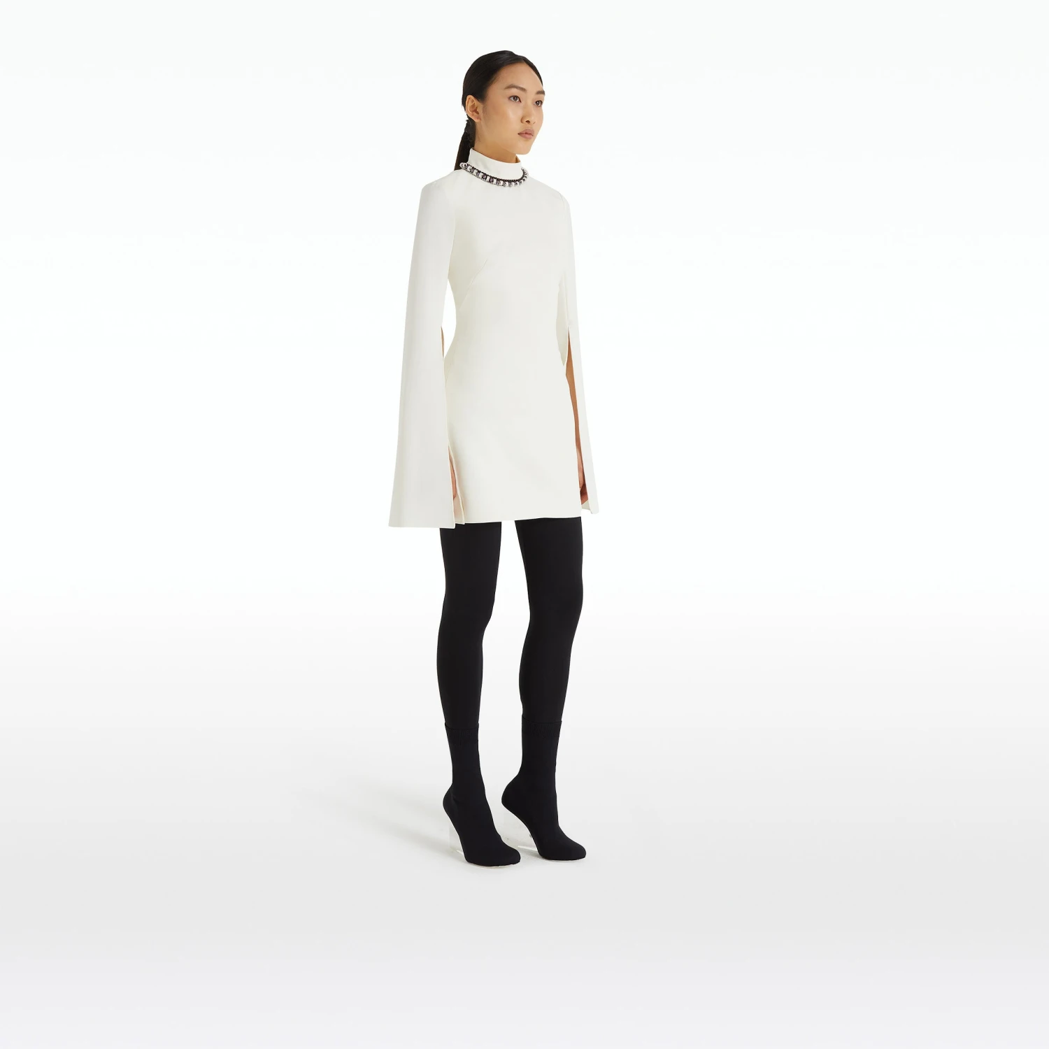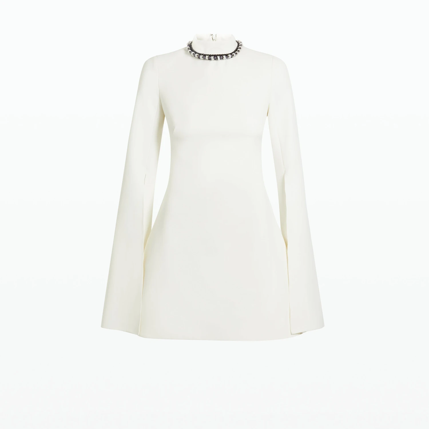Mini A-line dress with split sleeve and high neck in ivory Heavy Crepe with gunmetal Ursa Trim embroidery.