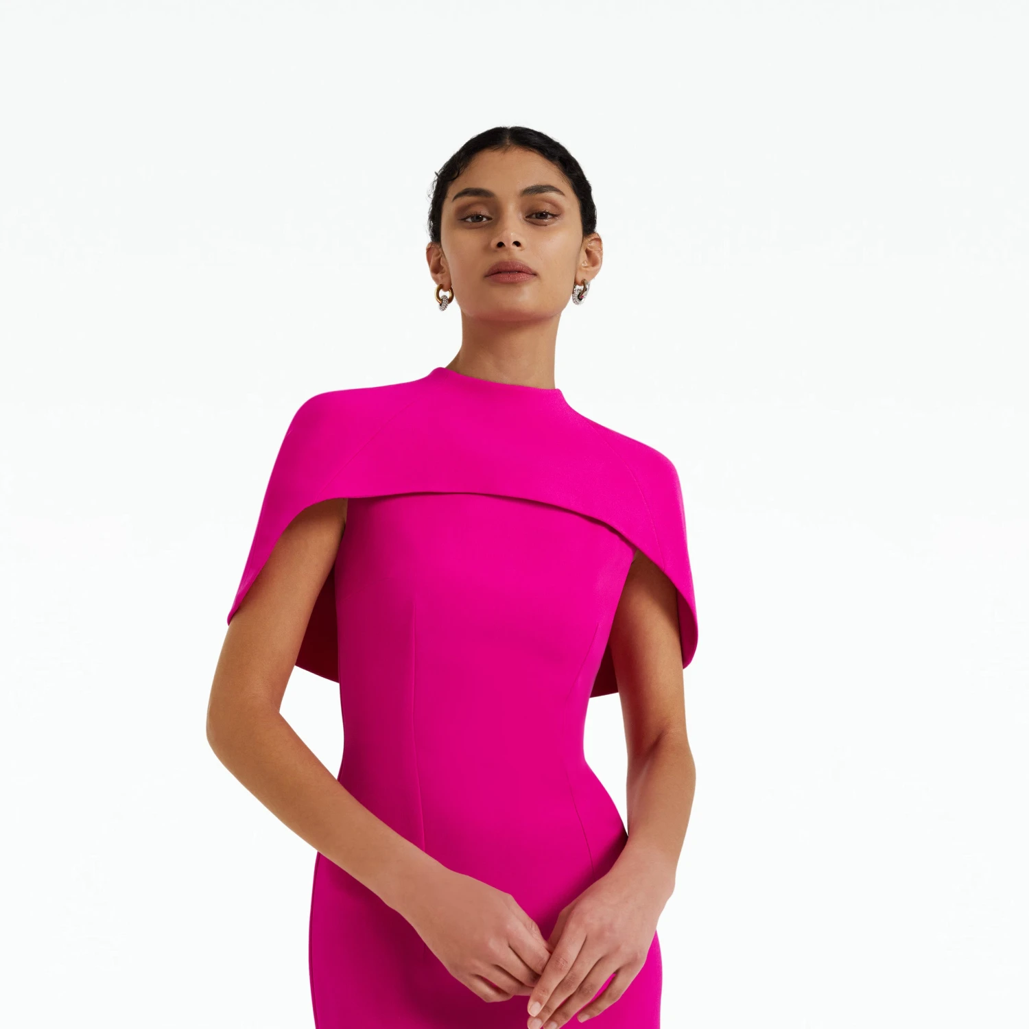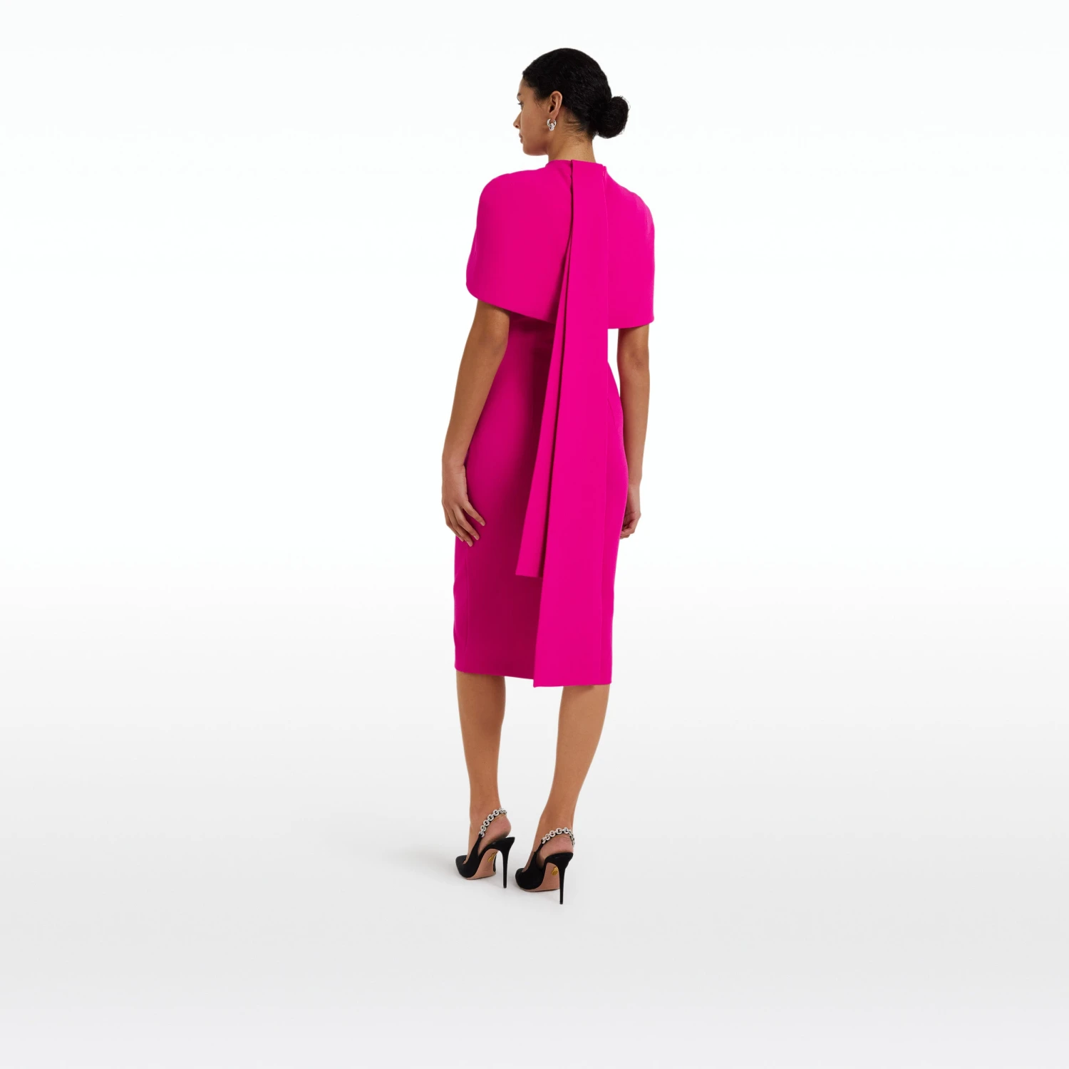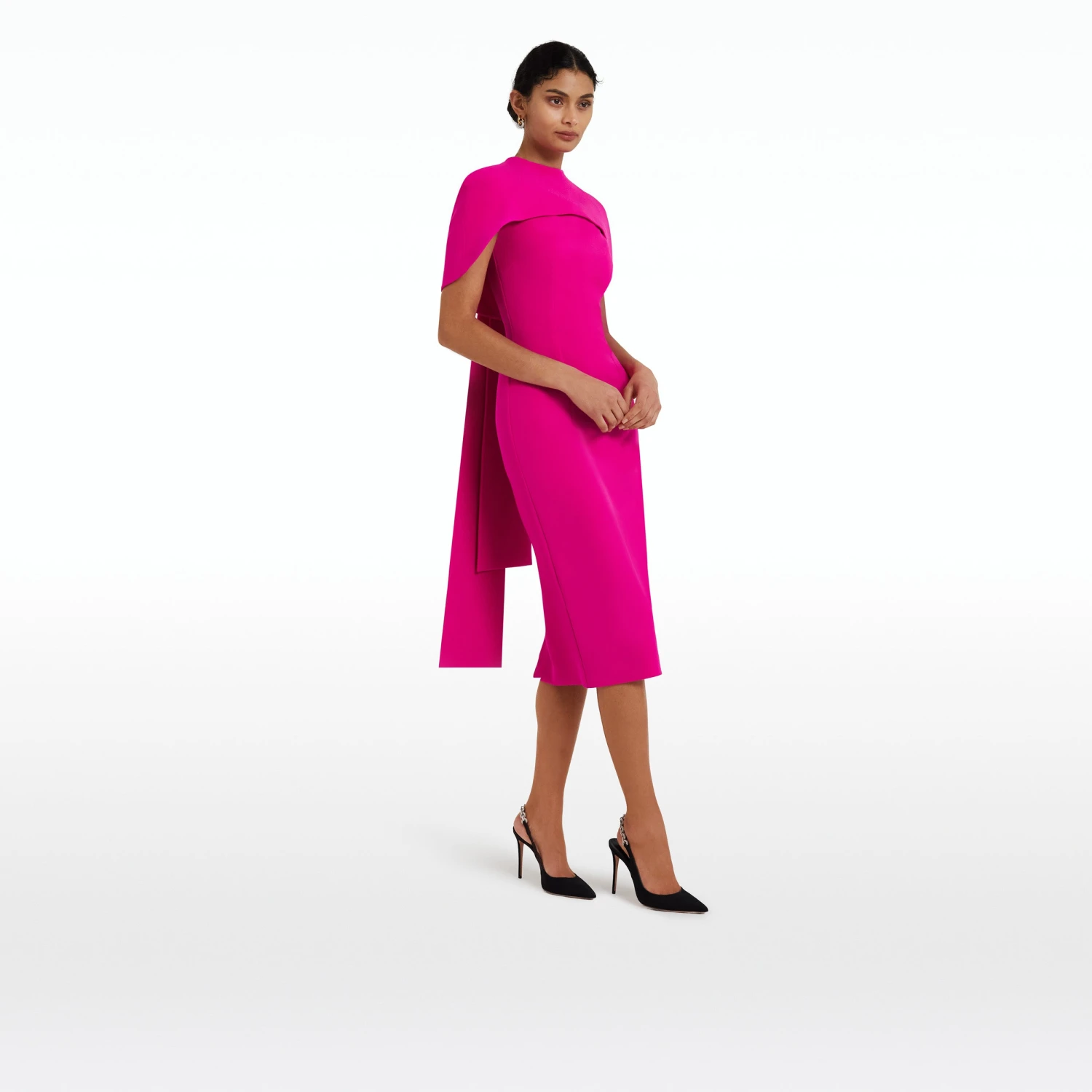 Raised collar midi dress shoulder cape and back drape detail in wild strawberry.Item fully lined.