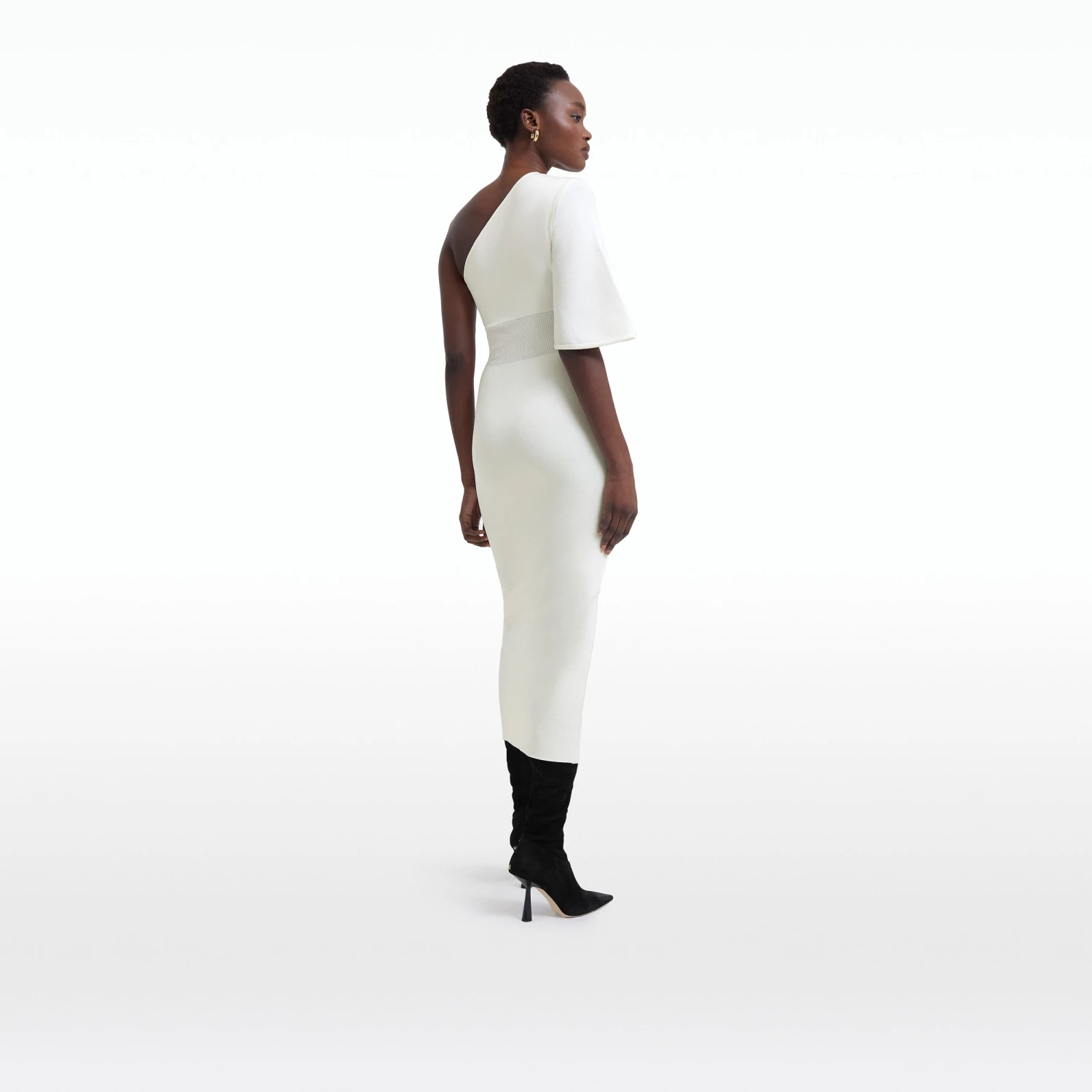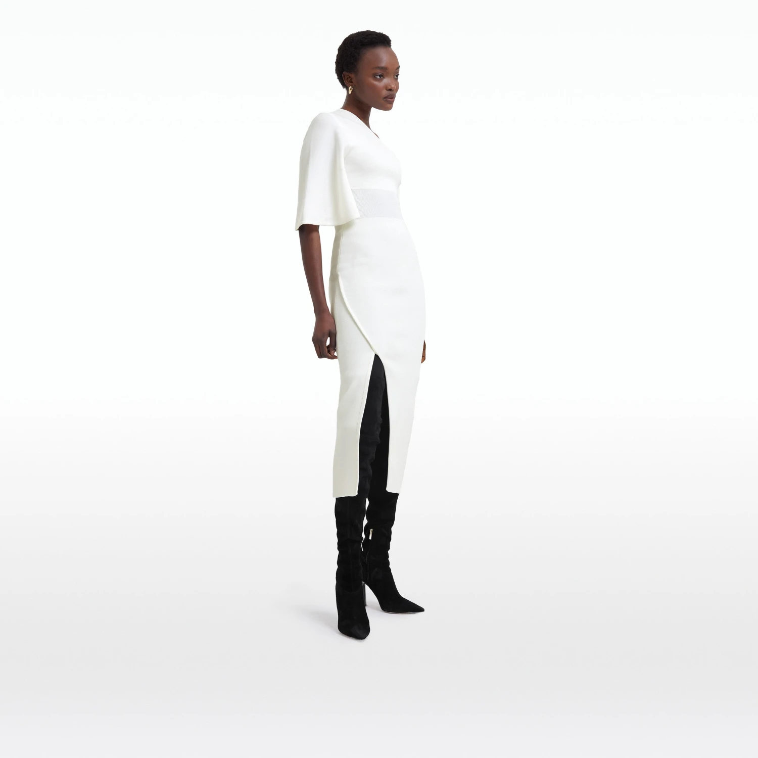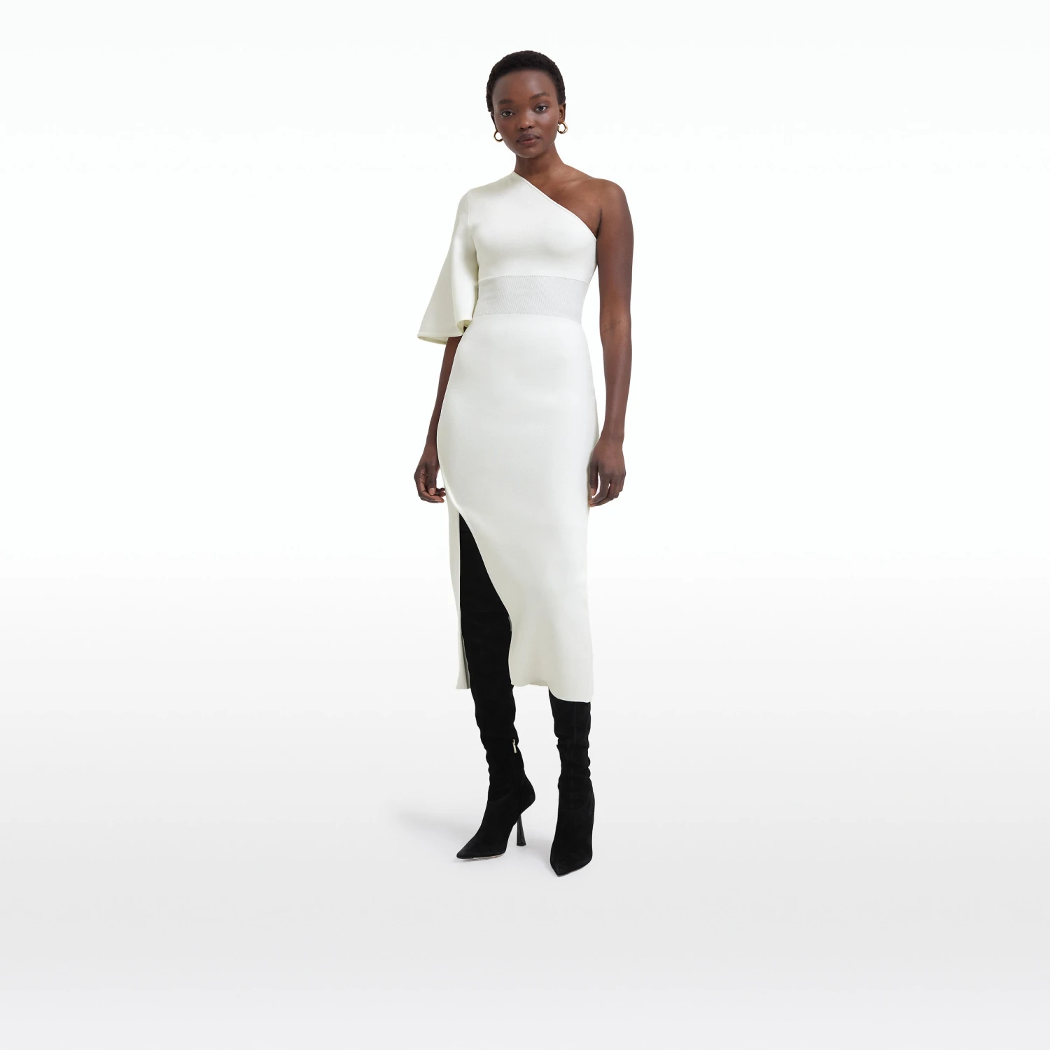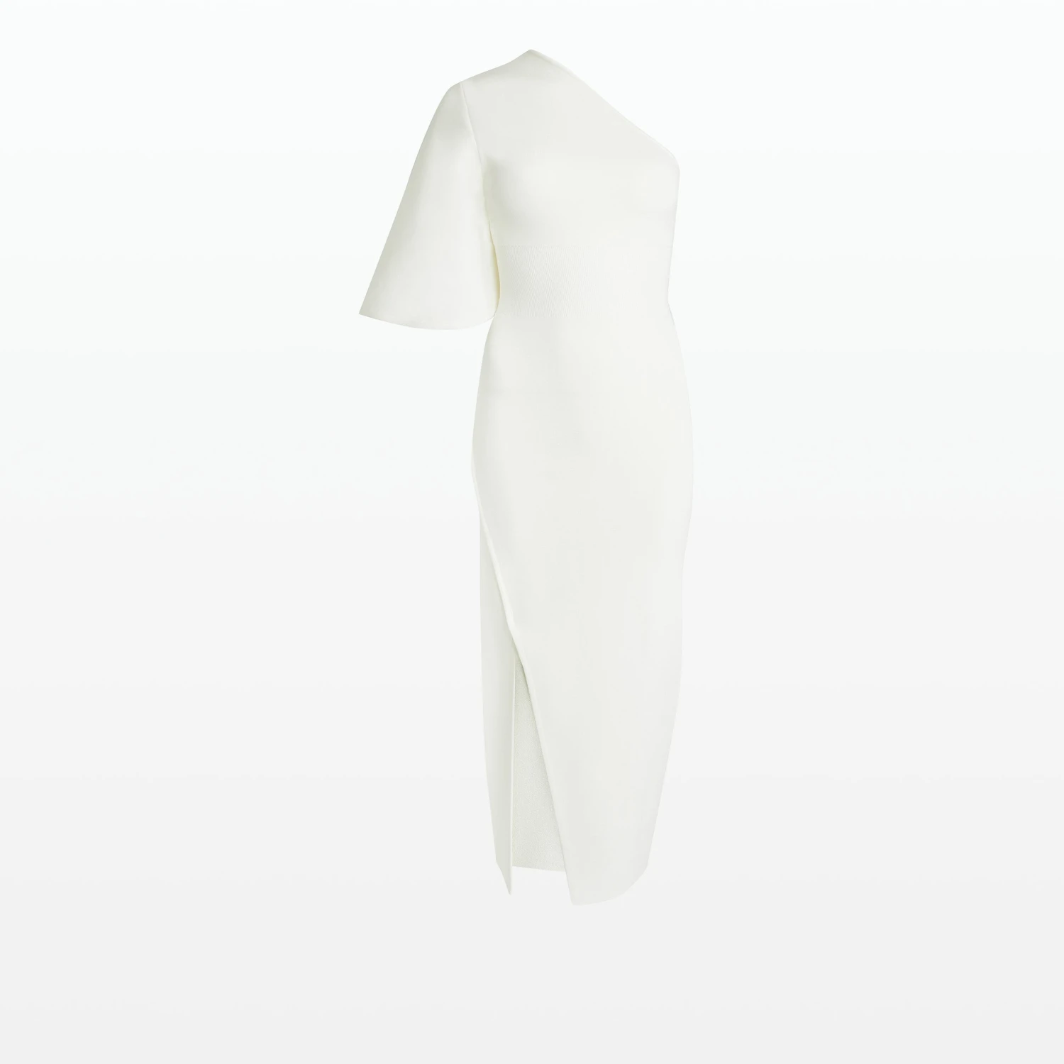 Asymmetric dress wih overlay skirt and caped sleeve in ivory.