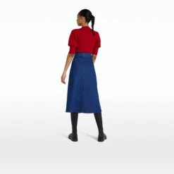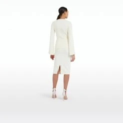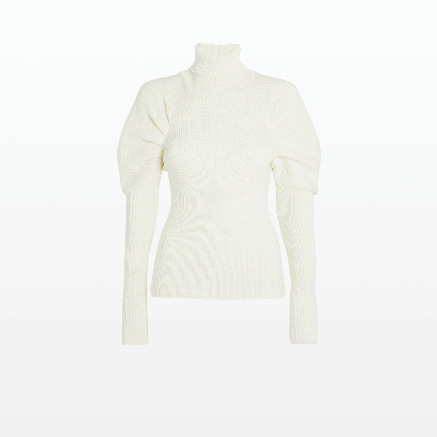 Long sleeve turtle neck knit with panelled blouson detail in ivory wool.