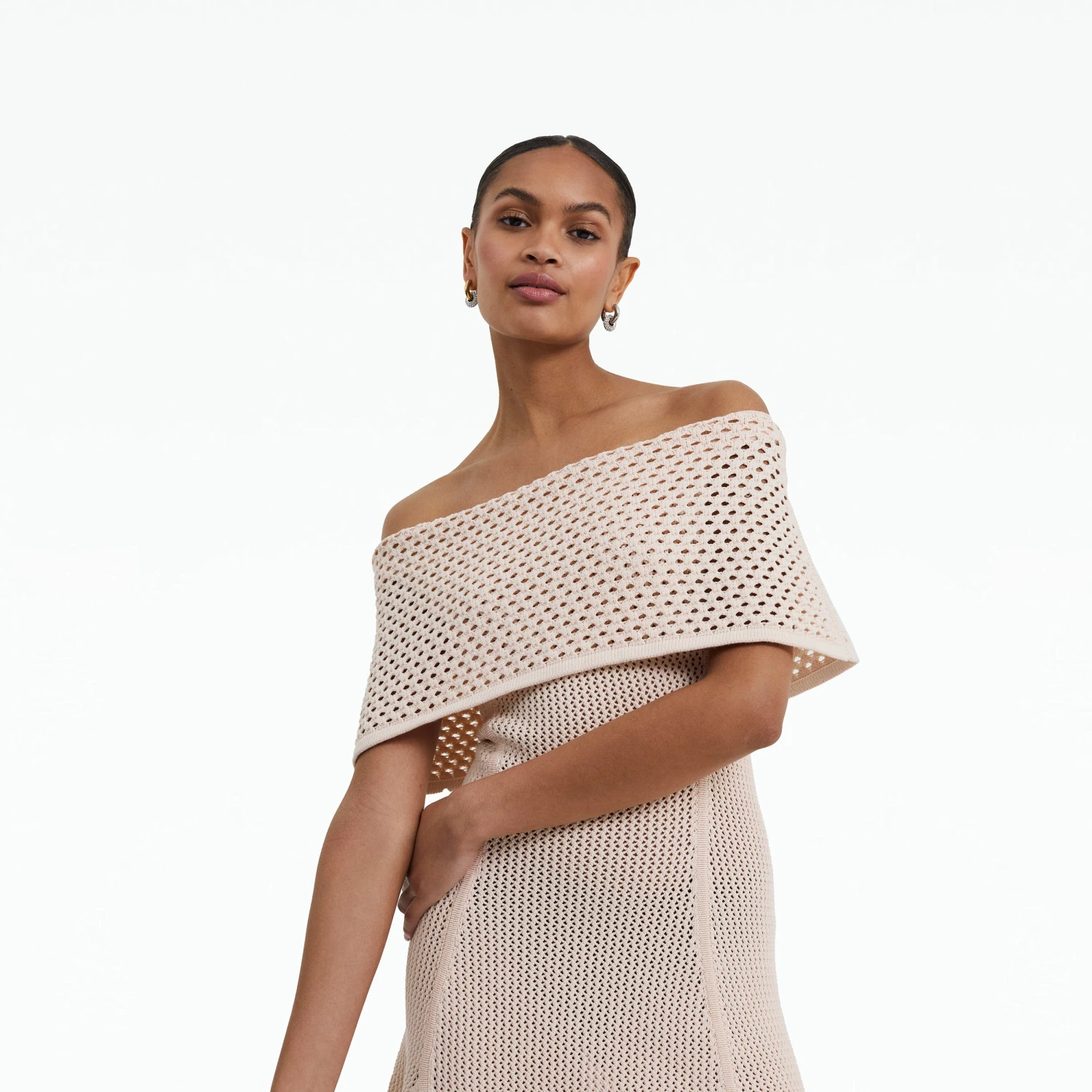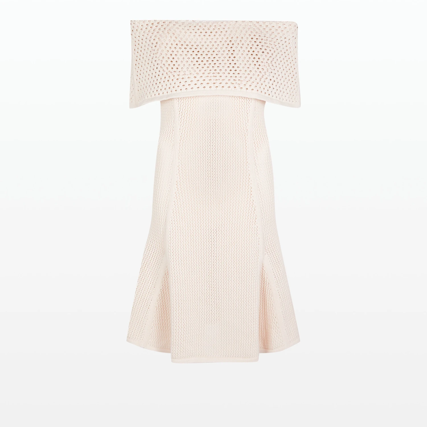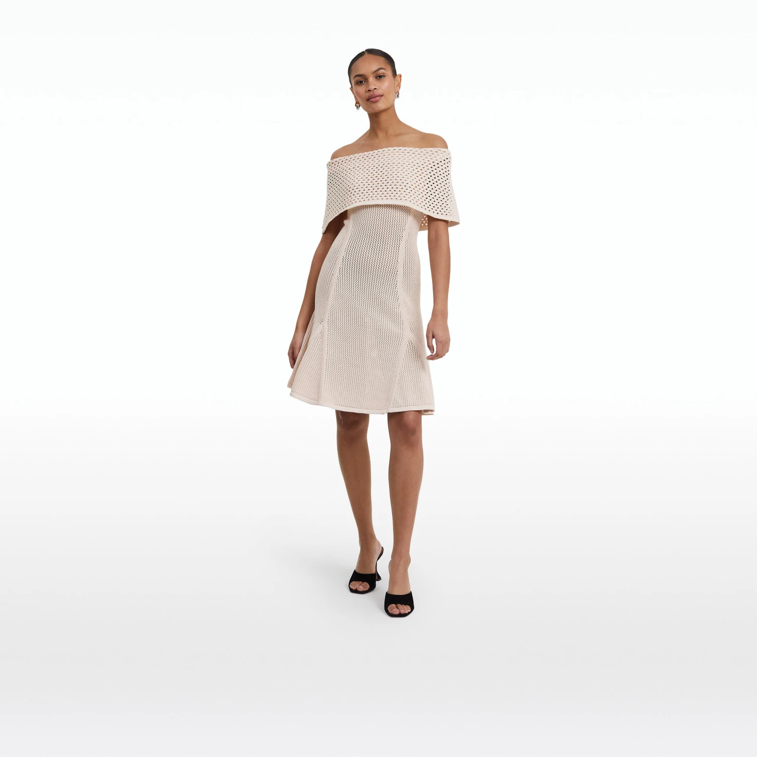 Off the shoulder mini flared dress with wide band overlay in nouvelle peach.