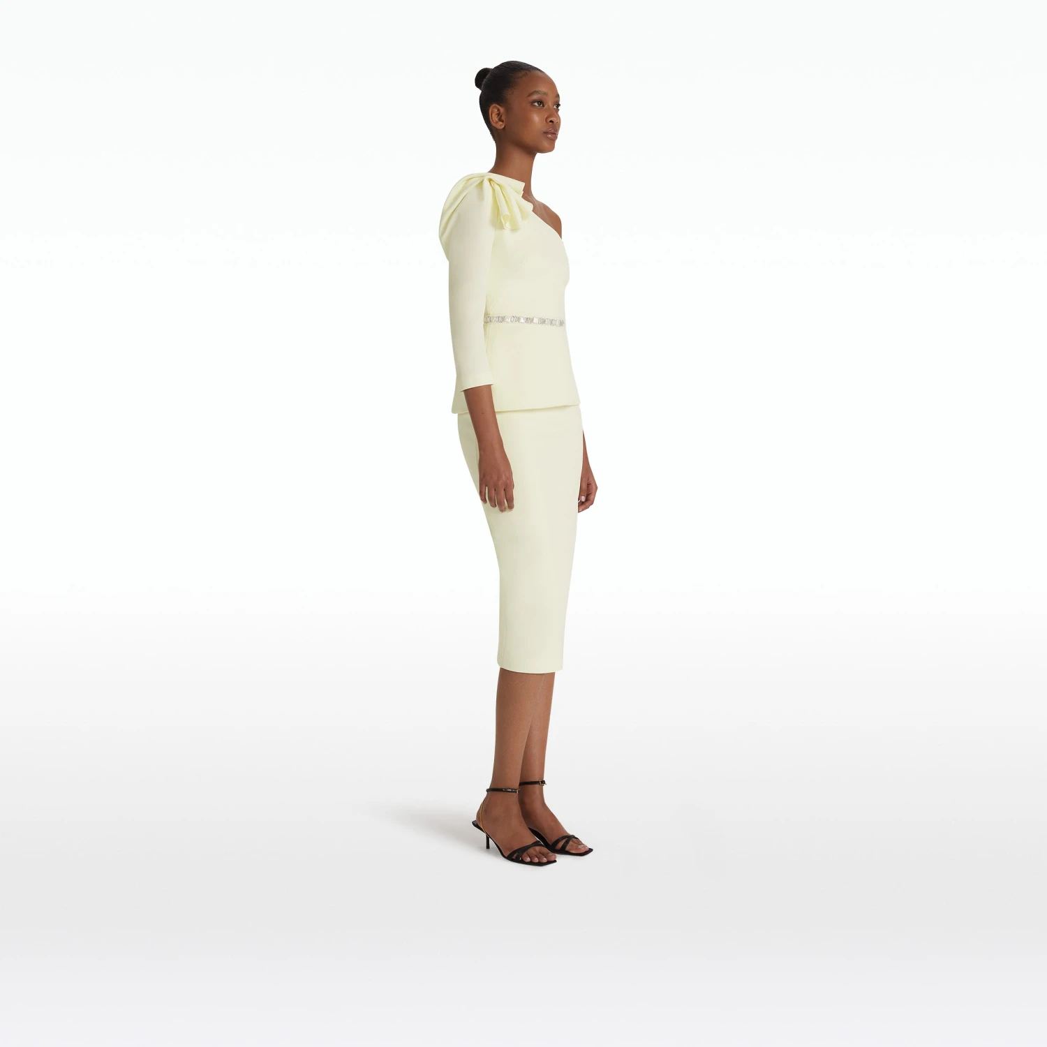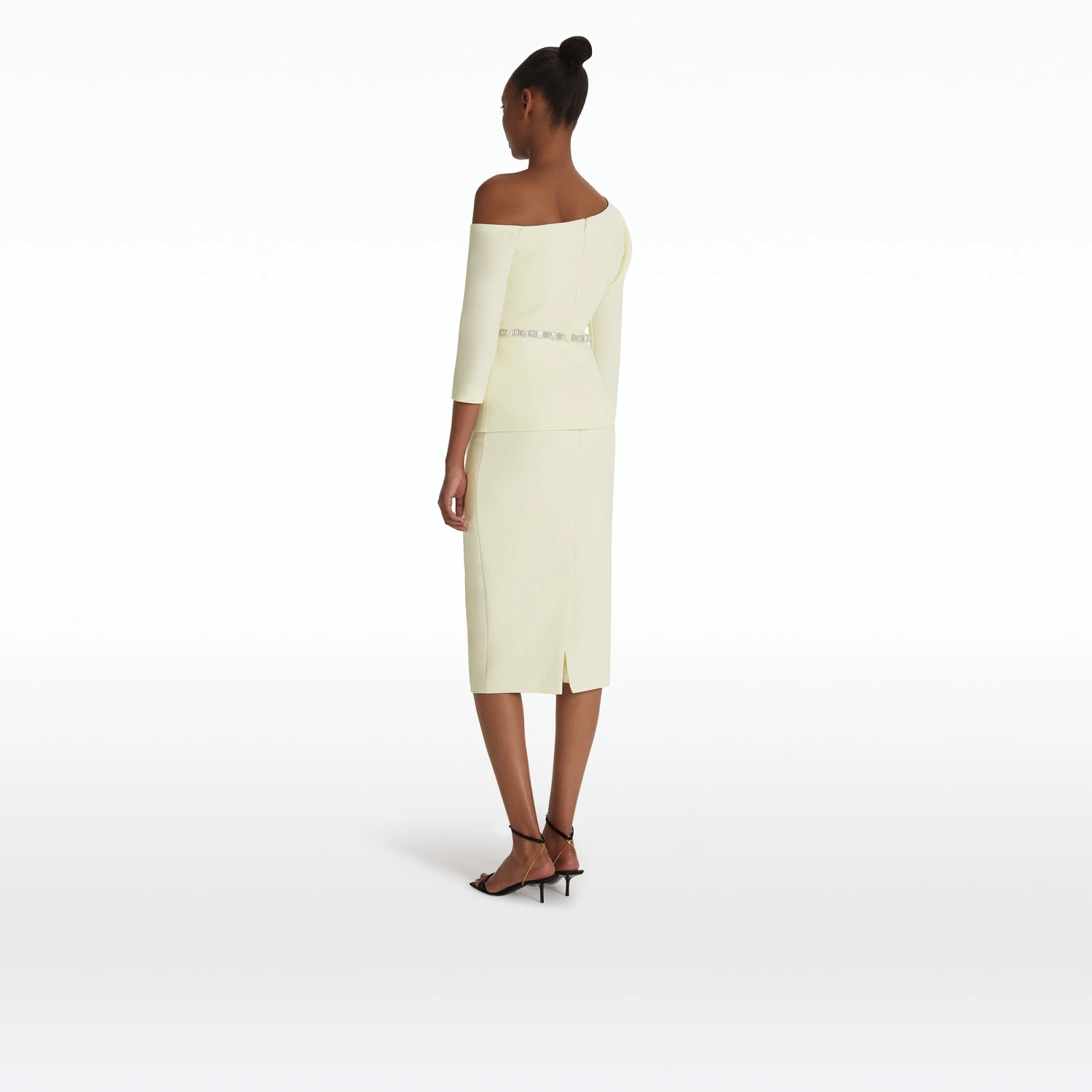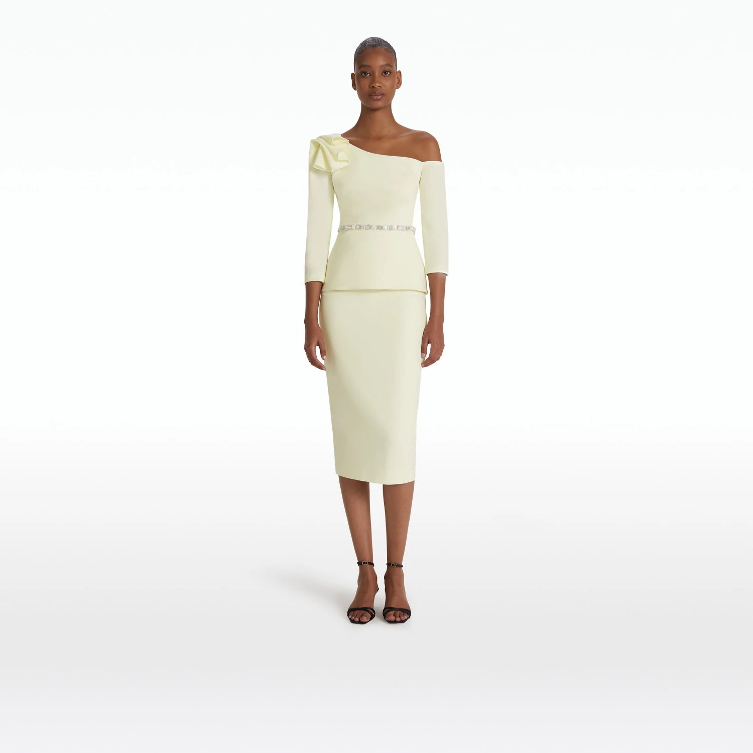 Top with asymmetric neckline and peplum in sorbet Heavy Crepe with pearl Haliotis Trim embroidery.