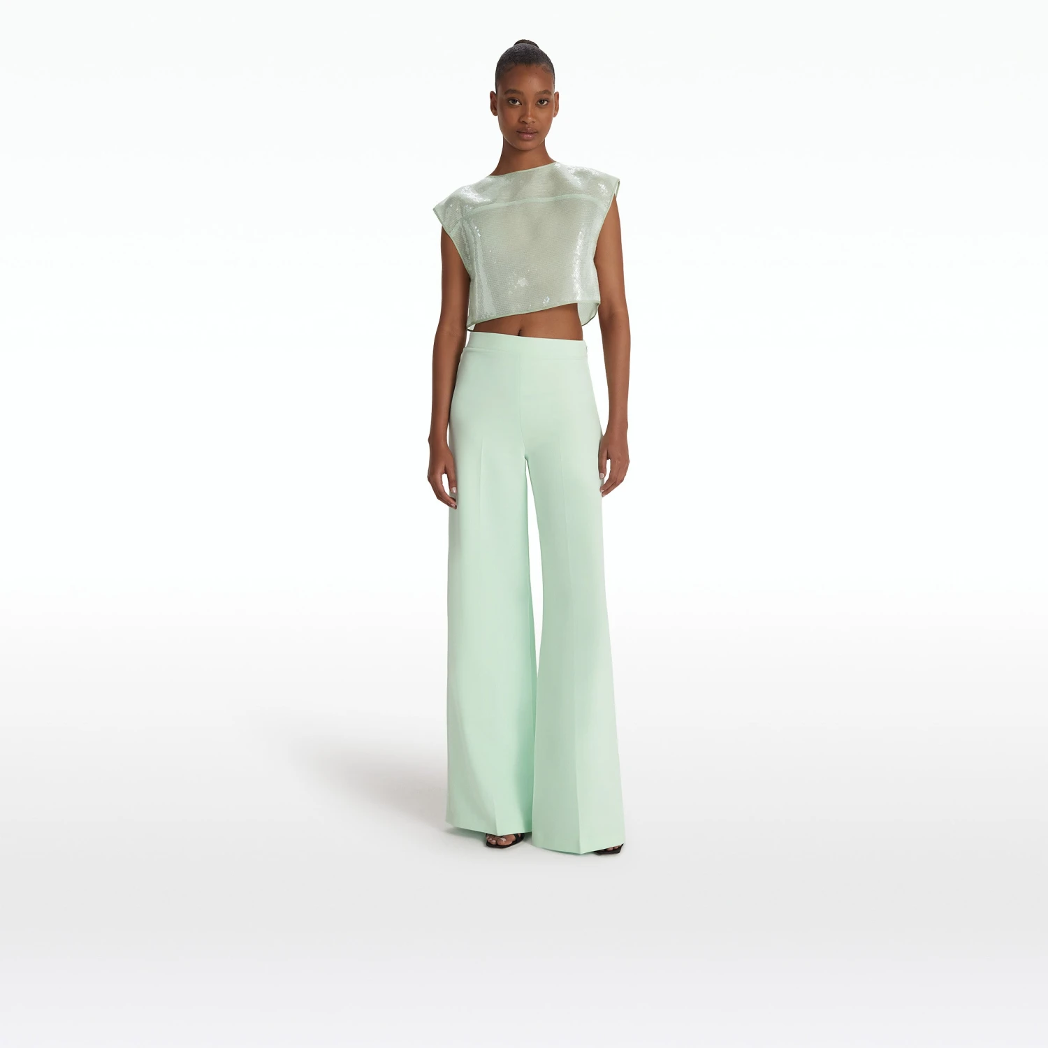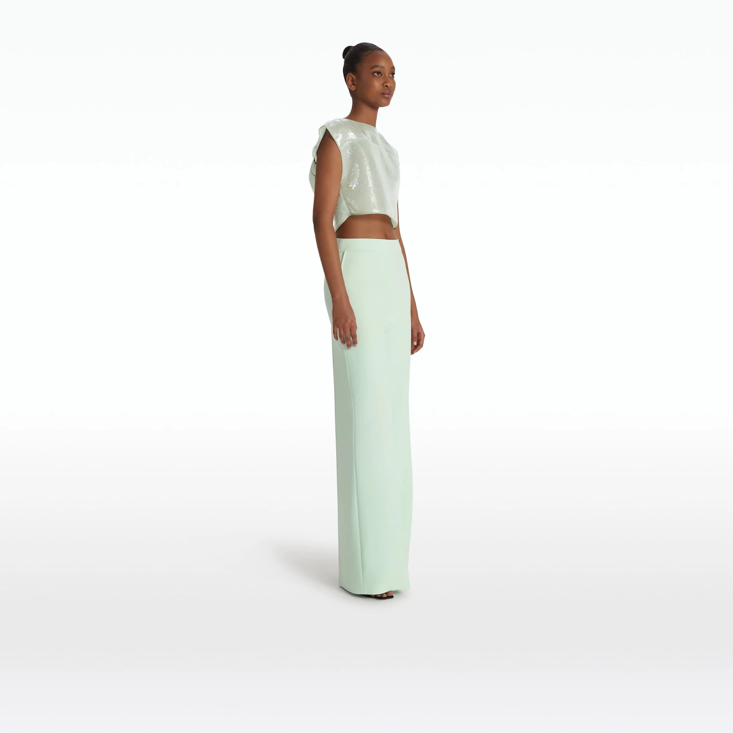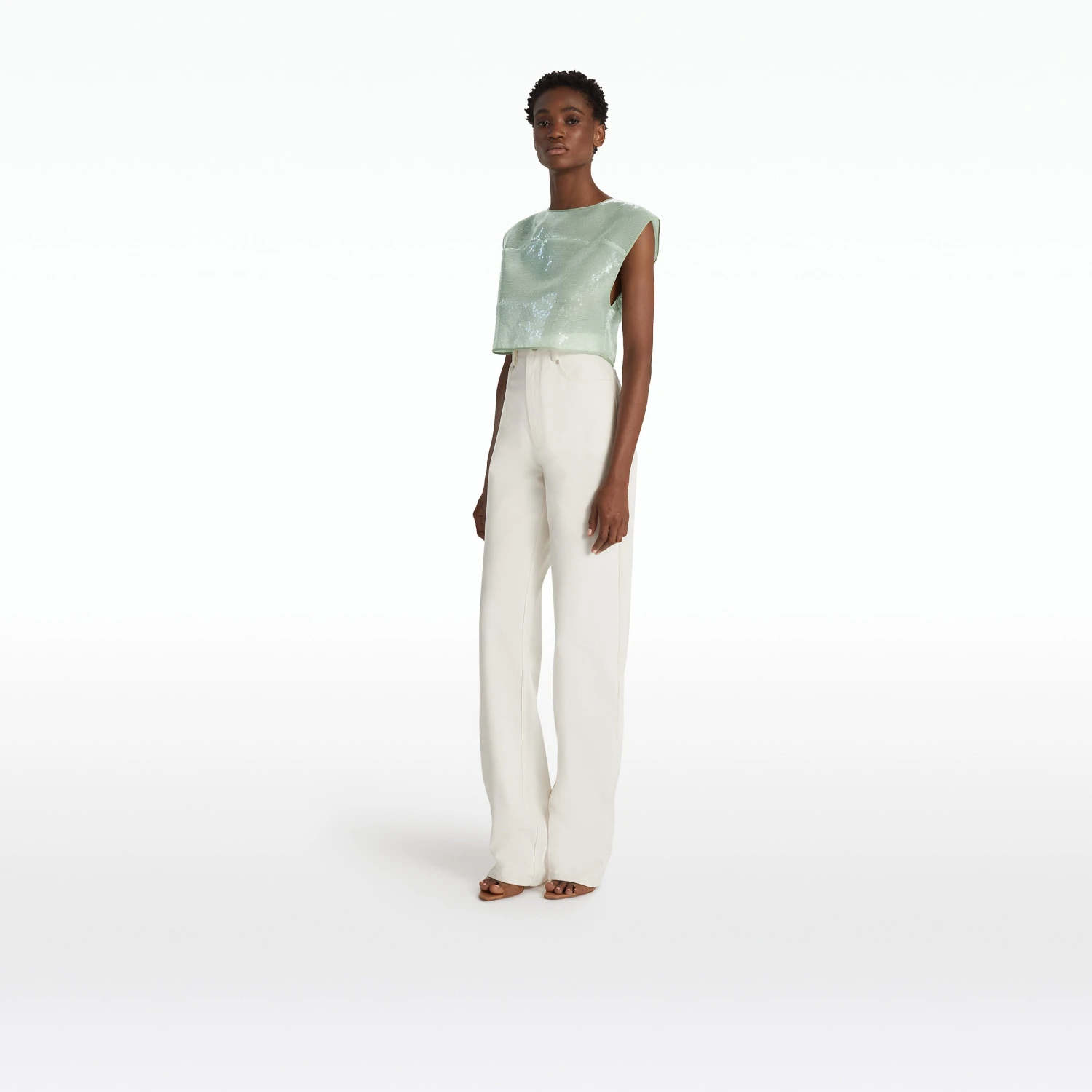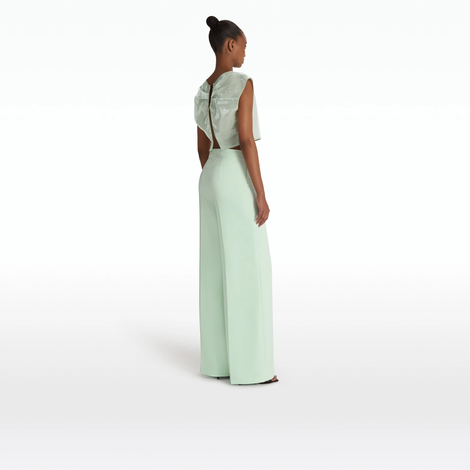 Cropped, open back top with yolk detail in sea glass Calypso Sequin.
