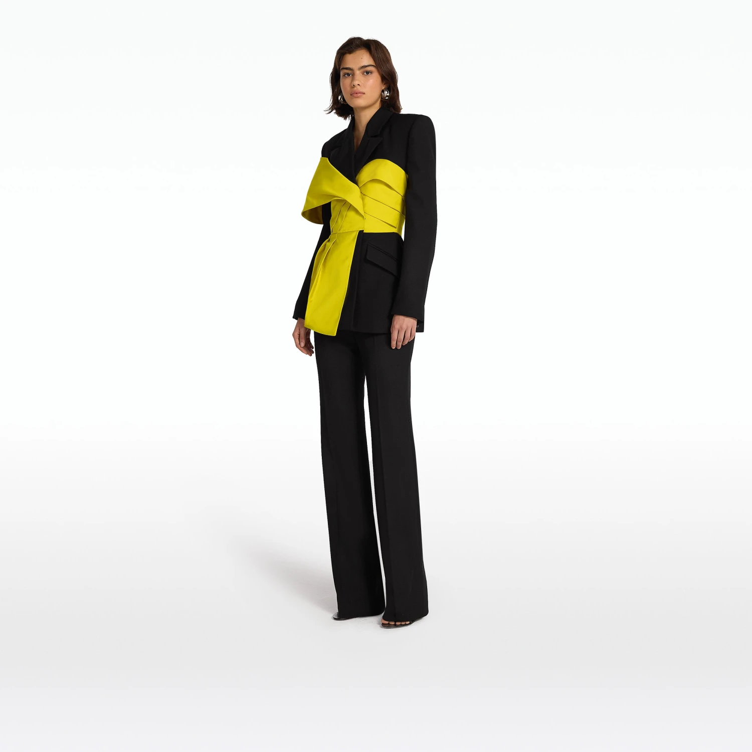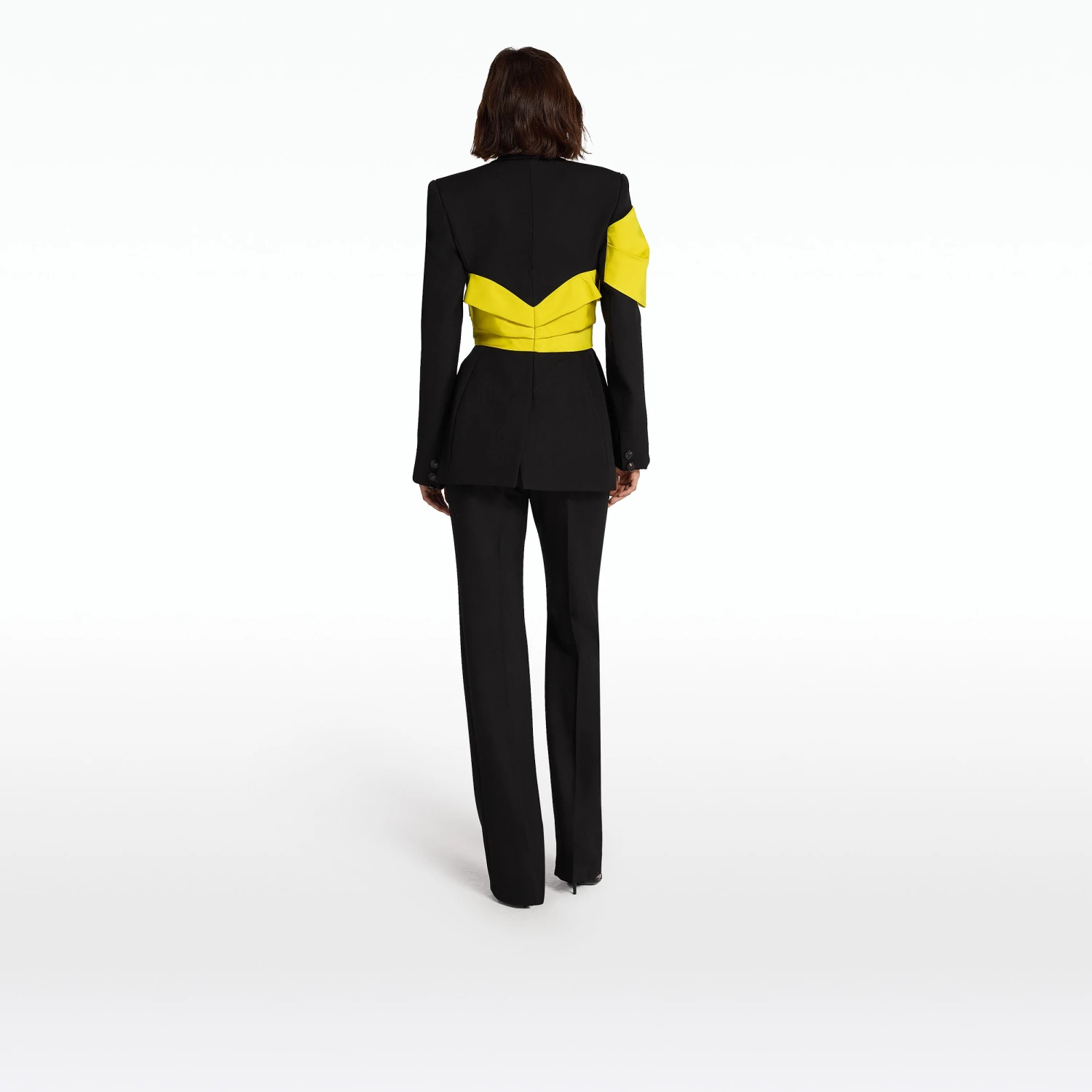 Classic blazer with prominent shoulder and dramatic, off shoulder, contrast drape in chartreuse Faille on black Damon Wool.