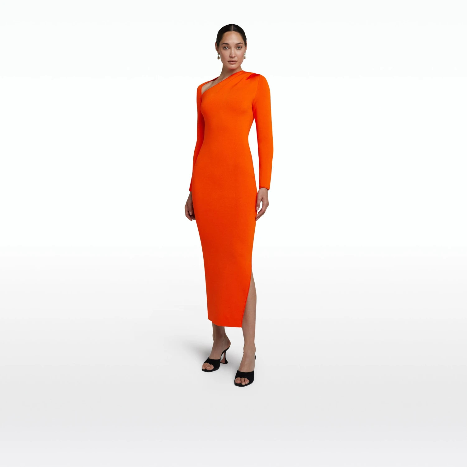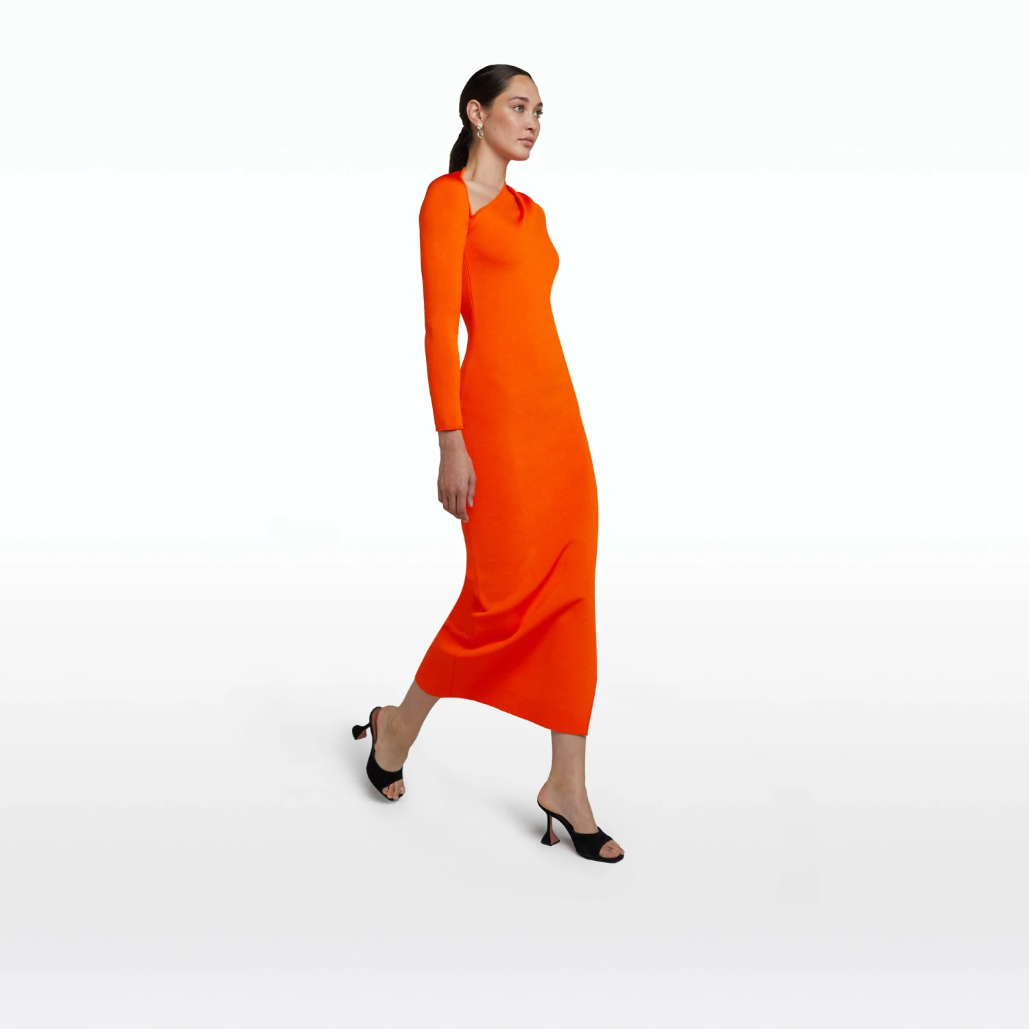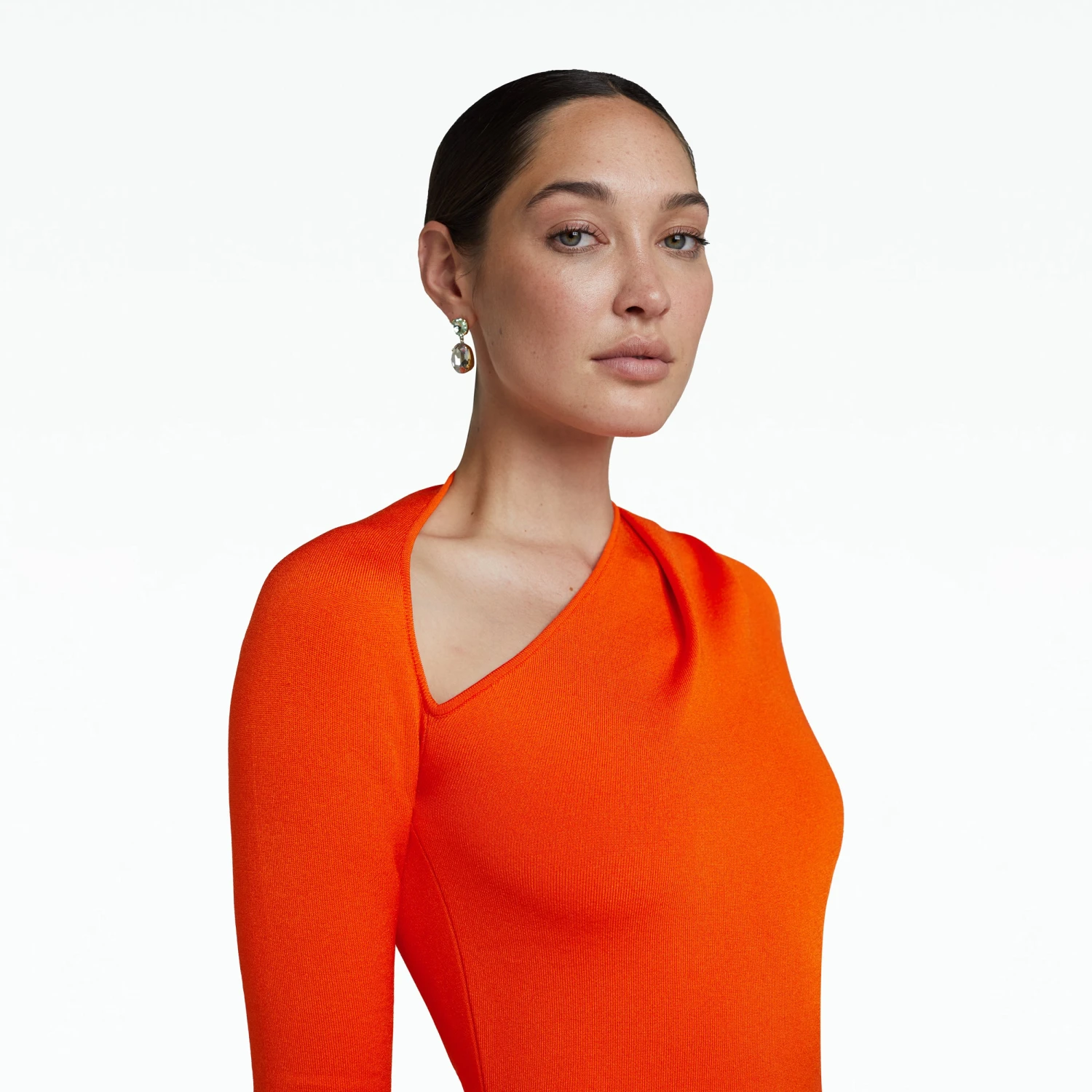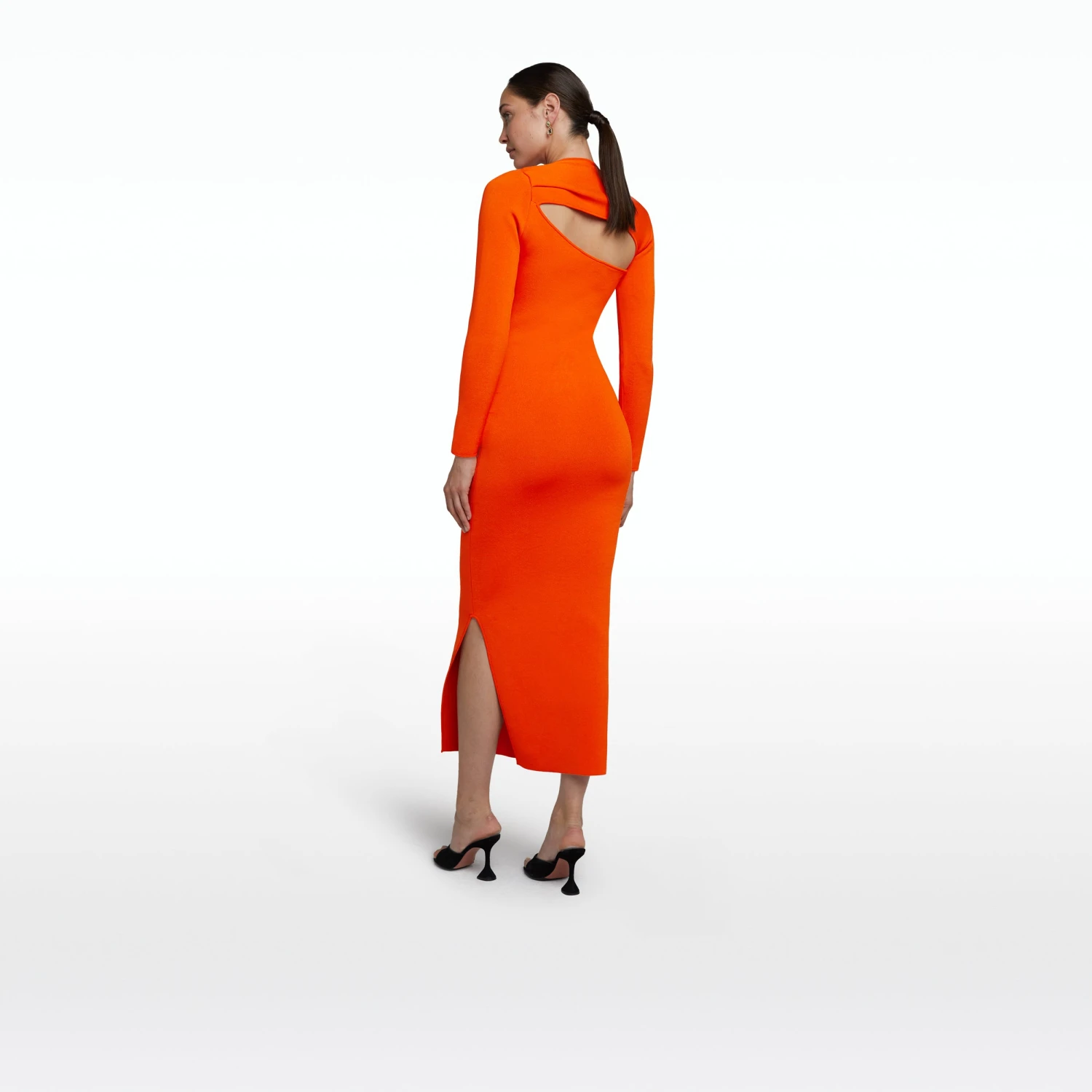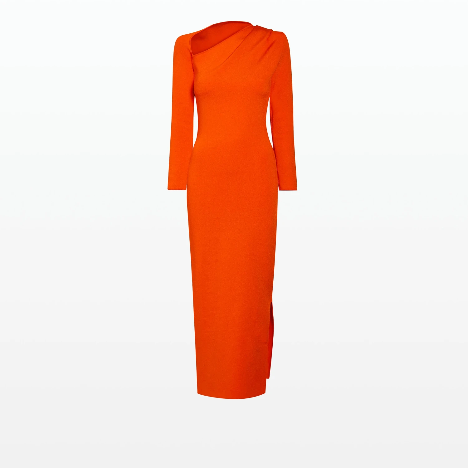 Ankle length fitted dress with side slit, twisted aymmetric neckline and cut out detail in flame Thin Bodycon Knit.