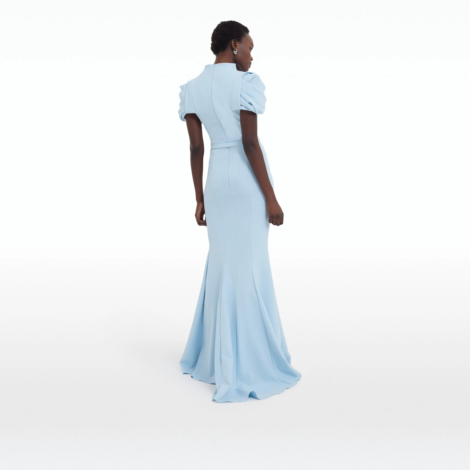 Long dress with scooped neckline with raised back and intertwined sleeve drape in pale blue.