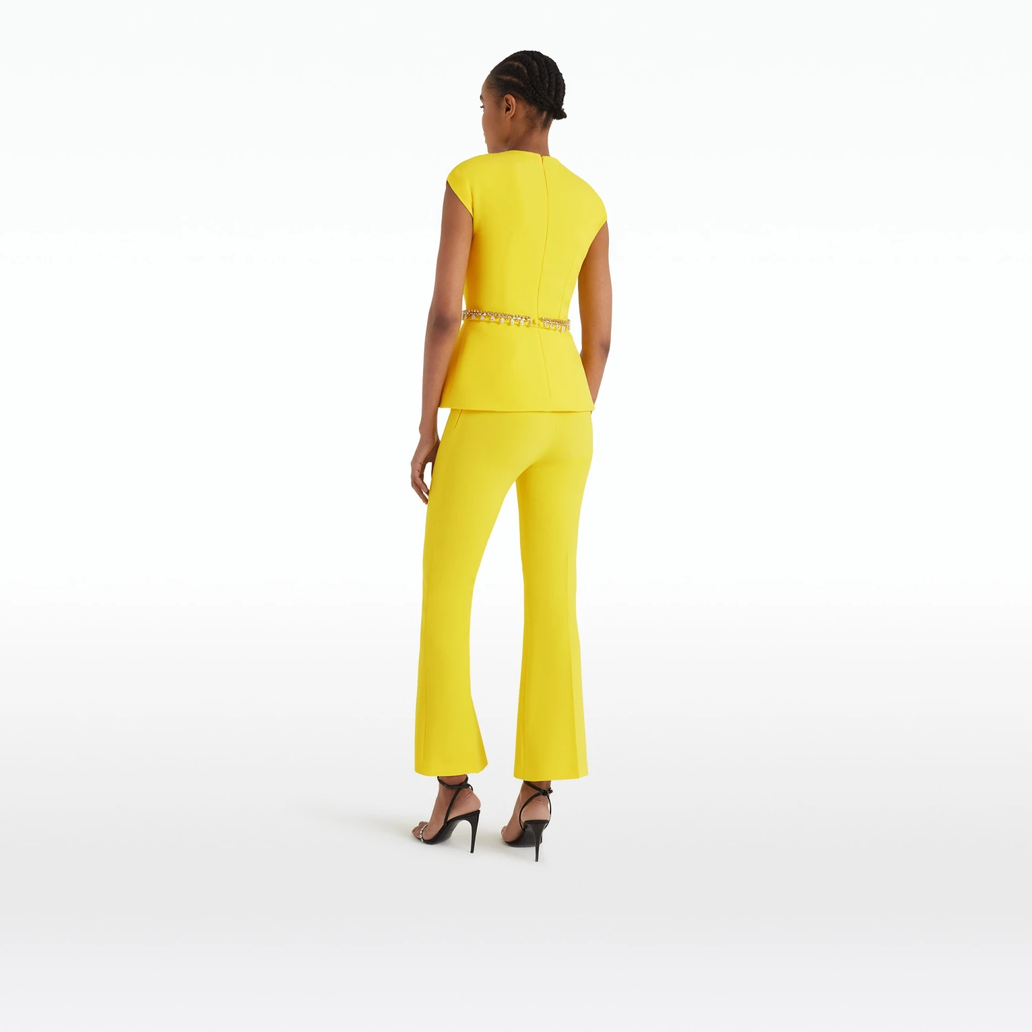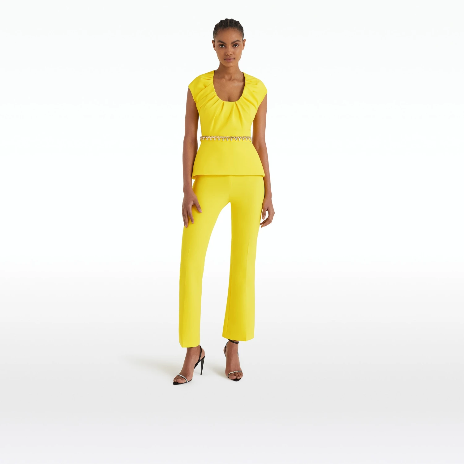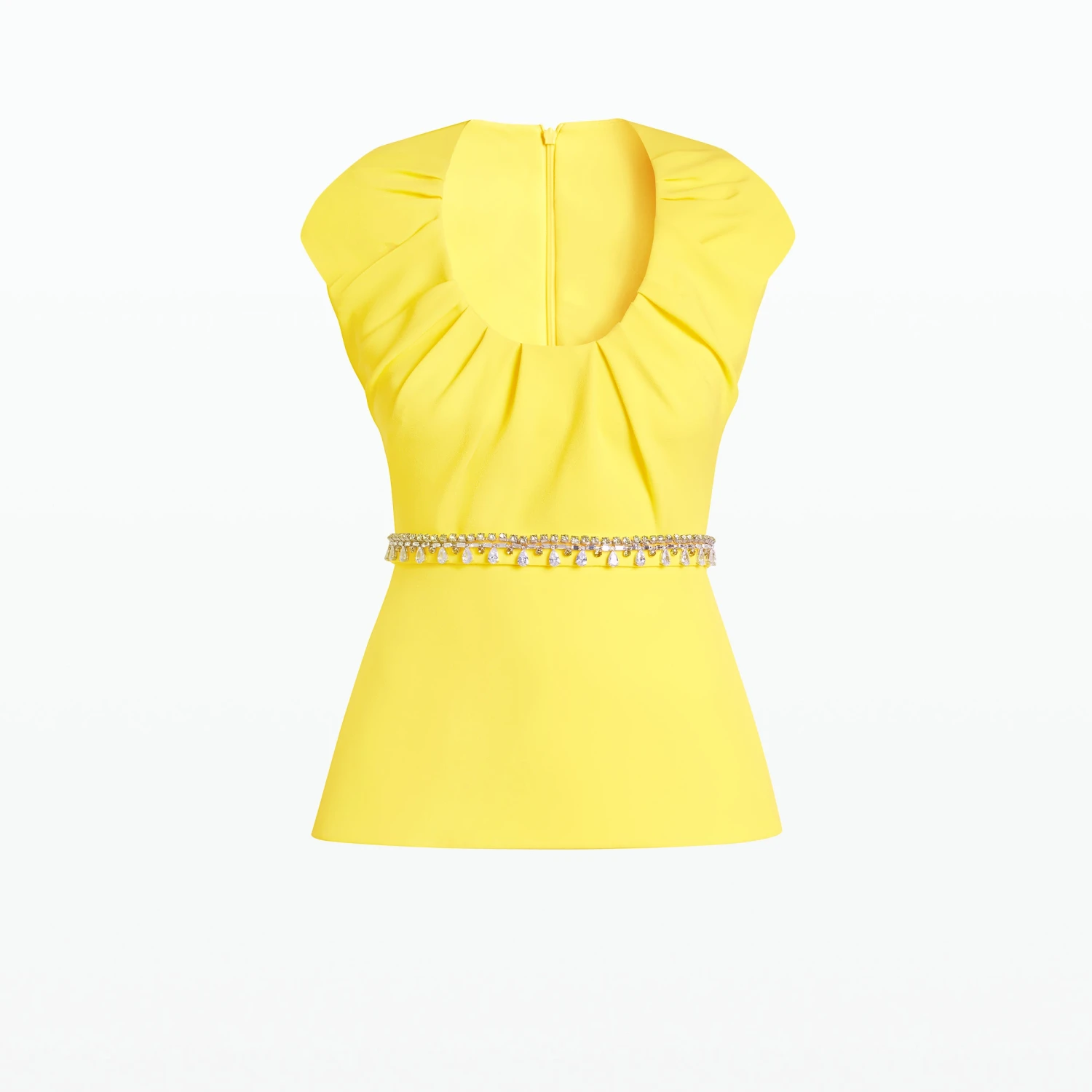 Capped sleeve top with simple peplum and pleated neckline in buttercup Heavy Crepe and citrine Sirius Trim.