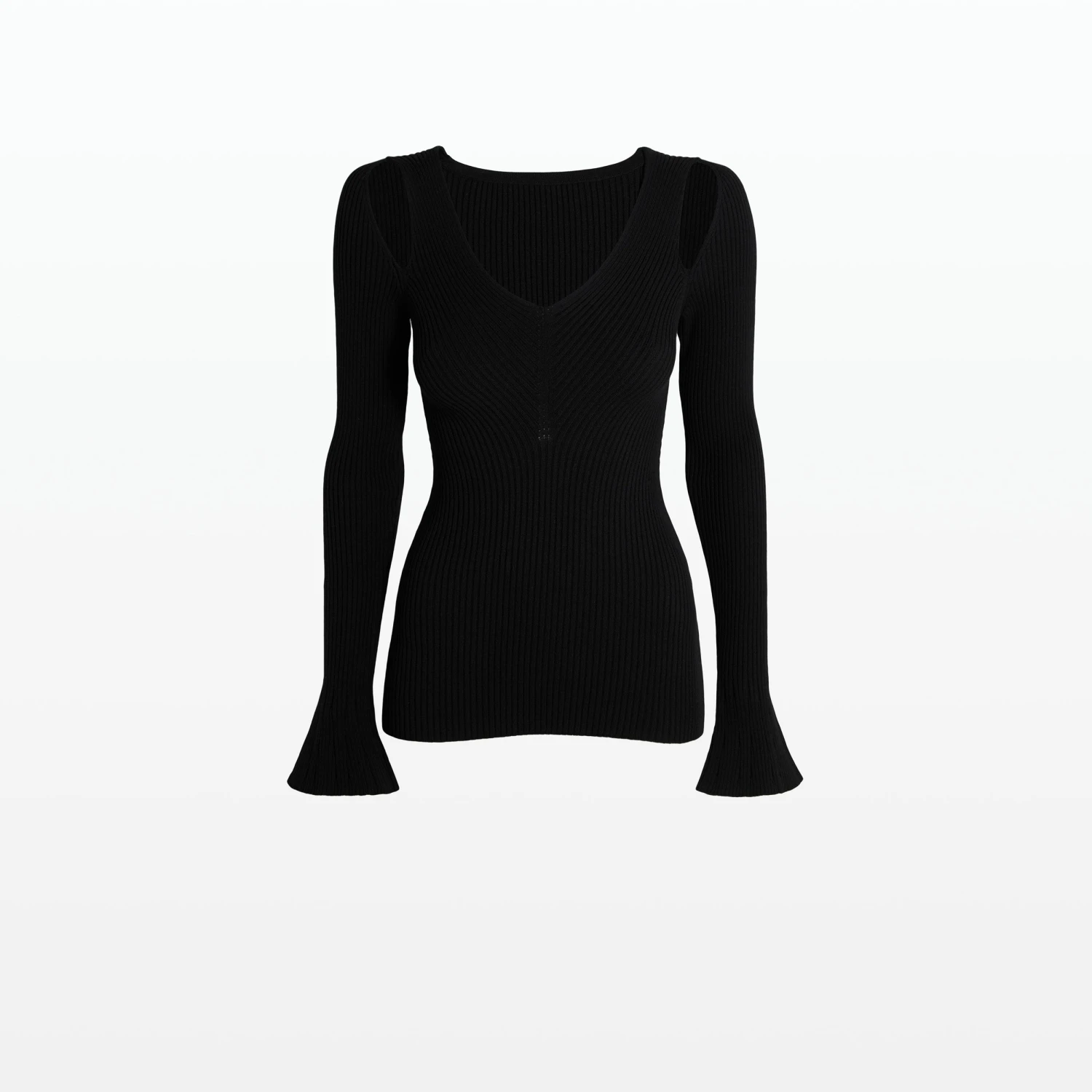 V neck sweater with flared sleeve and shoulder cut out detail in black.