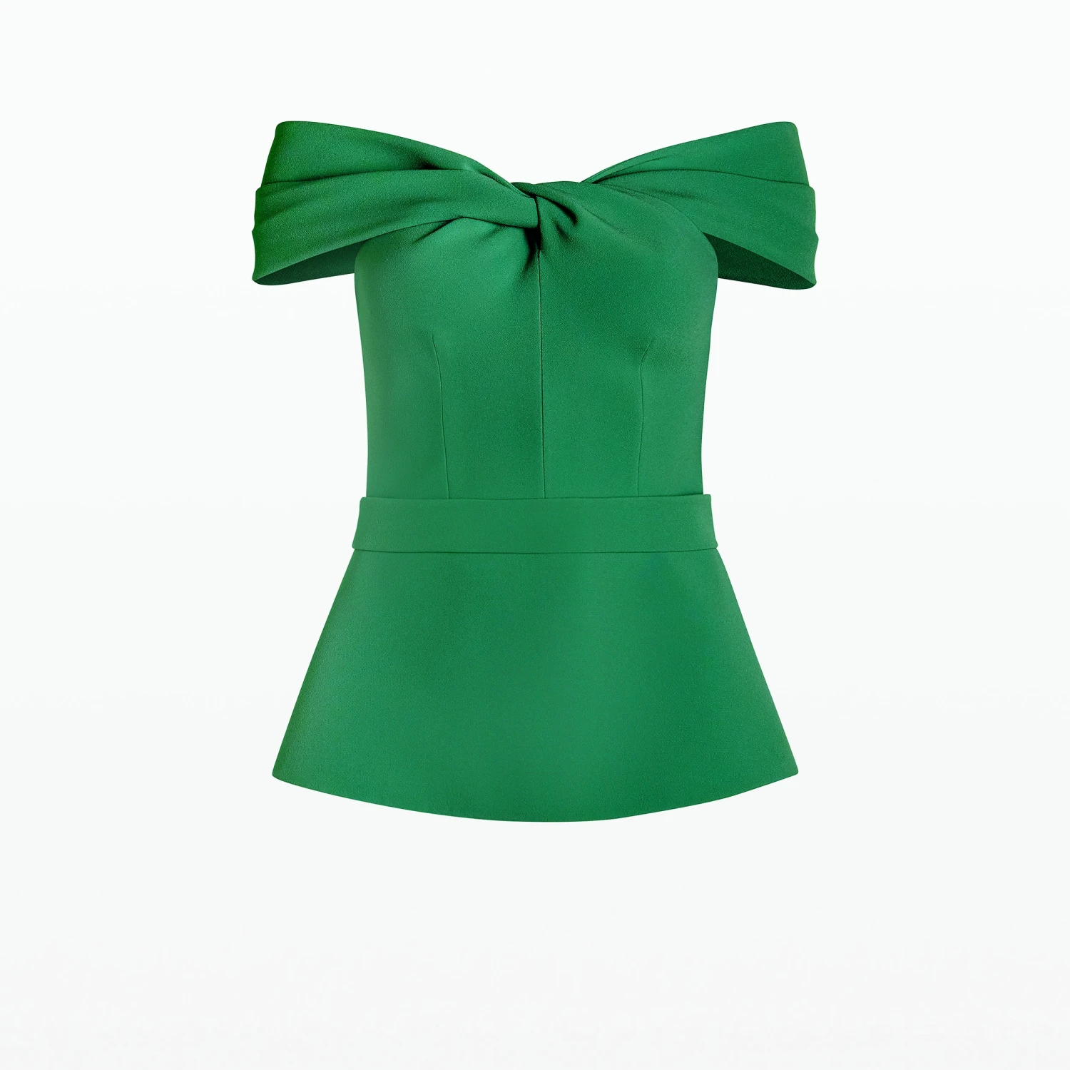 Off the shoulder top with twist detail and peplum in emerald Heavy Crepe.