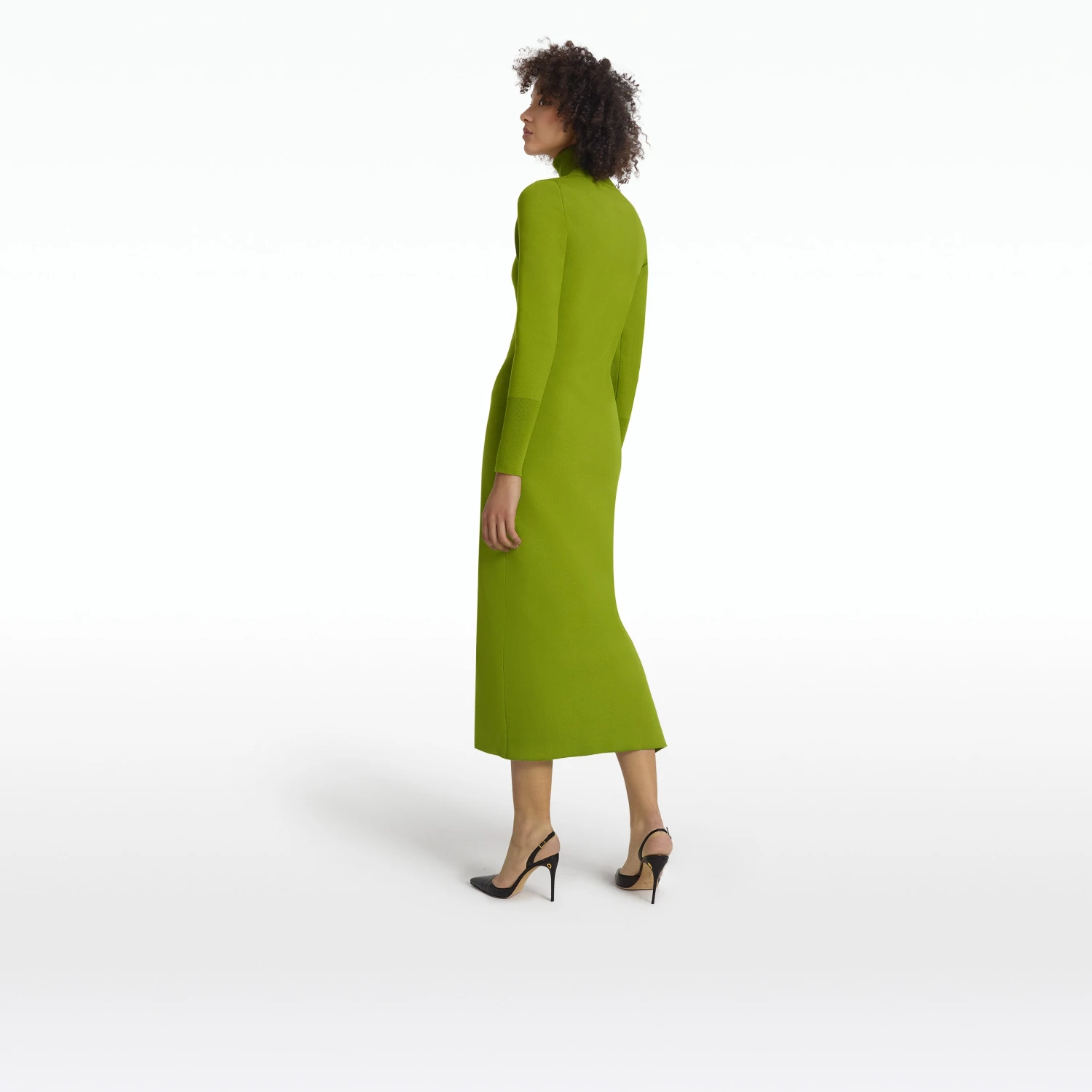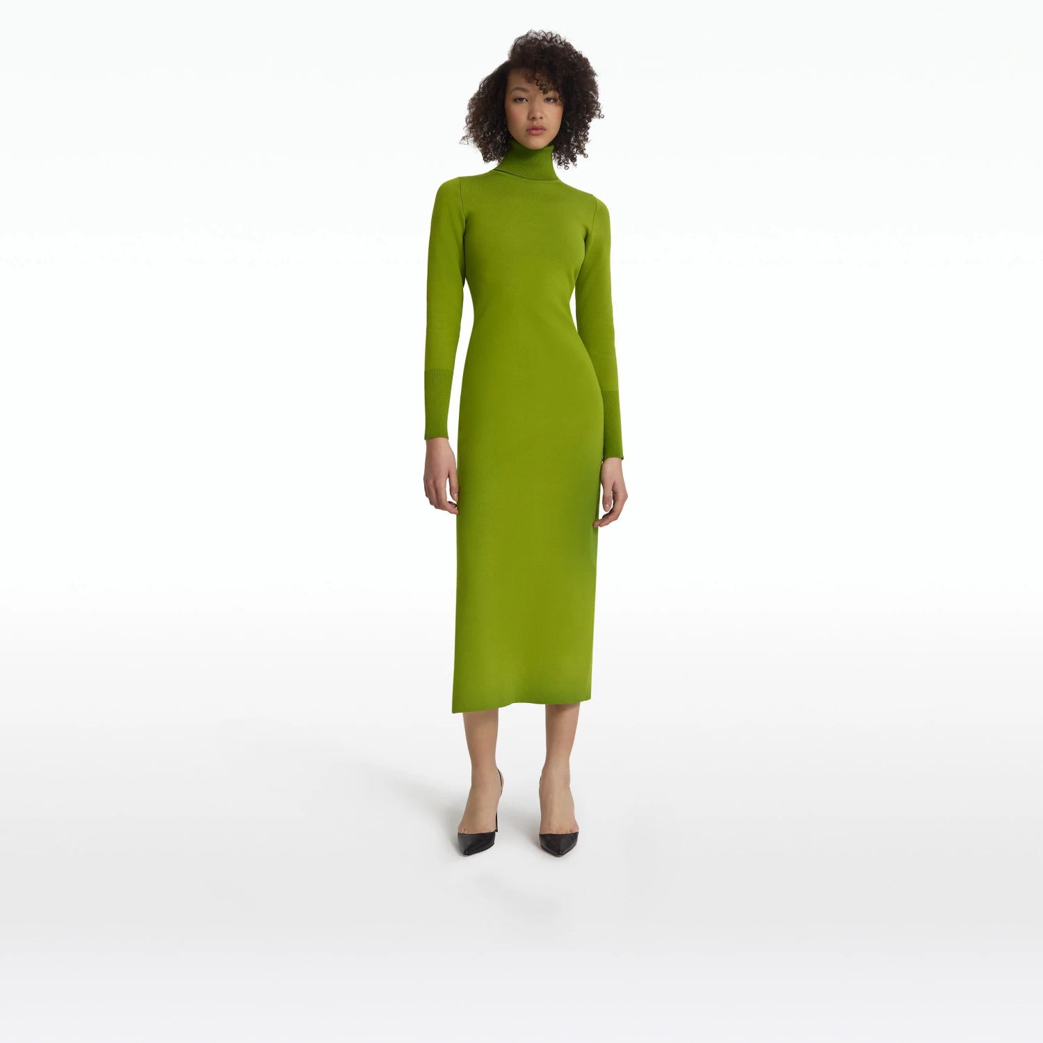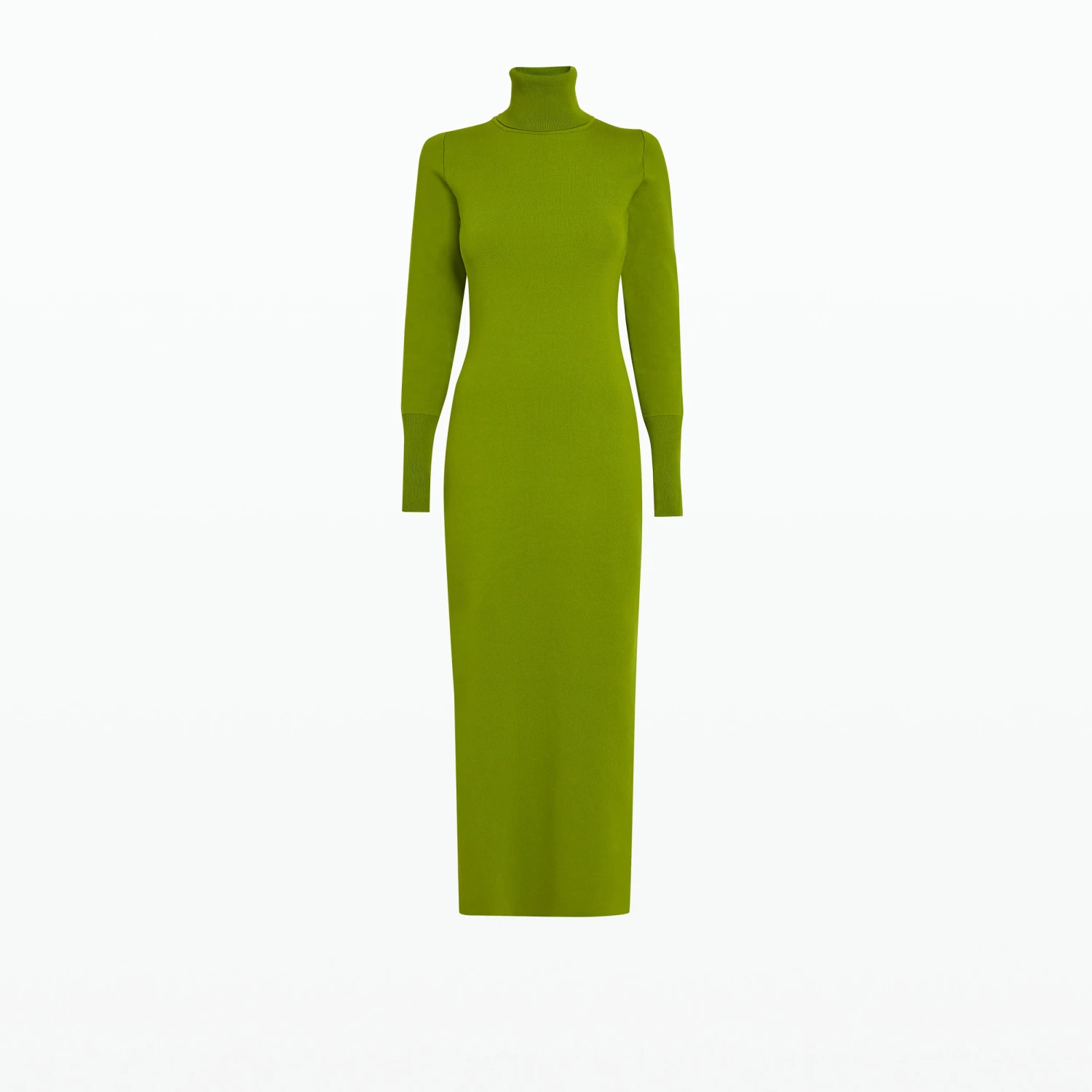 Turtleneck, long sleeved dress with side slit and wide cuff in olive Bodycon Stretch Knit.