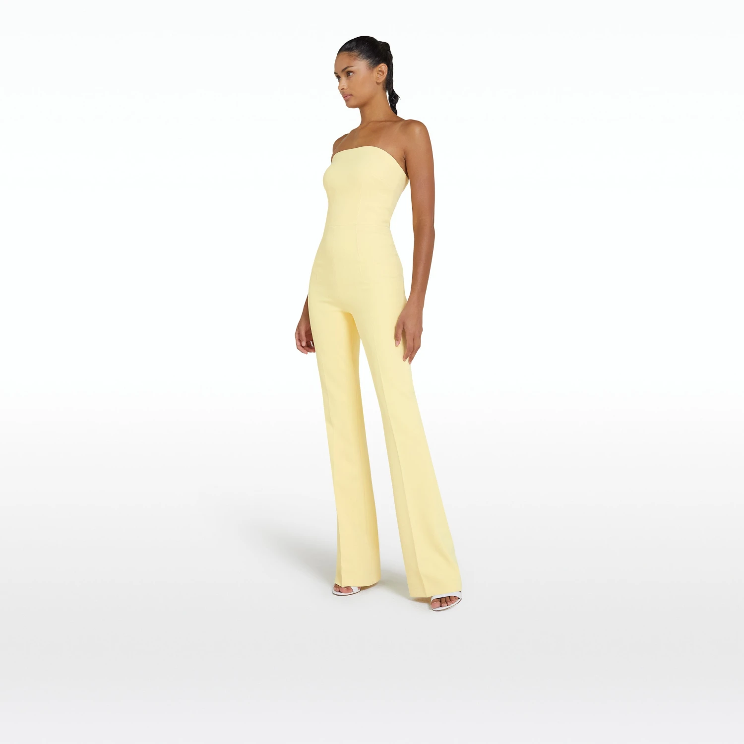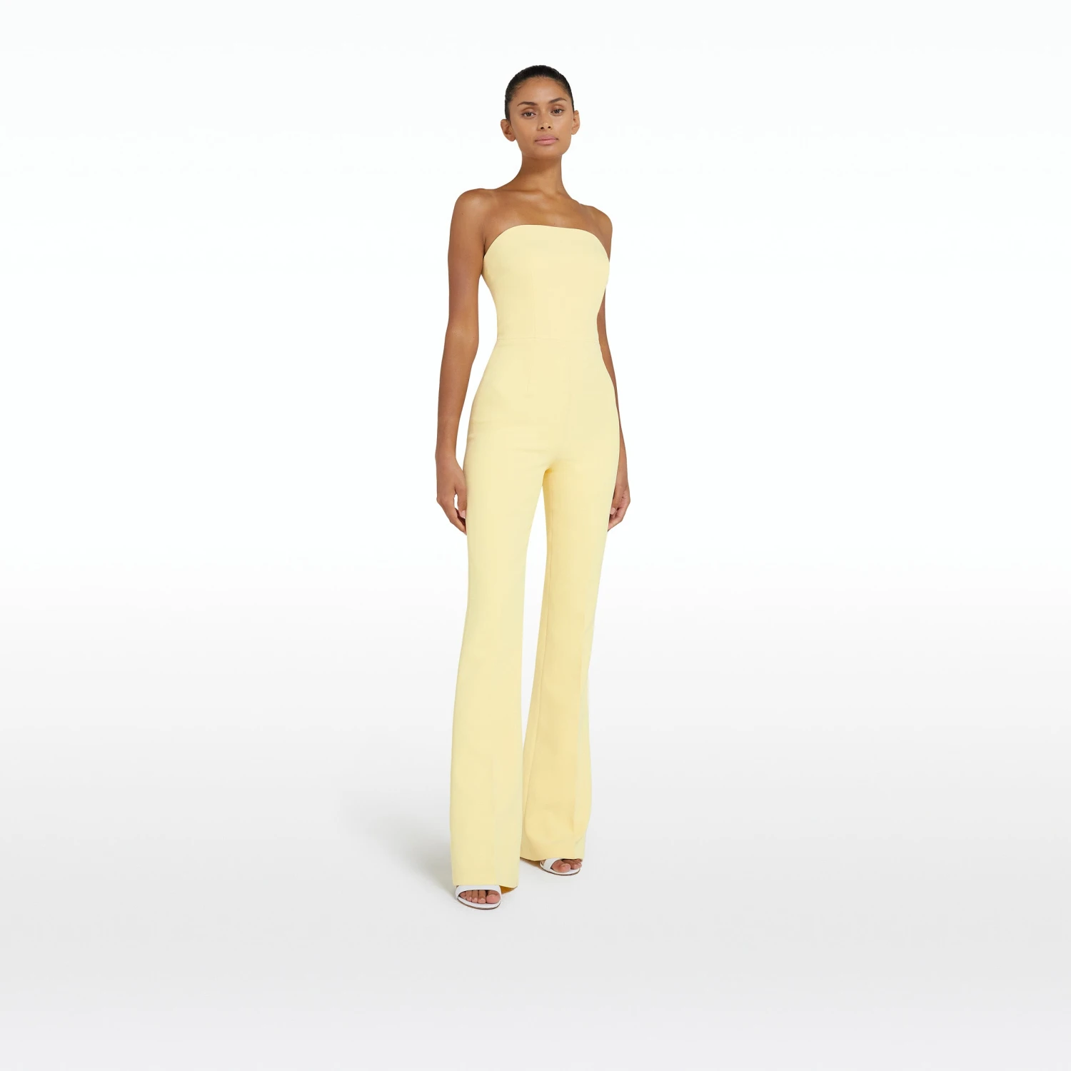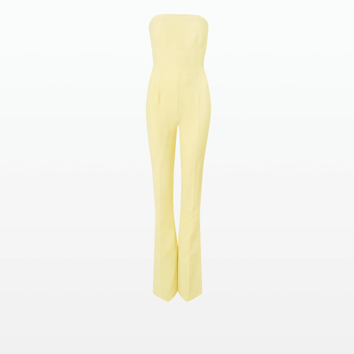 Strapless jumpsuit with semi flared pants in pale primrose.
