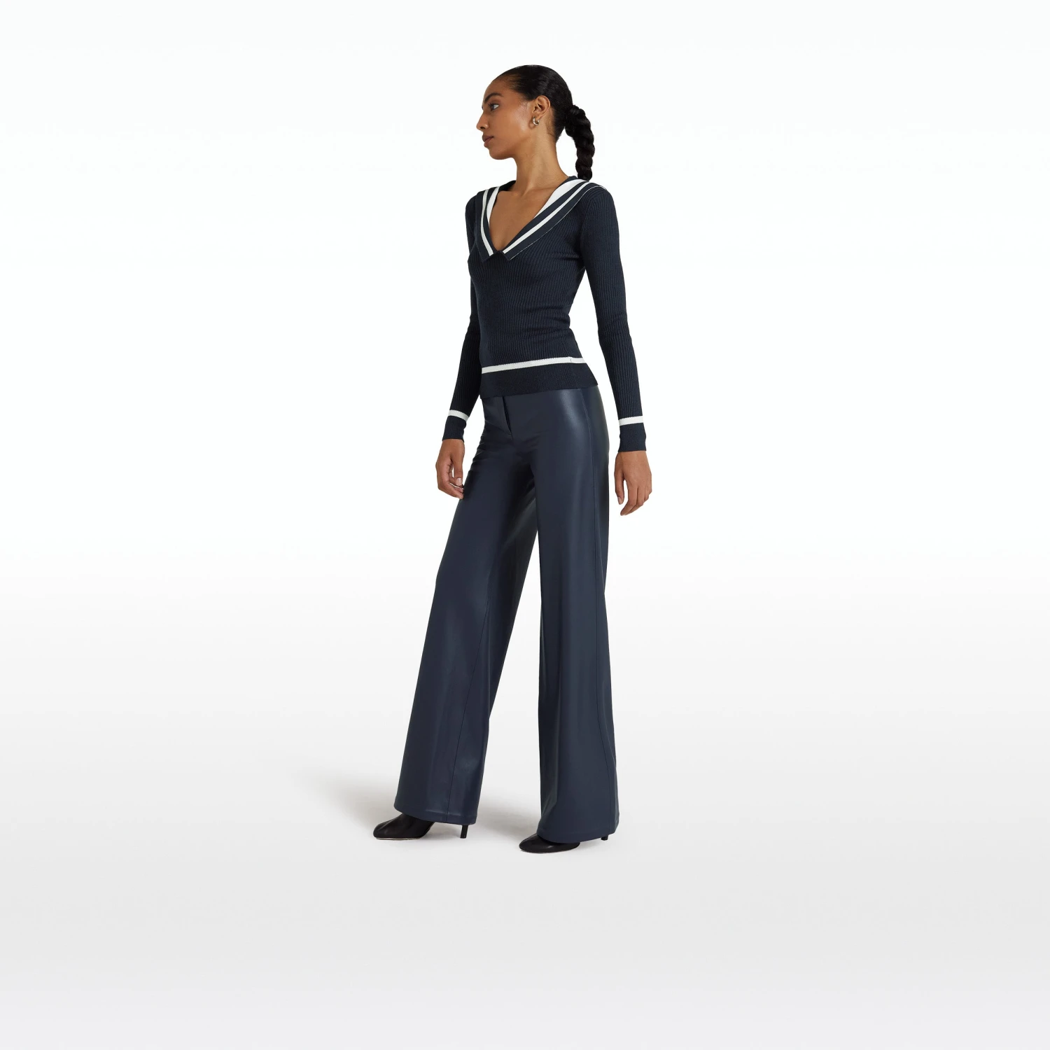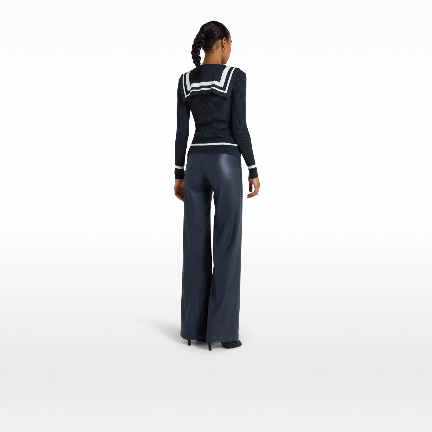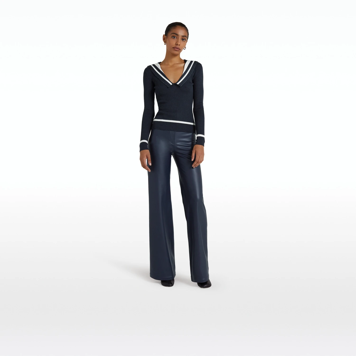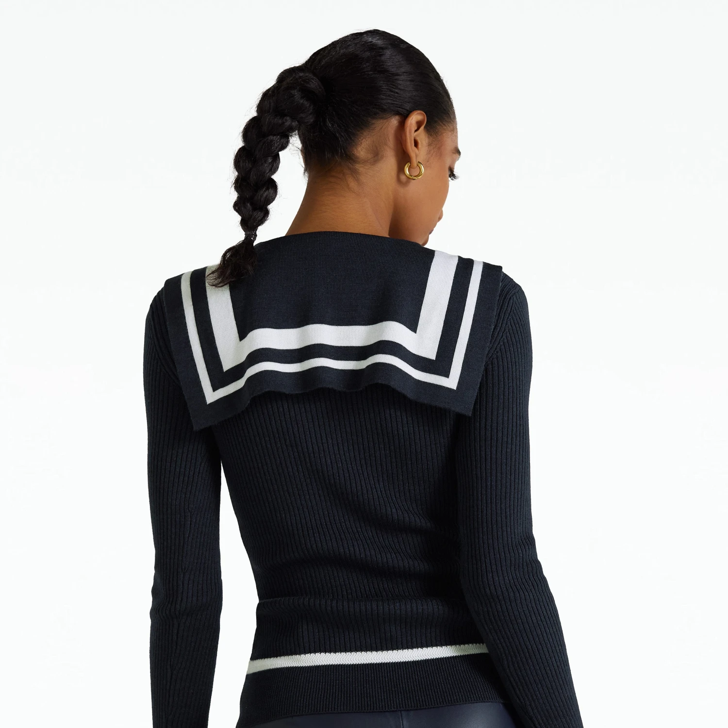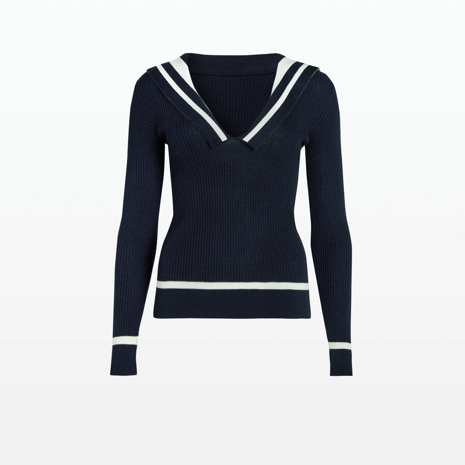 Long sleeved sweater with sailorman collar in navy and ivory.
