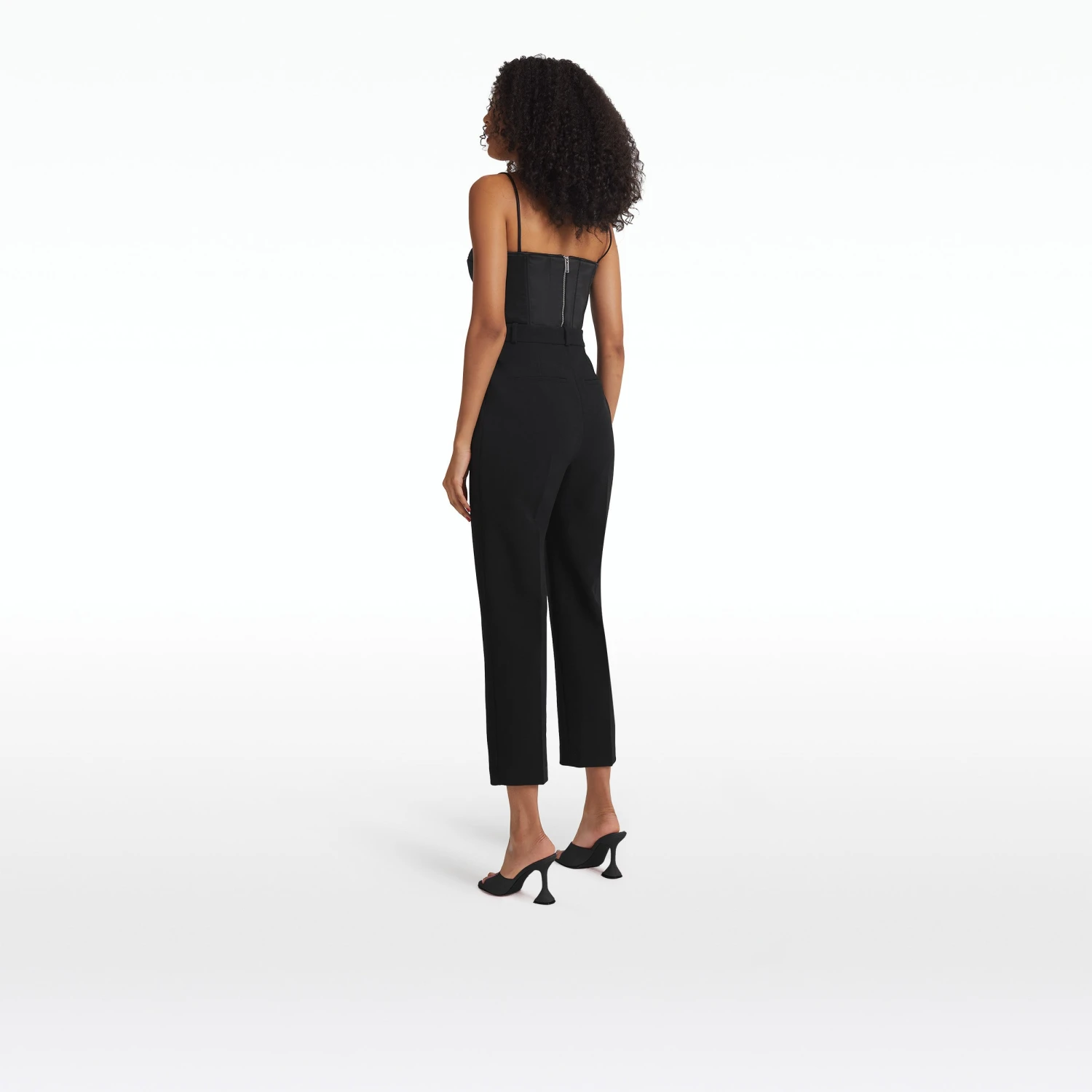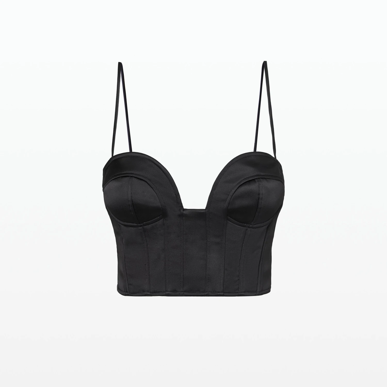 Bustier style crop top with corset details in black Shine Satin Stretch.