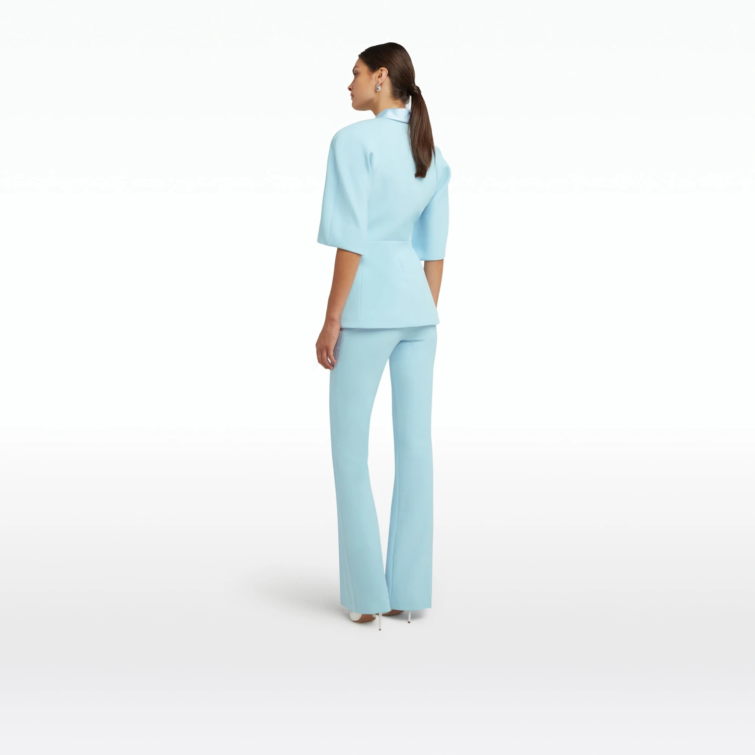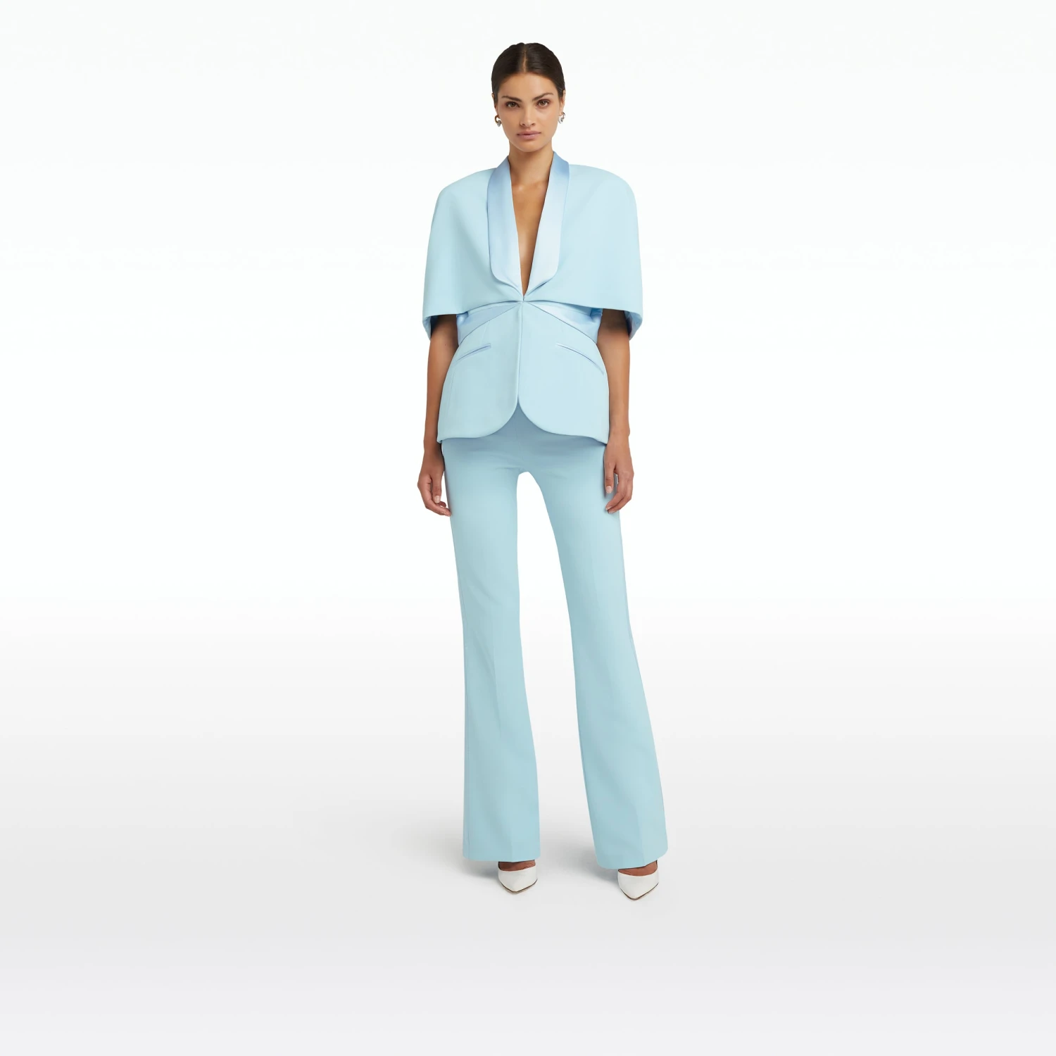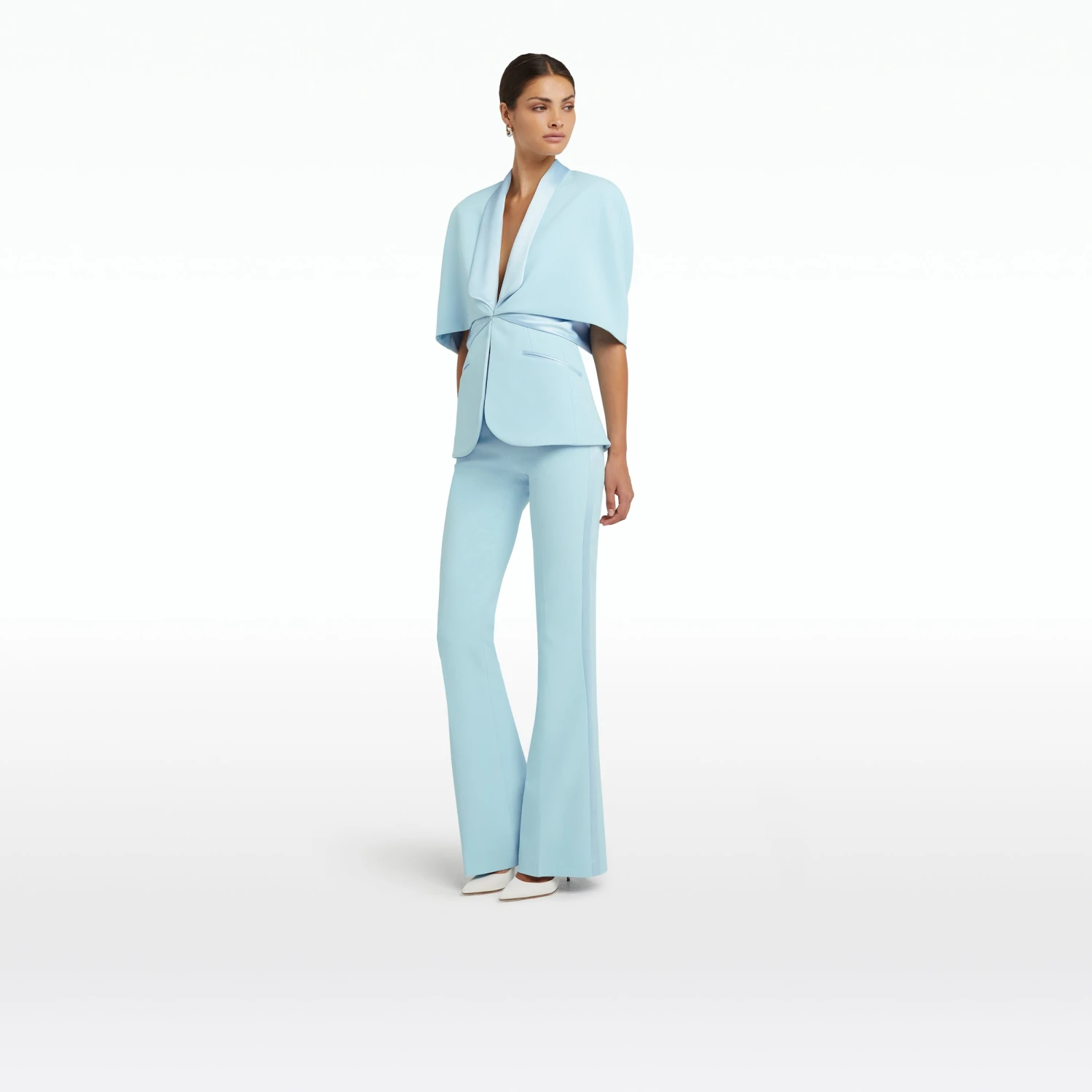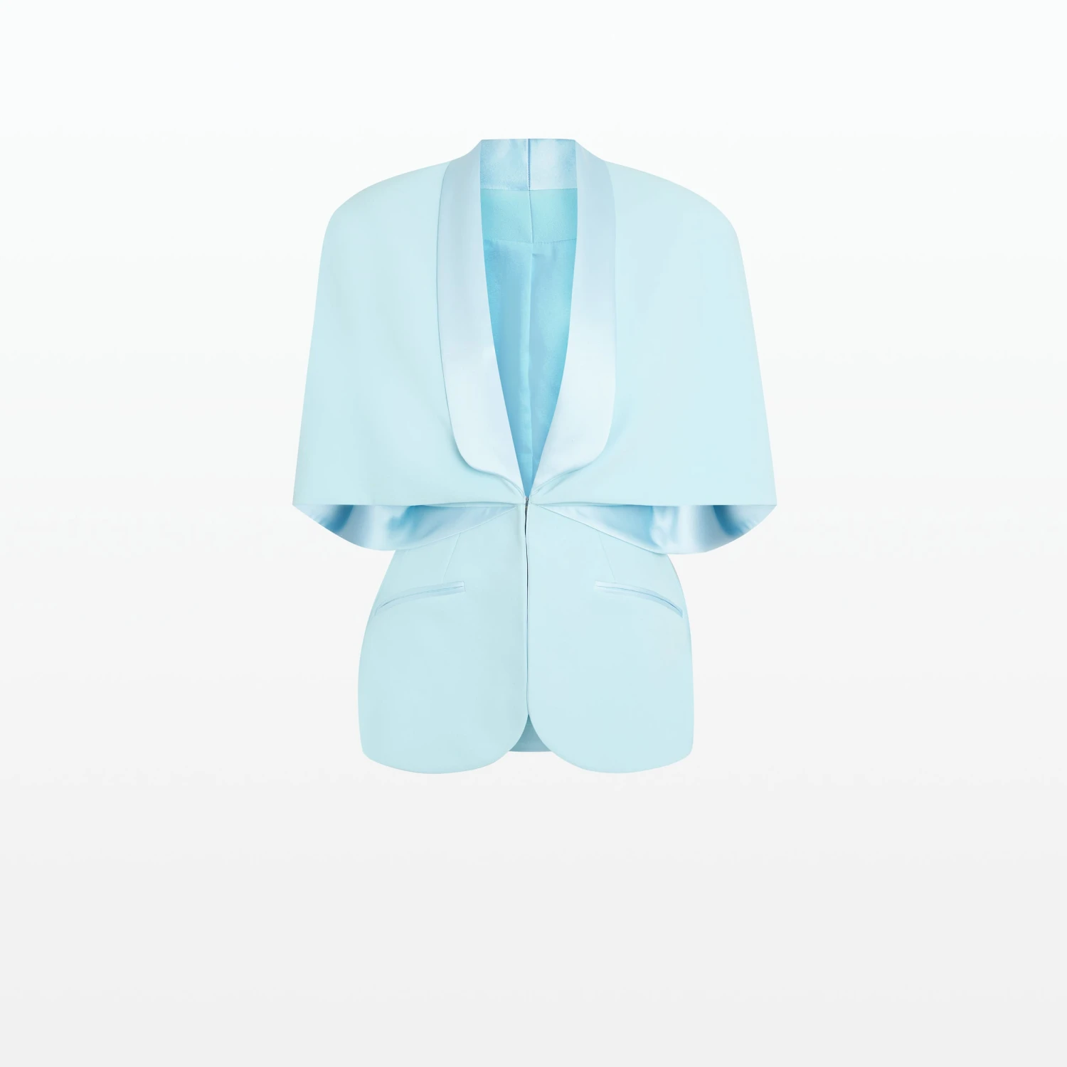 Cocoon sleeve, tailored jacket with tuxedo details. in baby blue Heavy Crepe and Shine Satin Stretch.