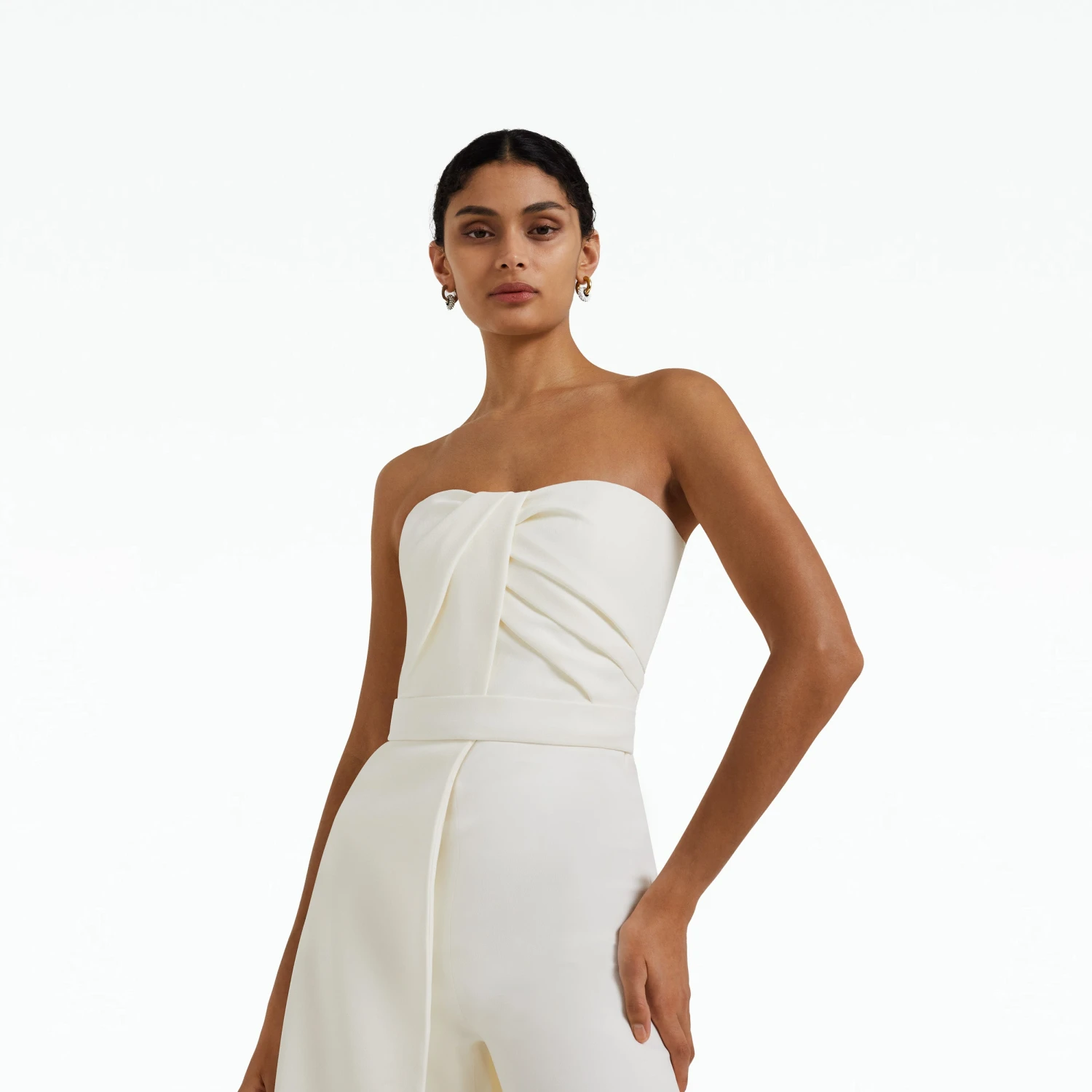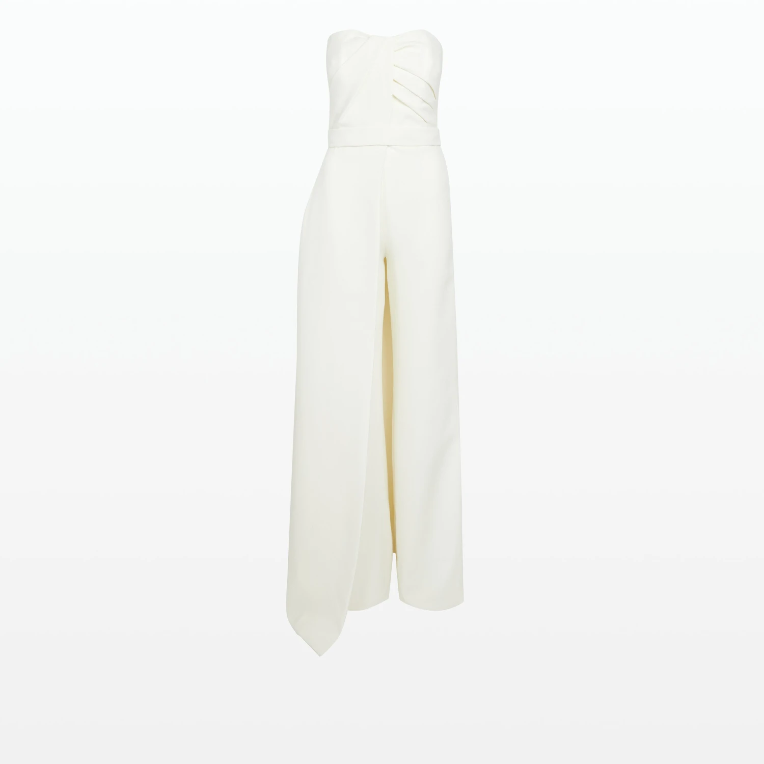 Gently flared strapless jumpsuit in ivory stretch heavy crepe with a draped bustier and an asymmetric overlay detail.